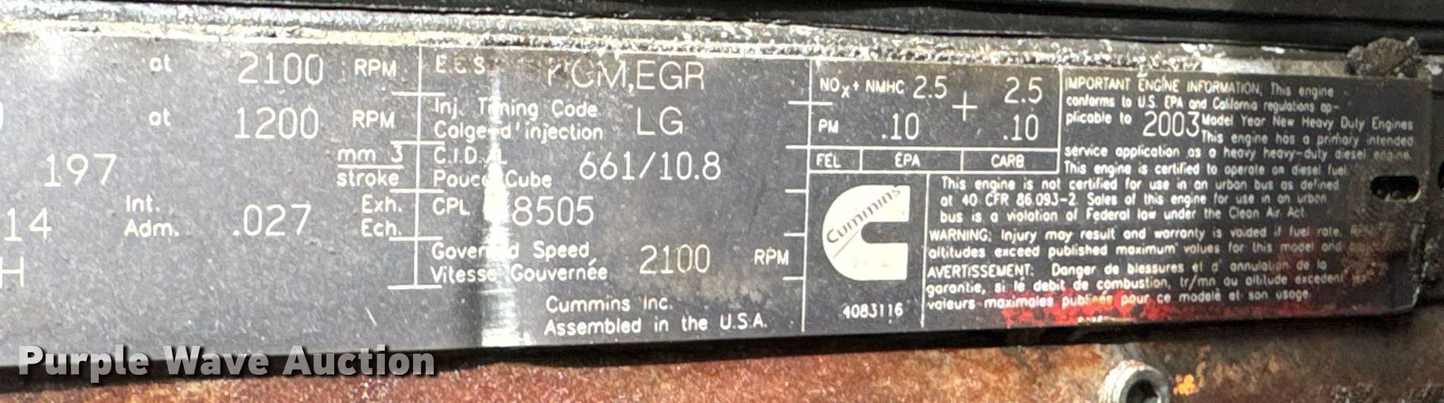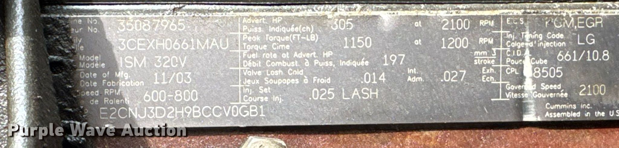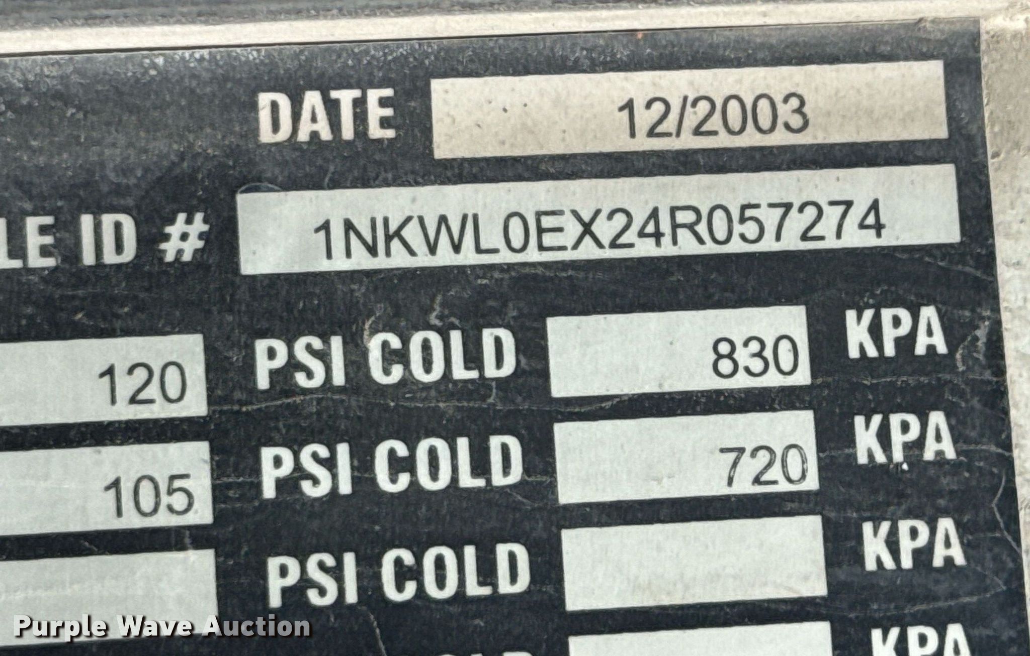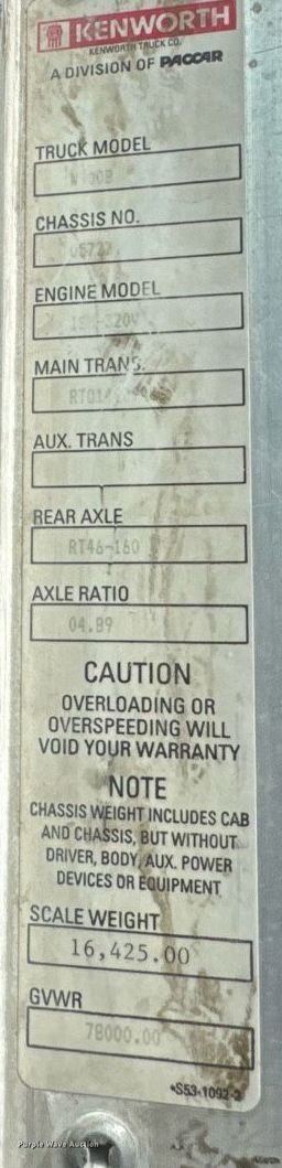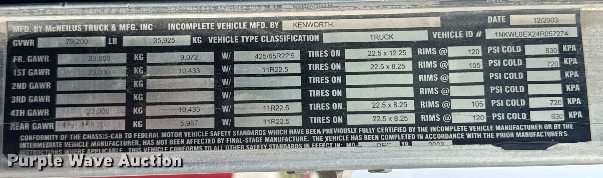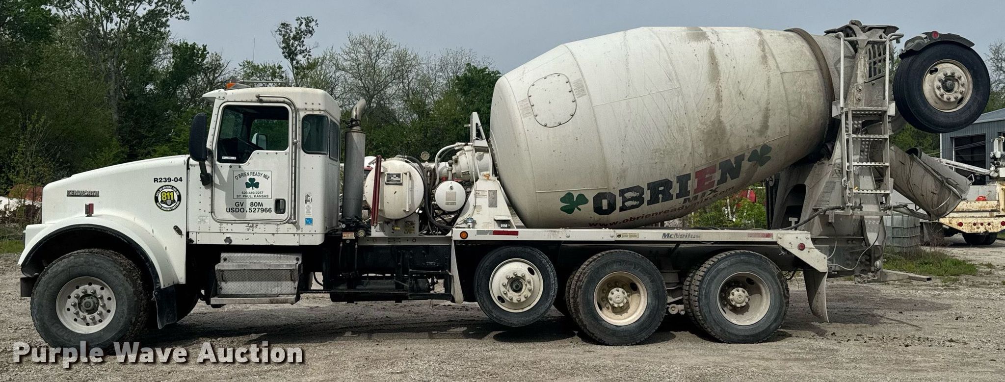 2004 Kenworth W900 ready mix truck. Miles: 102,864 on odometer, Hours: 7,961 on meter, VIN: 1NKWL0EX24R057274. Engine Cummins ISM, Serial: 35087965, Displacement: 10.8L, Cylinders: 6, Fuel type: Diesel, HP: 305. Transmission Eaton Fuller, Manual, Speed: 10. Chassis Axles: 4, Pusher axle, Tag axle, Differential lock: Full, Suspension: Spring, Brakes: Air, PTO. Interior AC, Heat, Heated mirrors, Cruise control. Features Mixer McNeilus, Capacity: 11 cu.yd., Discharge: Rear, In-cab controls, Rear drum controls, Water tank capacity: 150 gallons, Chute Extensions: 3, Chute type: Aluminum.. Tires Front: 425/65R22.5, Rear: 11R22.5, Lift axle: 255/70R22.5. Notes Engine issues. Kansas title. Title distribution may be delayed up to 14 days from verification of funds. O'Brien Rock Company, Inc... Oswego, KS 67356