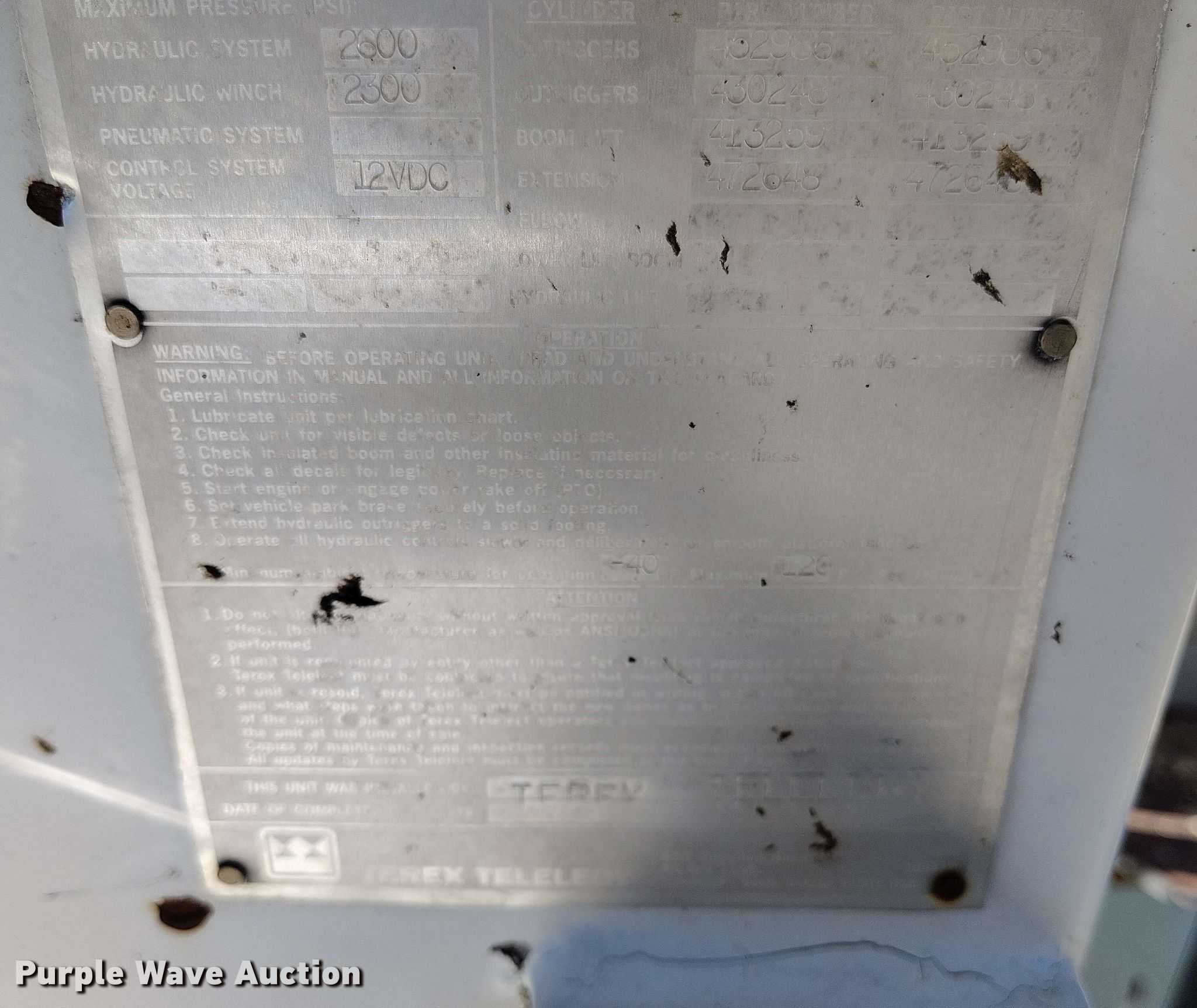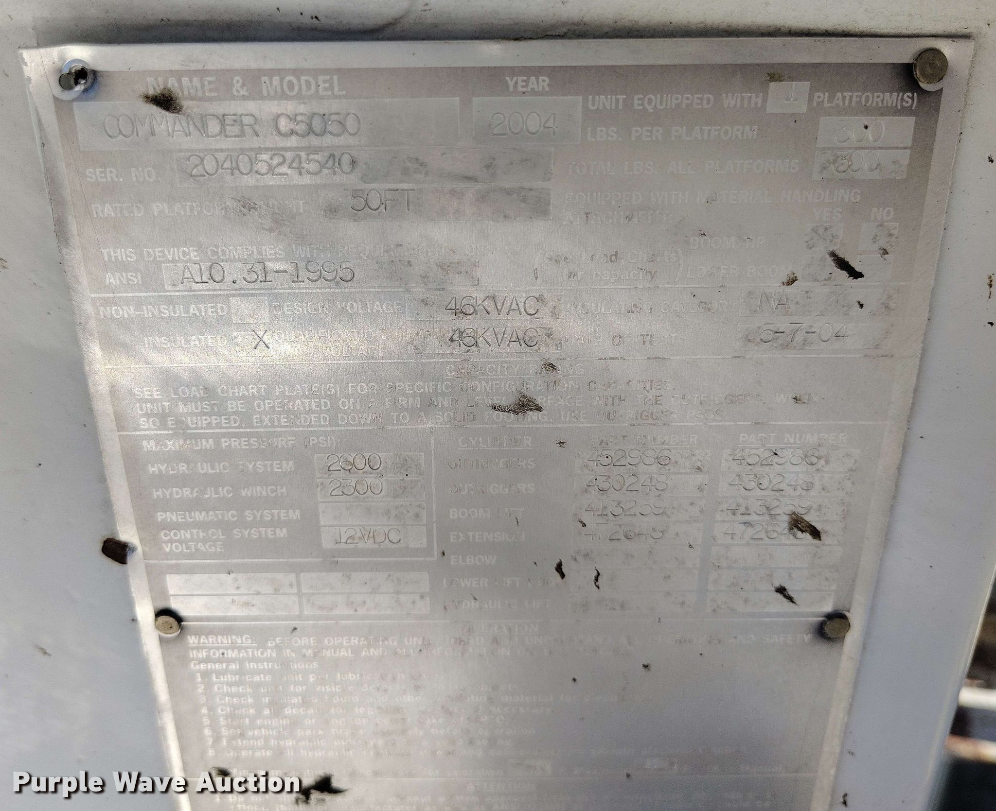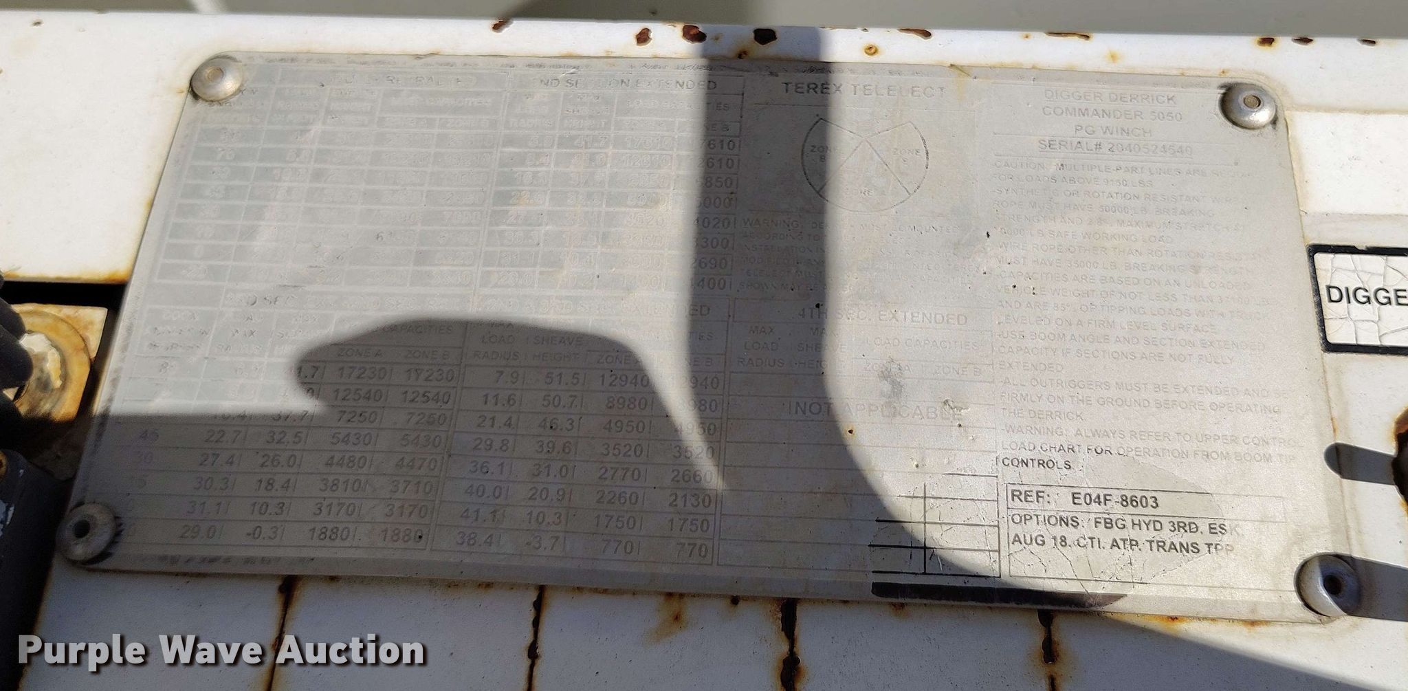 2005 International 7400 digger derrick truck. Miles: 98,135 on odometer, Hours: 9,095 on meter, VIN: 1HTWJAAR65J027329. Engine International DT466, Displacement: 7.6L, Cylinders: 6, Fuel type: Diesel. Transmission Allison, Automatic. Chassis Six wheel drive, Axles: Tandem, Suspension: Spring over walking beam, Brakes: Air, PTO. Interior AC, Heat, Cruise control, Auxiliary controls. Features Bed Terrex, Serial: IN09580, 20' L x 94" W, Boom 2004 Terex Commander 5050, Serial: 2040524540, Mast height: 50', Maximum lift capacity: 25,810 lbs, Boom type: Articulating, Insulated, Telescopic, Man basket, Boom controls Platform/ basket, Material handler, Pole guide, Auger Diameter: 20".. Tires Size: 11R22.5. Notes Windshield chipped or cracked. Colorado title. Title distribution may be delayed up to 30 days from verification of funds. JLH Electrical LLC. La Junta, CO 81050