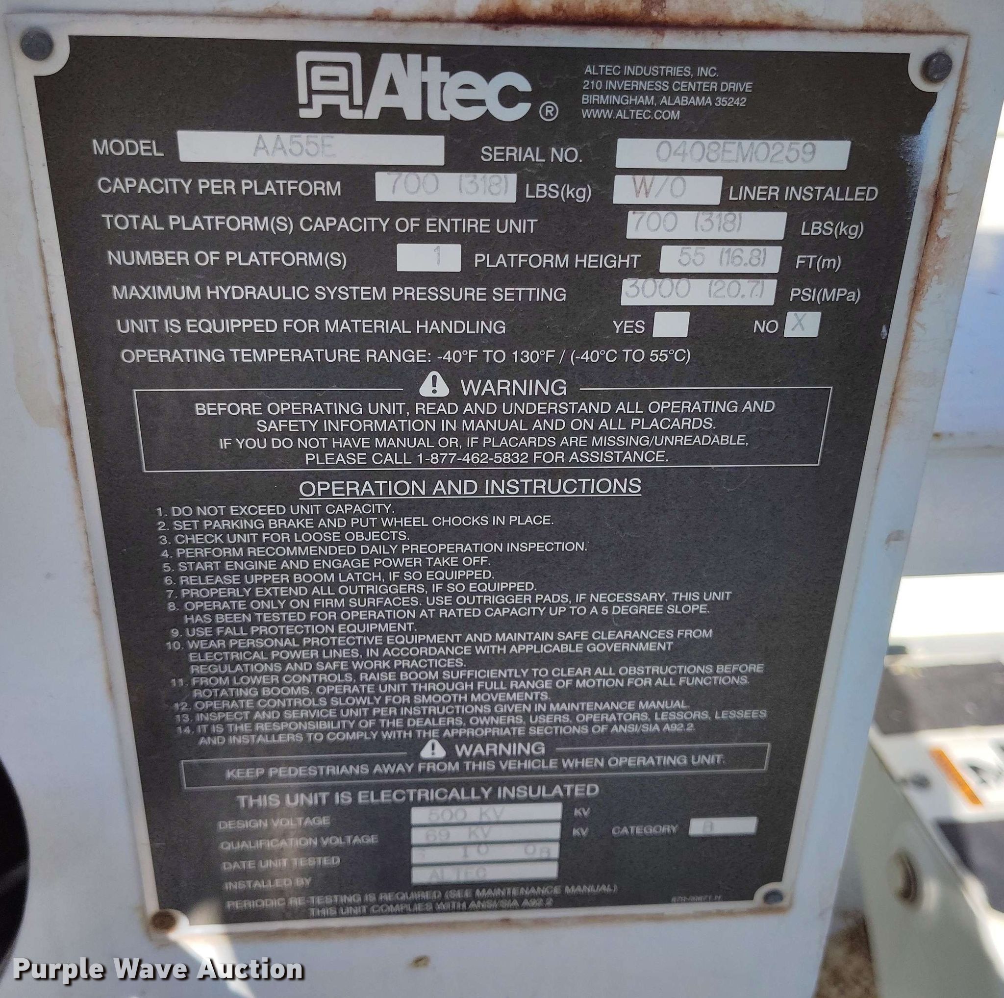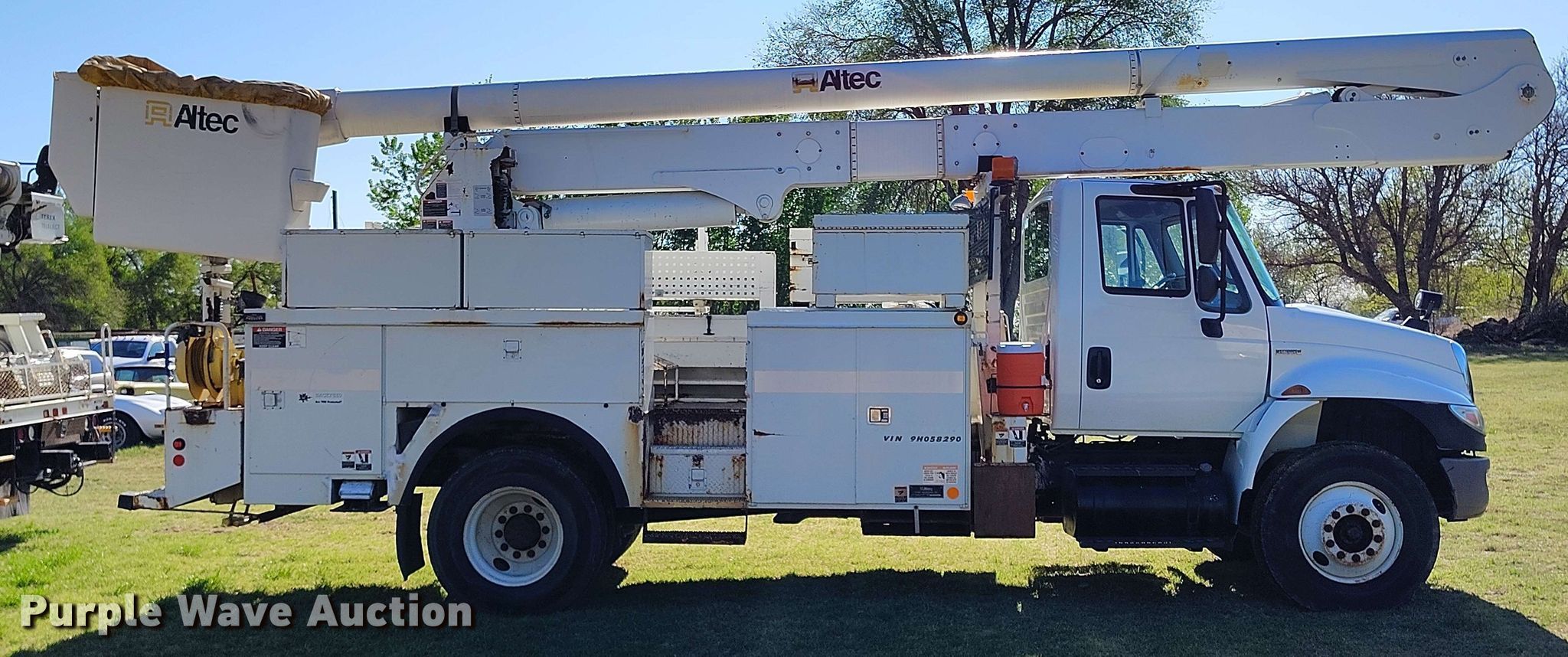 2009 International 4400 bucket truck. Miles: 98,467 on odometer, Hours: 9,940 on meter, VIN: 1HTMKAAN89H058290. Engine International MaxxForce GDT260, Displacement: 7.6L, Cylinders: 6, Fuel type: Diesel, Engine brake. Transmission Allison, Automatic. Chassis Axles: Single, Suspension: Spring, Brakes: Air, PTO, GVWR: 33,000 lbs. Interior AC, Heat, Cruise control. Features Bed Altec, 18' L x 94" W, Boom 2008 Altec AA55E, Serial: 0408EM0259, Mast height: 55', Maximum lift capacity: 700 lbs, Boom type: Articulating, Insulated, Man basket, Boom controls Ground, Platform/ basket.. Tires Size: 11R22.5. Notes Windshield chipped or cracked. Colorado title. Title distribution may be delayed up to 14 days from verification of funds. JLH Electrical LLC. La Junta, CO 81050