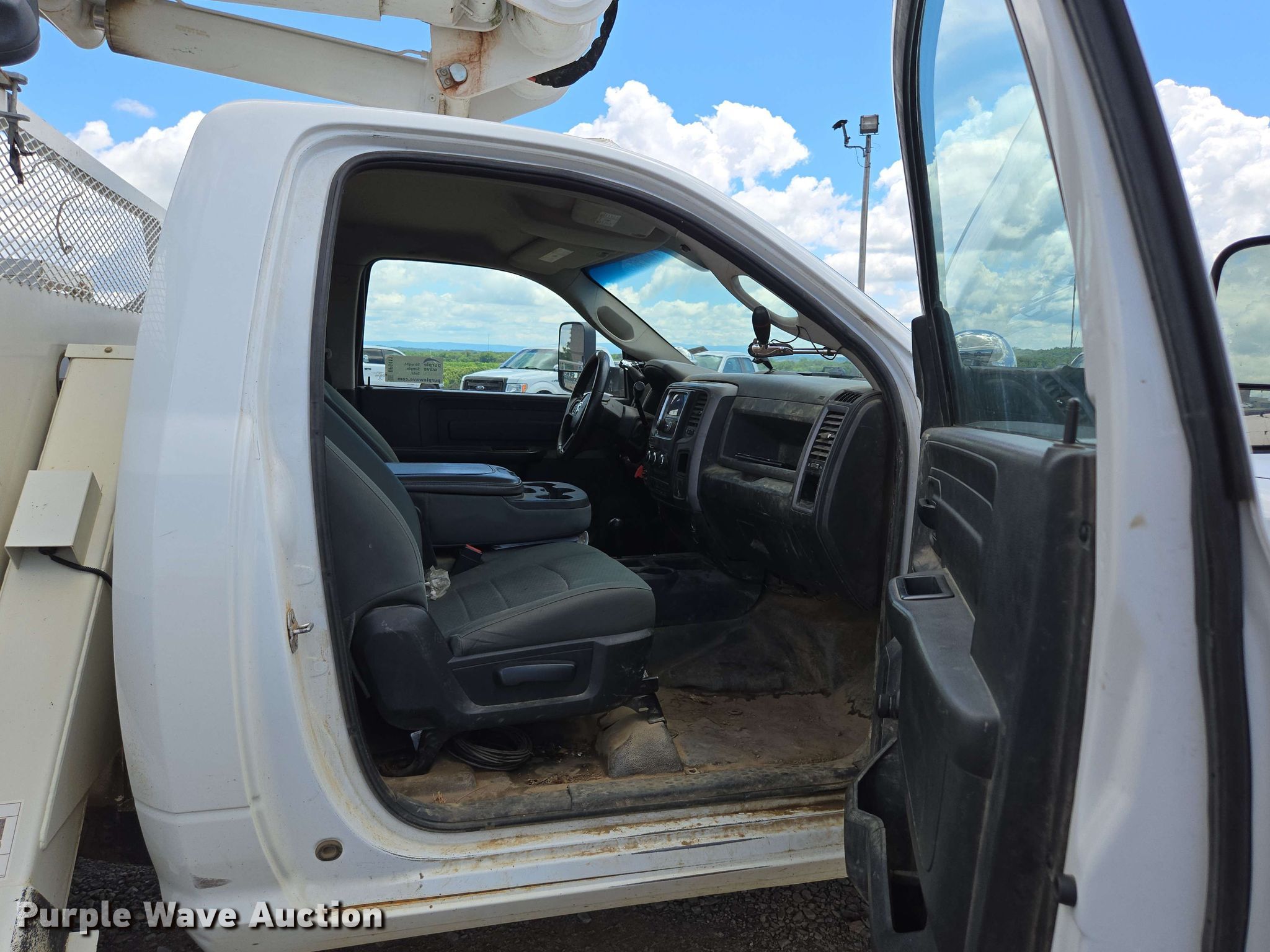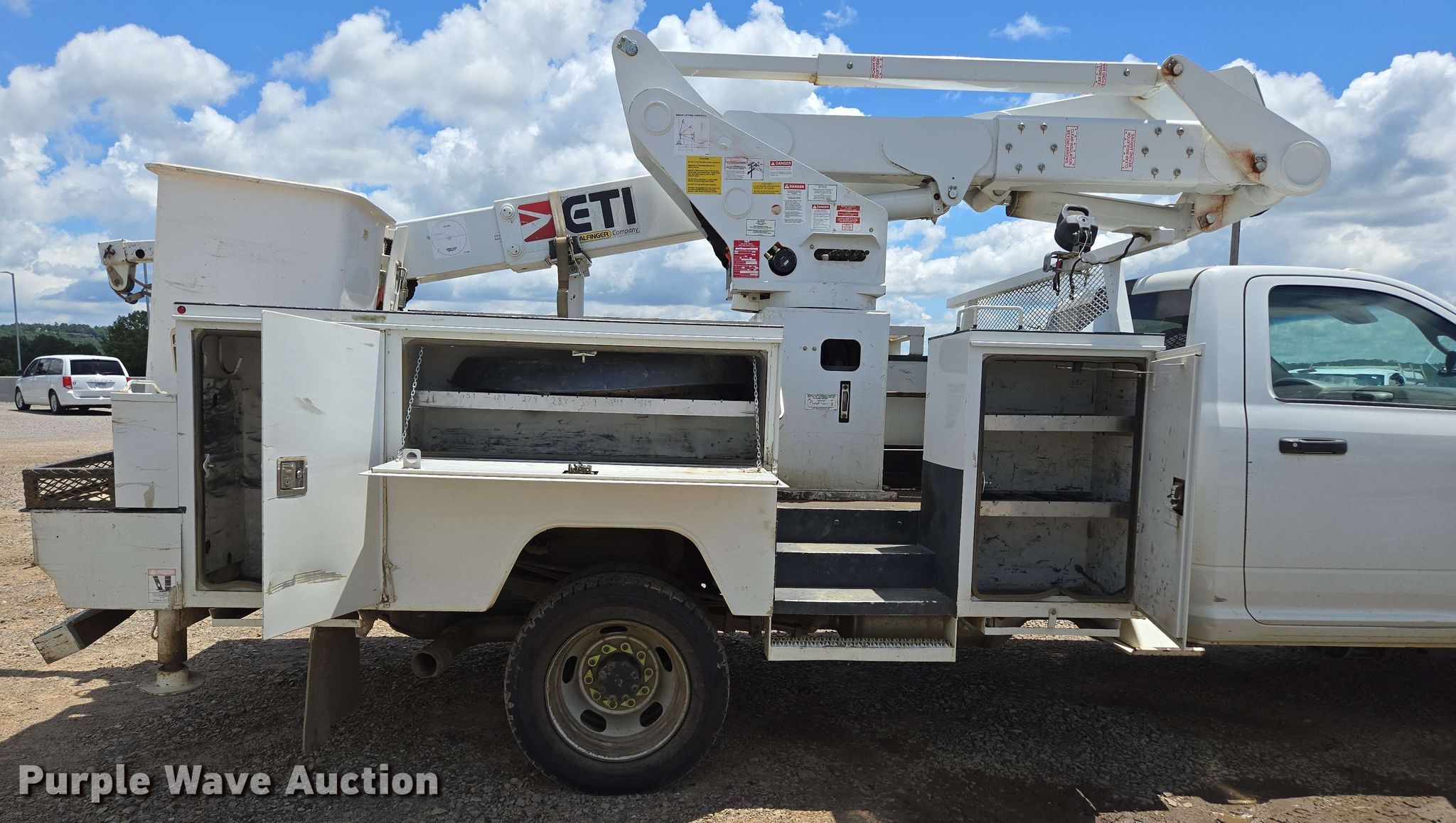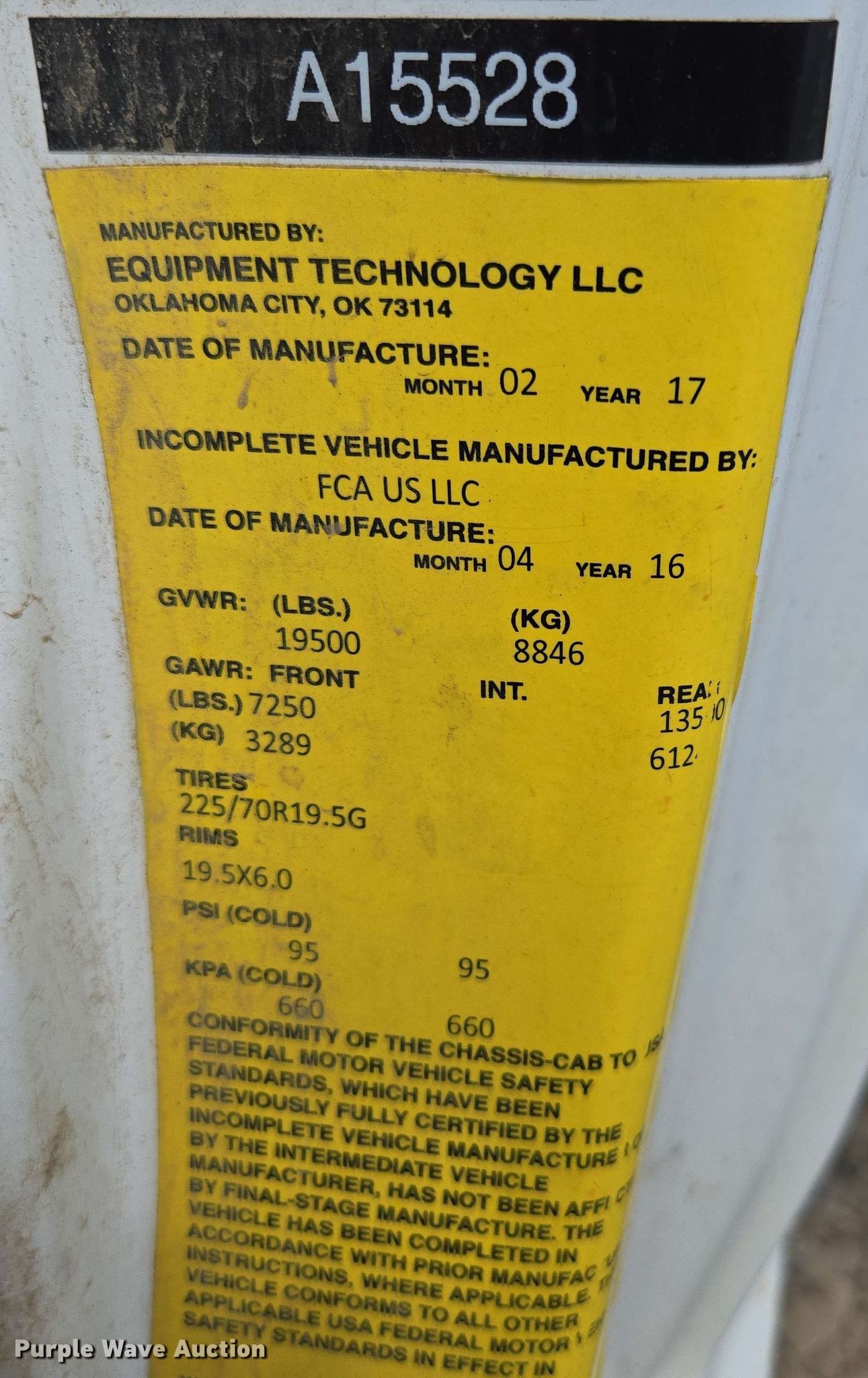 2016 Dodge Ram 5500HD bucket truck. Miles: 139,842 on odometer, Hours: 4,296 on meter, VIN: 3C7WRNBLXGG317703, Unit #: 56. Engine Cummins, Displacement: 6.7L, Cylinders: 6, Fuel type: Diesel. Transmission Automatic. Chassis Four wheel drive, Axles: Single, Suspension: Spring, Brakes: Hydraulic, PTO, GVWR: 19,500 lbs. Interior AC, Heat, Cruise control, Auxiliary controls. Features Bed ETI AB132DD96B20Q, Serial: 19981, 13' 4" L x 95.5" W, Boom 2017 ETI ETCMH37IH, Serial: 0117CM713664, Boom length: 15' 2", Maximum lift capacity: 400 lbs, Maximum lift height: 37', Boom type: Insulated, Man basket, Boom controls Ground, Platform/ basket, Warn 16.5 TI Winch. Tires Size: 225/70R19.5. Notes Dash warning indicator: Check engine, Airbag, Spot mirrors broken. Arkansas title. Title distribution may be delayed up to 14 days from verification of funds. Arkansas Valley Electric Cooperative Corp.. Ozark, AR 72949
