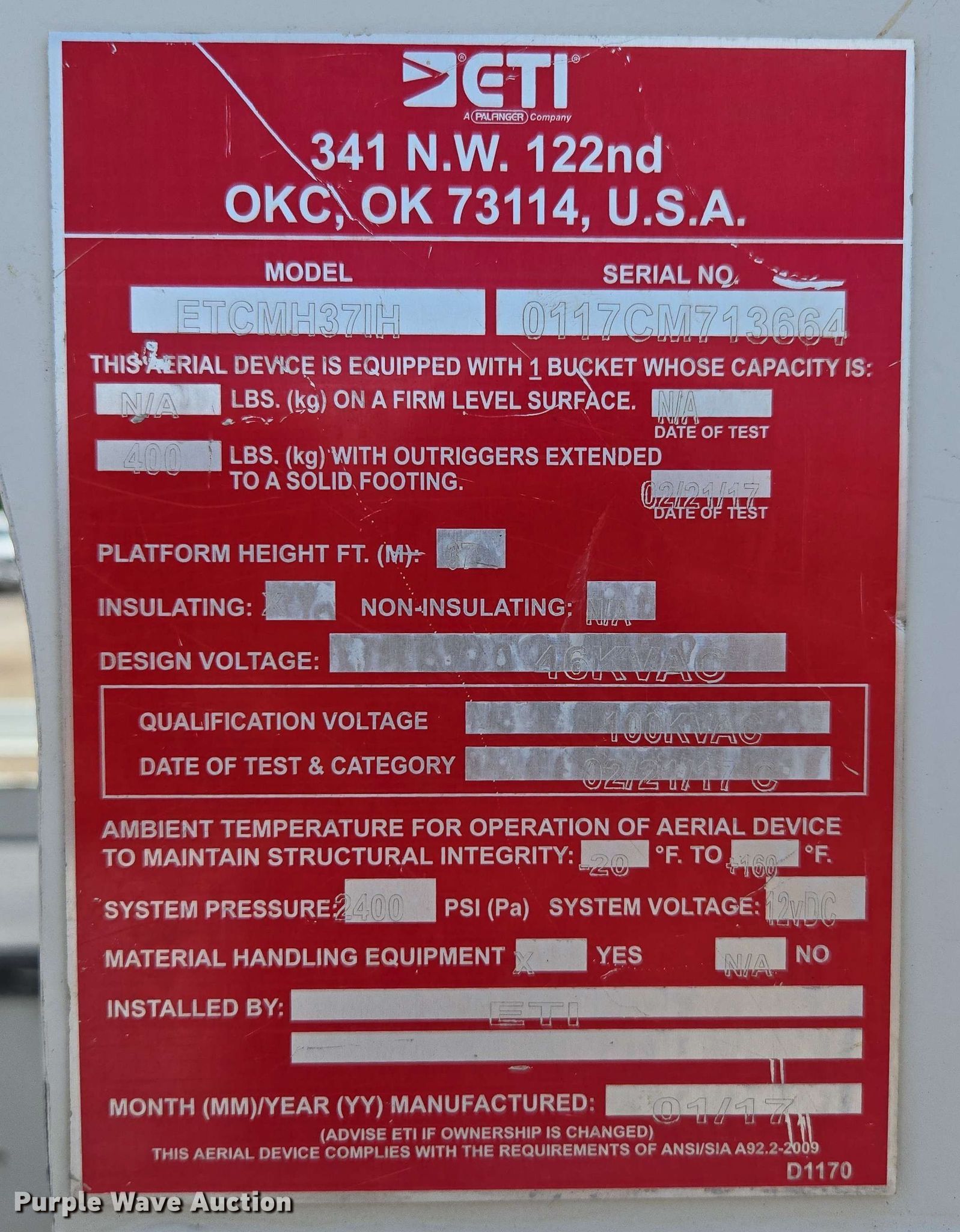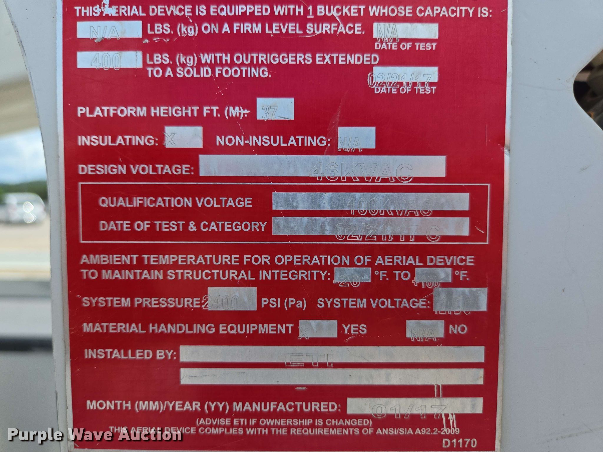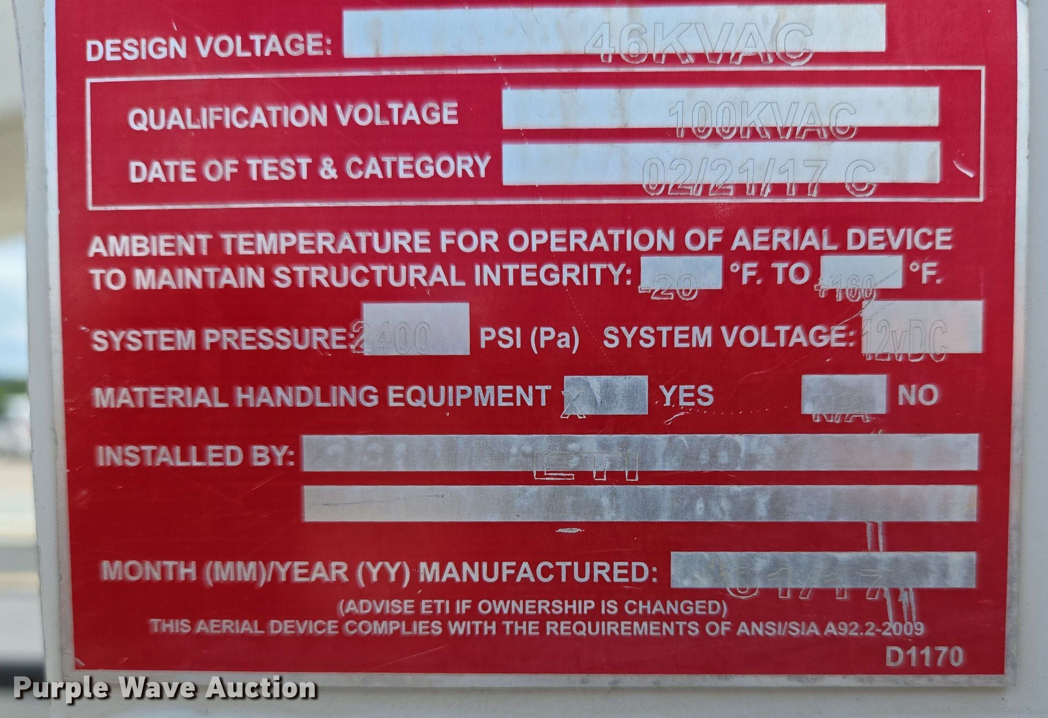 2016 Dodge Ram 5500HD bucket truck. Miles: 139,842 on odometer, Hours: 4,296 on meter, VIN: 3C7WRNBLXGG317703, Unit #: 56. Engine Cummins, Displacement: 6.7L, Cylinders: 6, Fuel type: Diesel. Transmission Automatic. Chassis Four wheel drive, Axles: Single, Suspension: Spring, Brakes: Hydraulic, PTO, GVWR: 19,500 lbs. Interior AC, Heat, Cruise control, Auxiliary controls. Features Bed ETI AB132DD96B20Q, Serial: 19981, 13' 4" L x 95.5" W, Boom 2017 ETI ETCMH37IH, Serial: 0117CM713664, Boom length: 15' 2", Maximum lift capacity: 400 lbs, Maximum lift height: 37', Boom type: Insulated, Man basket, Boom controls Ground, Platform/ basket, Warn 16.5 TI Winch. Tires Size: 225/70R19.5. Notes Dash warning indicator: Check engine, Airbag, Spot mirrors broken. Arkansas title. Title distribution may be delayed up to 14 days from verification of funds. Arkansas Valley Electric Cooperative Corp.. Ozark, AR 72949