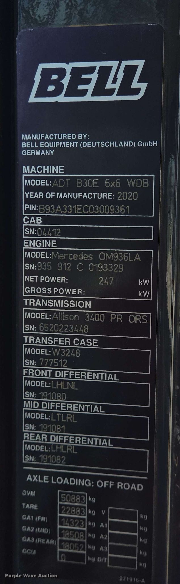 2020 Bell B30E articulated haul truck. Hours: 2,652 on meter, Serial: B93A331EC03009361, Unit #: BT9361. Engine Mercedes-Benz OM936LA, Serial: 935912C0193329, Displacement: 7.7L, Cylinders: 6, Fuel type: Diesel, kW: 274. Transmission Automatic. Chassis Six wheel drive. Interior AC, Heat, Backup camera. Features Dump bed, On-board scales. Tires Size: 30/65R25. Lease Return. Houston, TX 77064