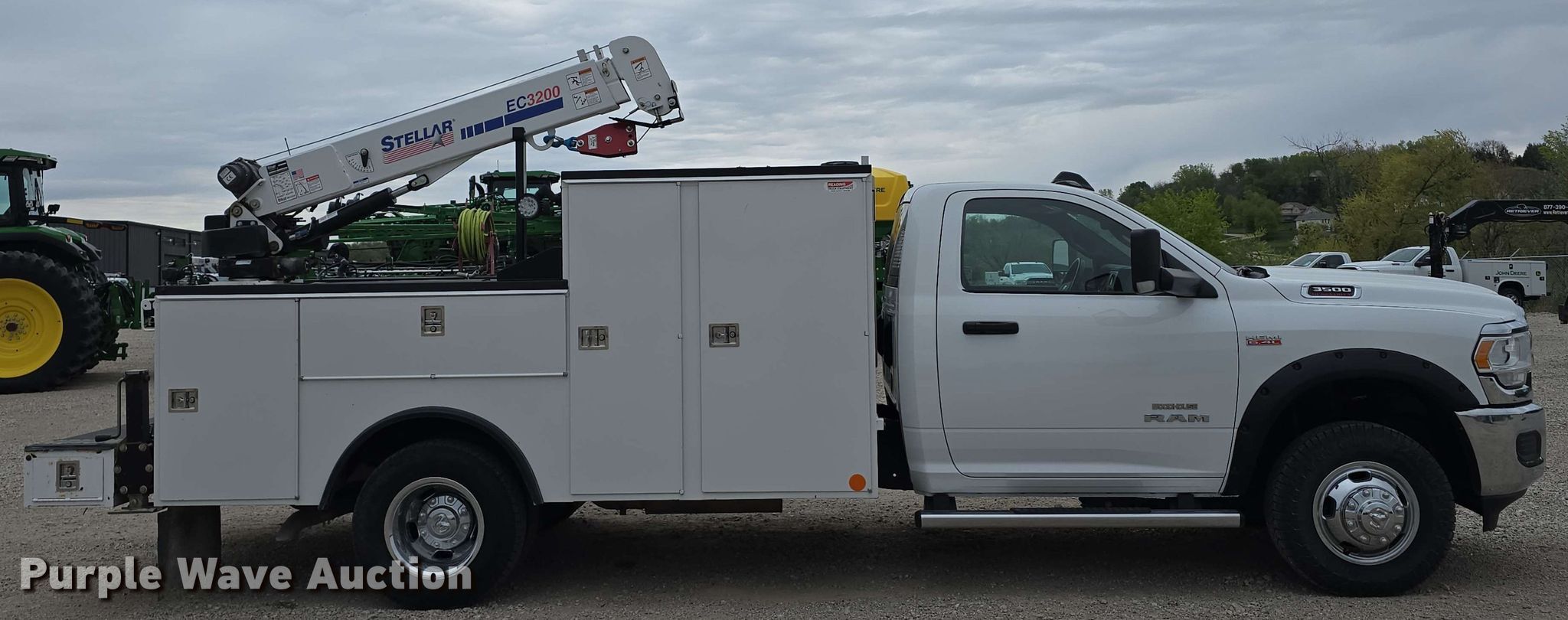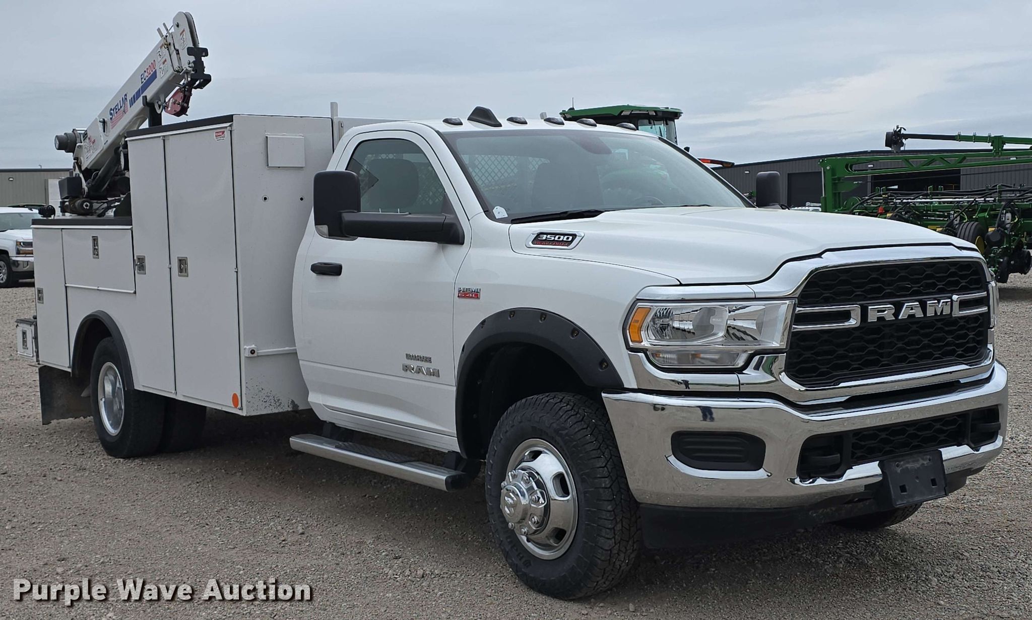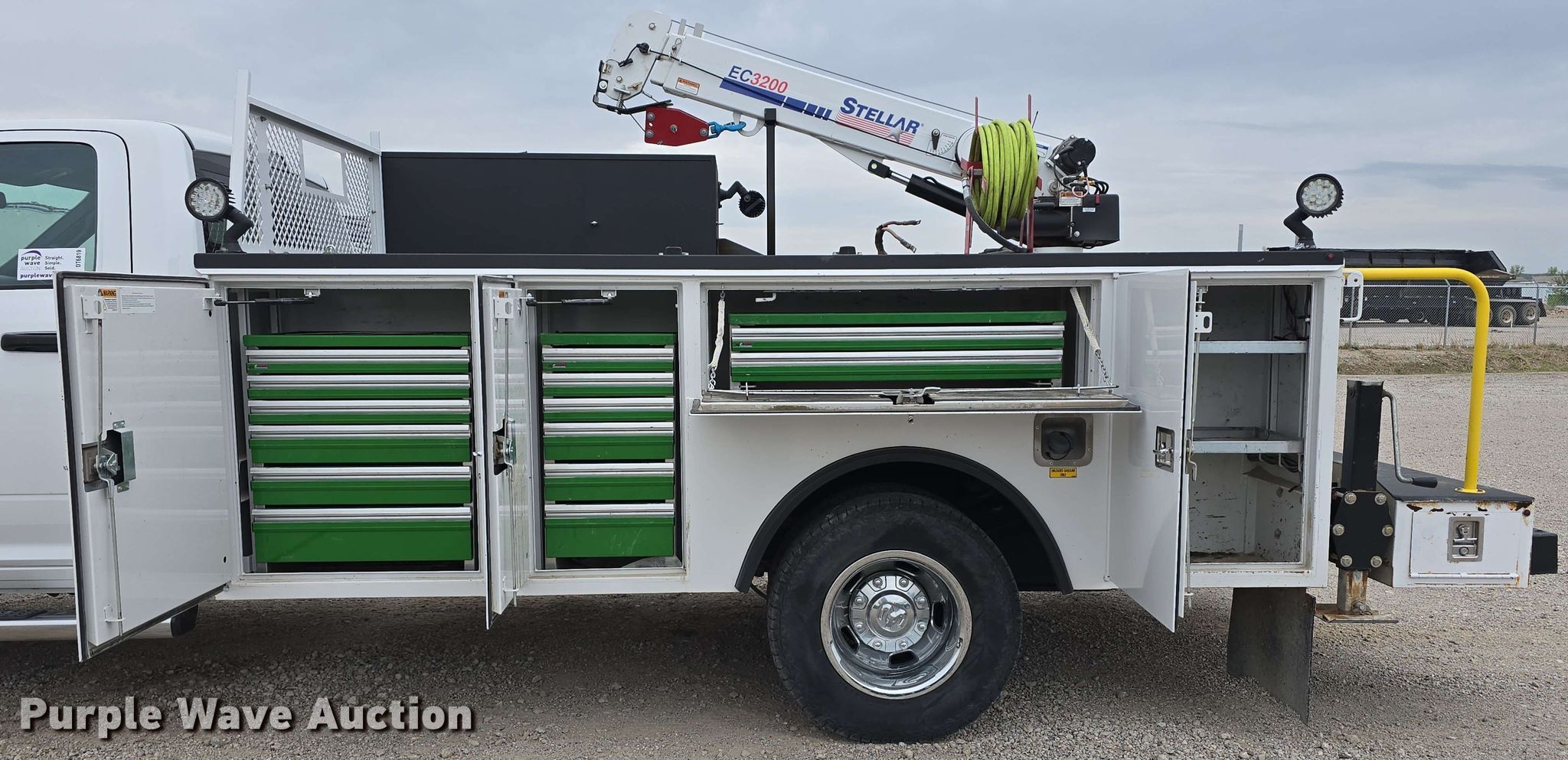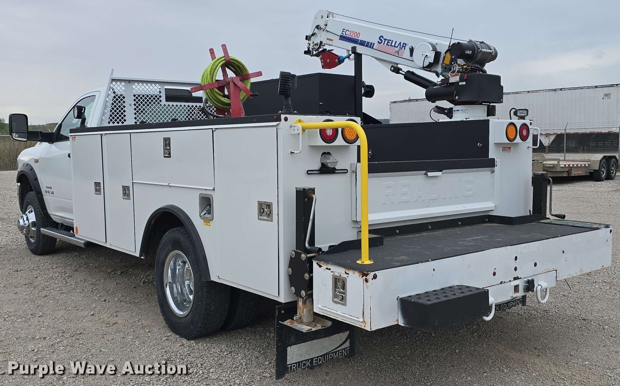 2021 Dodge Ram 3500 utility bed pickup truck. Miles: 51,767 on odometer, Hours: 1,623 on meter, VIN: 3C7WRTBJ0MG572133. Engine Displacement: 6.4L V8 OHV, Cylinders: 8, Fuel type: Gas. Transmission Automatic. Chassis Four wheel drive, Axles: Single, Suspension: Spring, Brakes: Hydraulic, GVWR: 13,500 lbs, Wheelbase: 168". Interior AC, Heat, Heated mirrors, Power windows, Power locks, Cruise control, Backup camera, Auxiliary controls, Brake controller. Features Bed Reading, 11' L x 94" W, Torch bottle rack, Crane Stellar EC3200, Maximum boom length: 15' Maximum lift capacity: 3,200 lbs.. Tires Size: LT235/80R17. Notes Dash warning indicator: Check engine. Iowa title. Title has a lien that will be released following the close of the auction. Title distribution may be delayed up to 60 days from verification of funds. AVE-PLP LLC. Council Bluffs, IA 51503