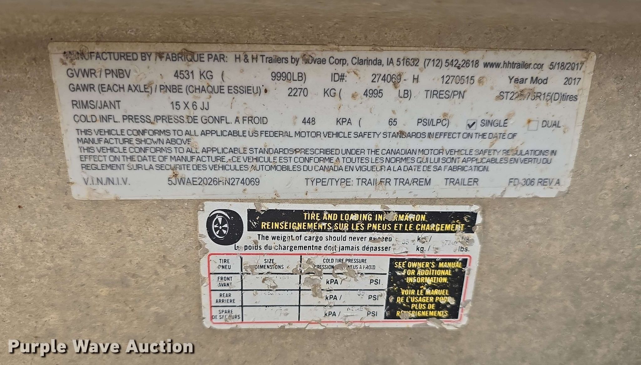 2017 H & H Trailers Speed Loader EX tilt deck utility trailer. VIN: 5JWAE2026HN274069. Dimensions Overall: 25' L x 102" W, Deck: 20' L x 82" W. Features Deck type: Wood, Winch. Chassis Ball hitch: 2 5/16", Landing gear: Single, Suspension: Spring, Brakes: Electric, Axles: Tandem, GVWR: 9,990 lbs, GAWR: 4,995 lbs. Tires Aluminum wheels, Size: ST225/75R15. Iowa title. Title distribution may be delayed up to 14 days from verification of funds. AVE-PLP LLC. Council Bluffs, IA 51503