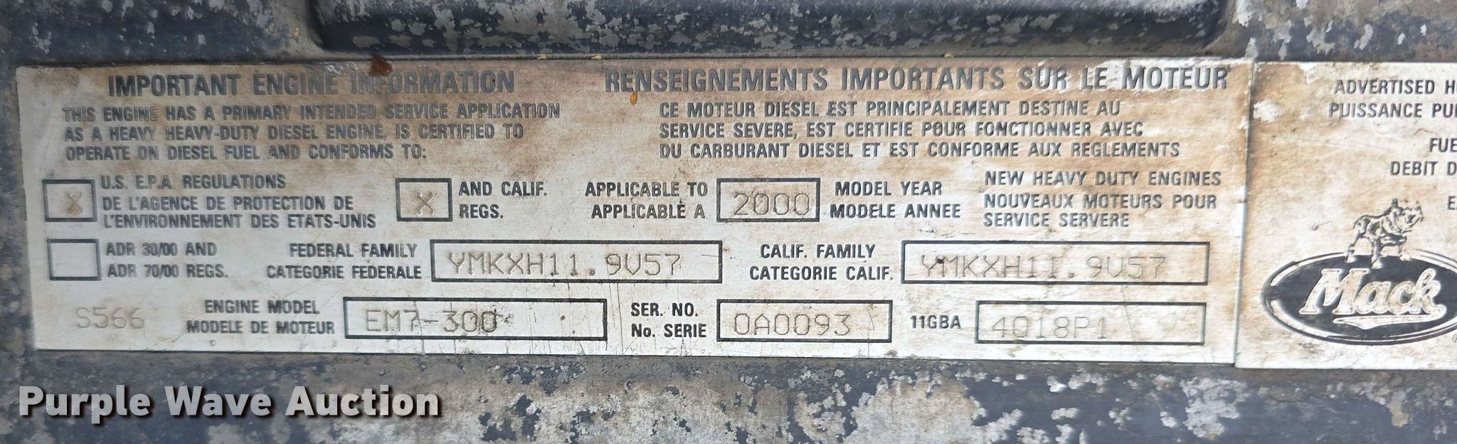 2000 Mack RD690S fuel / lube truck. Miles: 716,898 on odometer, Hours: 42,257 on meter, VIN: 1M2P264C9YM031585. Engine Mack EM7-300, Serial: 0A0093, Displacement: 12.0L, Cylinders: 6, Fuel type: Diesel, HP: 300. Transmission Mack MaxiTorque T2070, Manual, Speed: 7. Chassis Axles: Tandem, Suspension: Camelback, Brakes: Air, PTO, Wheelbase: 250". Interior AC, Heat, Cruise control, Auxiliary controls. Features Bed / tank Diesel tank Capacity: 2,000 gallons, Used oil tank Capacity: 500 gallons, 10' 10" L x 96" W, Compartments: 9, Hose reels: 9, Nozzles, Metered pumps: 1 Fill-Rite, Oil/lube reservoirs Hydraulic fluid, Grease, Motor oil, Used oil, Air compressor PSI: 200, Capacity: 80 gallons.. Tires Front: 425/65R22.5, Rear: 11R22.5. Notes Windshield chipped or cracked, Hydraulic leak. Nebraska title. Title distribution may be delayed up to 14 days from verification of funds. Peitzmeier Demolition. Omaha, NE 68122