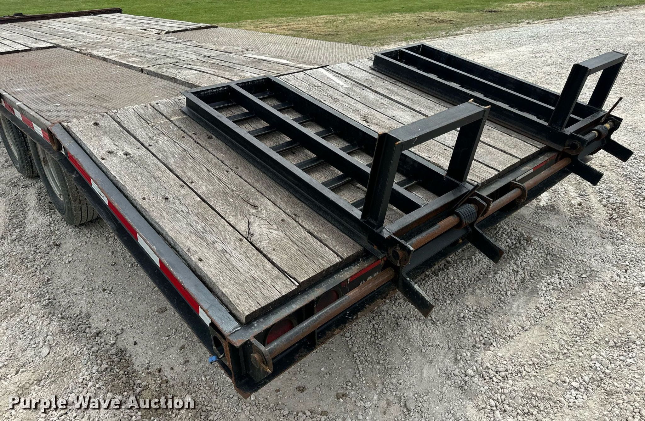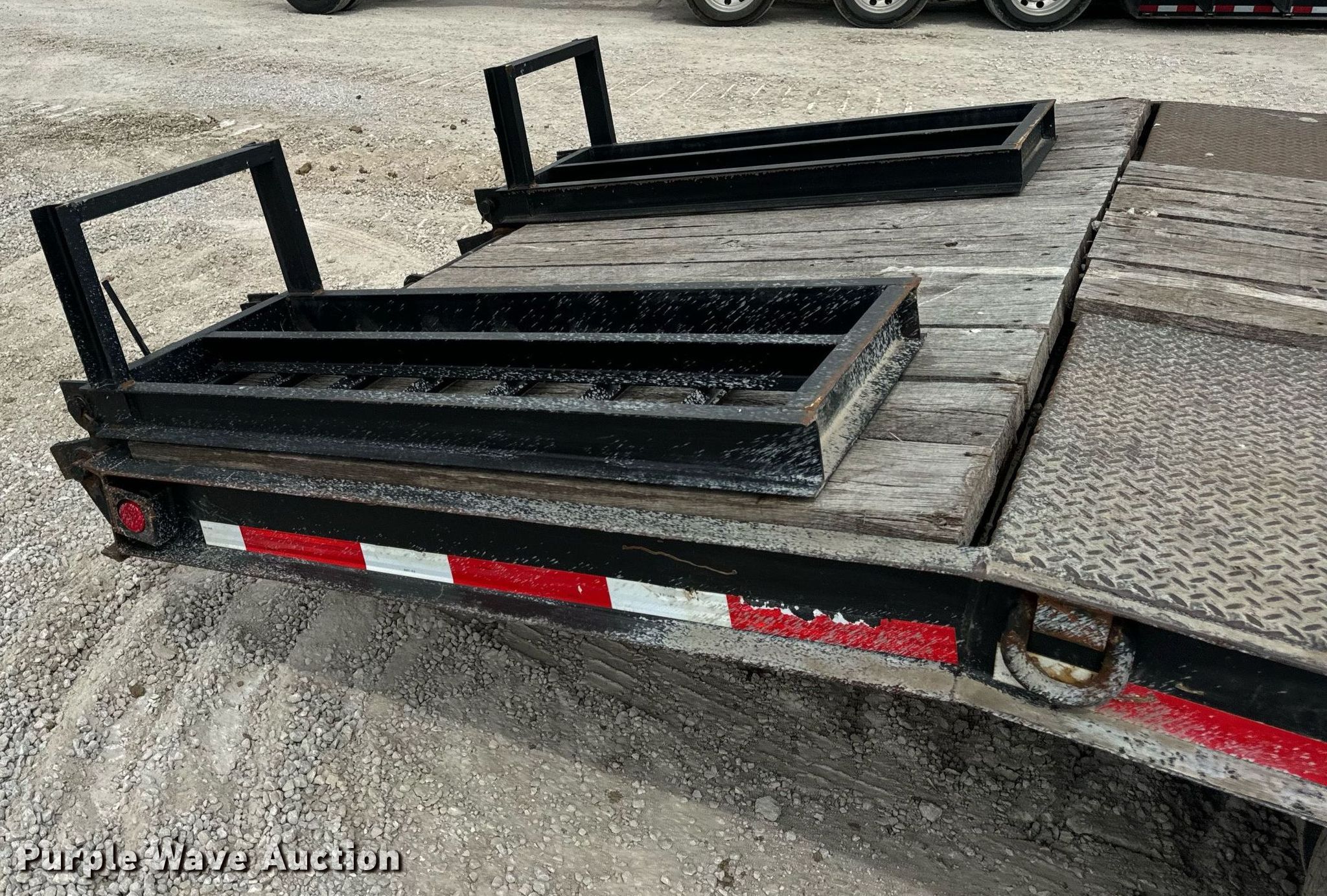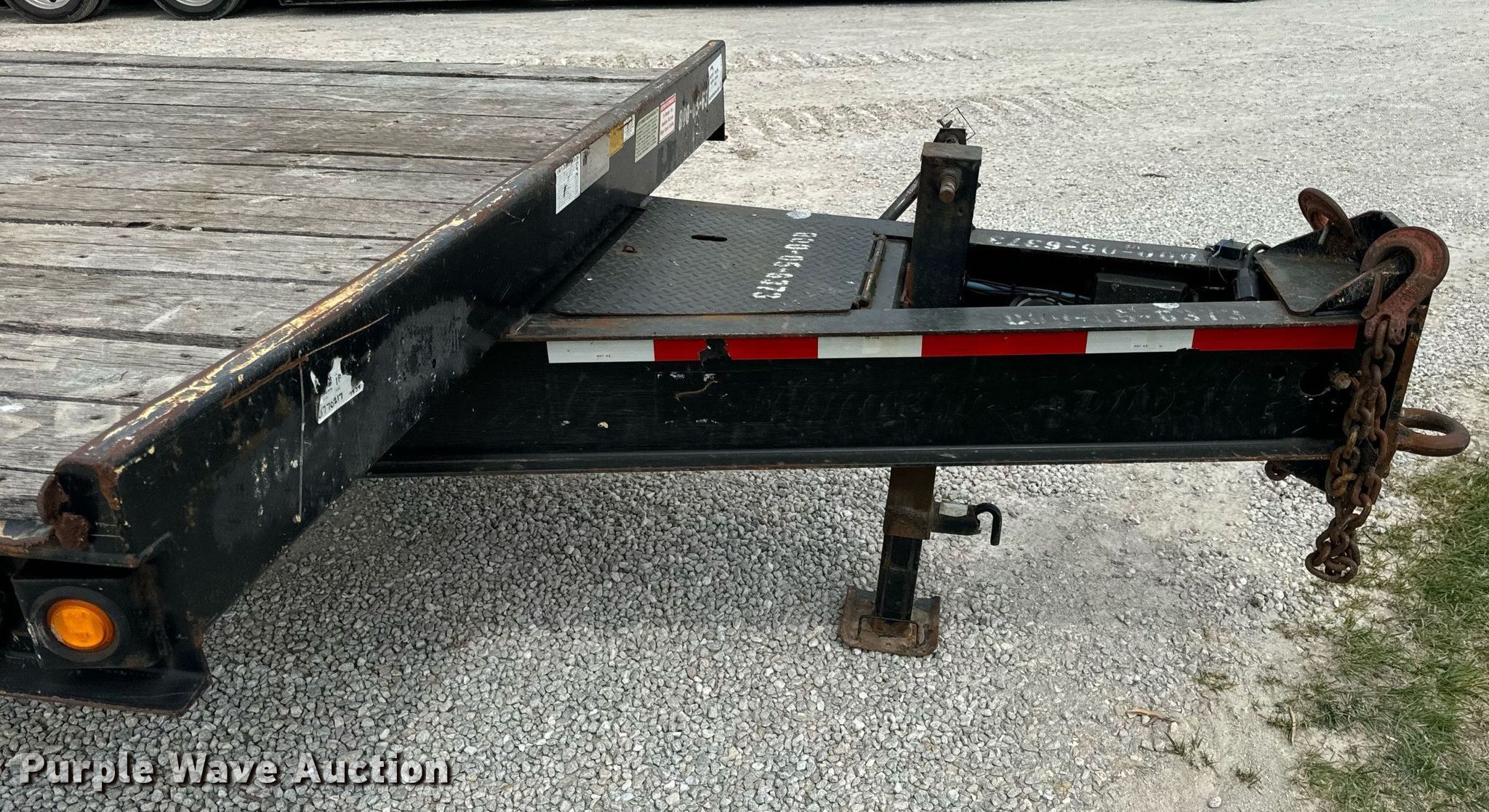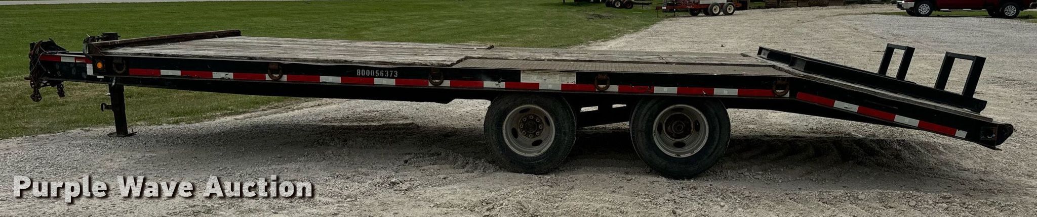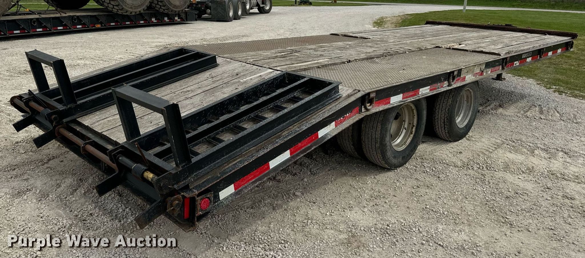 2015 Trail-King TK20LP-242 equipment trailer. VIN: 1TKC02420FR047434. Dimensions Overall: 30' 8" L x 101" W, Deck: 19' L x 101" W, Tail length: 61", Ramps: Manual Length: 54". Features Deck type: Steel, Wood. Chassis Hitch: Pintle, Landing gear: Single, Suspension: Spring, Brakes: Electric, Axles: Tandem, GVWR: 25,990 lbs, GAWR: 10,000 lbs. Tires Steel wheels, Size: ST235/80R16. Missouri title. Title has a lien that will be released following the close of the auction. Title distribution may be delayed up to 30 days from verification of funds. Hardy Holding Group. Boonville , MO 65233