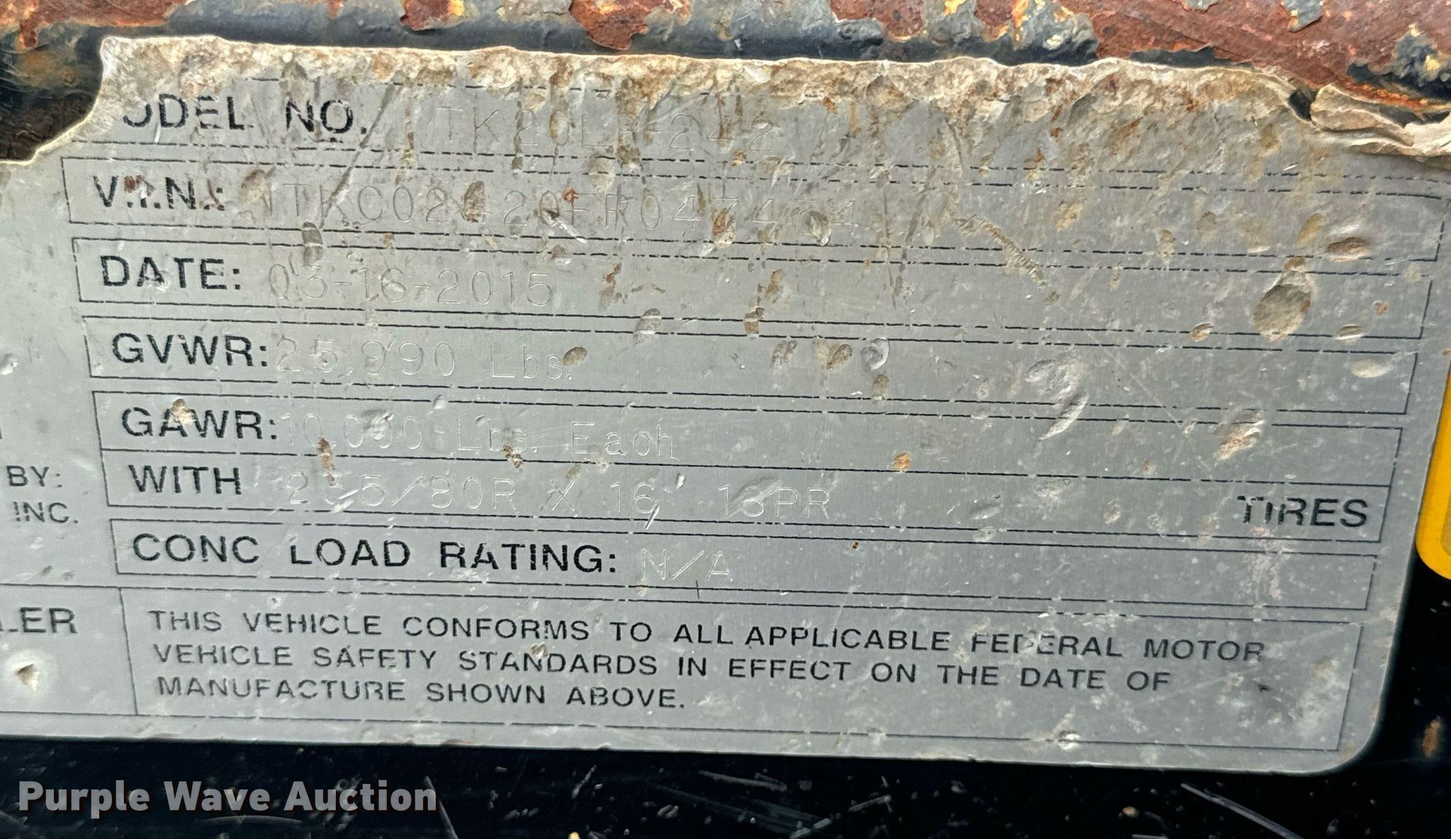 Purple Wave is selling a used Equip. Trailer in Missouri. This item is a 2015 Trail-King TK20LP-242 equipment trailer with the following: VIN: 1TKC02420FR047434