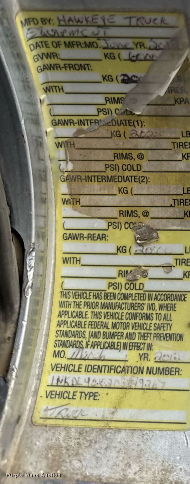2013 Kenworth T800 dump truck. Miles: 273,954 on odometer, Hours: 11,524 on meter, VIN: 1NKDL40X2DJ349267. Engine Cummins ISX15 450, Serial: 79565444, Displacement: 15.0L OHV, Cylinders: 6, Fuel type: Diesel, HP: 450, Engine brake. Transmission Eaton Fuller RT016908LL, Manual, Speed: 8 Two speed reductions. Chassis Axles: 4, Pusher axle Steerable, Differential lock: Full, Suspension: Spring, Brakes: Air, PTO, GVWR: 60,000 lbs FAWR: 20,000 lbs, IAWR: 20,000 lbs, RAWR: 20,000 lbs, Lift axle GAWR: 10,000 lbs. Interior AC, Heat, Heated mirrors, Power windows, Cruise control. Features Dump bed Hilbilt 18'3/16"mgxl, 18' L x 96" W, Side height: 55", Side board height: 10", Bed type: Steel, Liner, Ram: Single, End gate: Air operated. Tires Front: 425/65R22.5, Rear: 11R22.5, Lift axle: 245/70R19.5. Notes Repair documents, oil analysis, and maintenance records available upon request to [email protected] or [email protected]. Iowa title. Title distribution may be delayed up to 14 days from verification of funds. Elder Corporation. Pleasant Hill, IA 50327