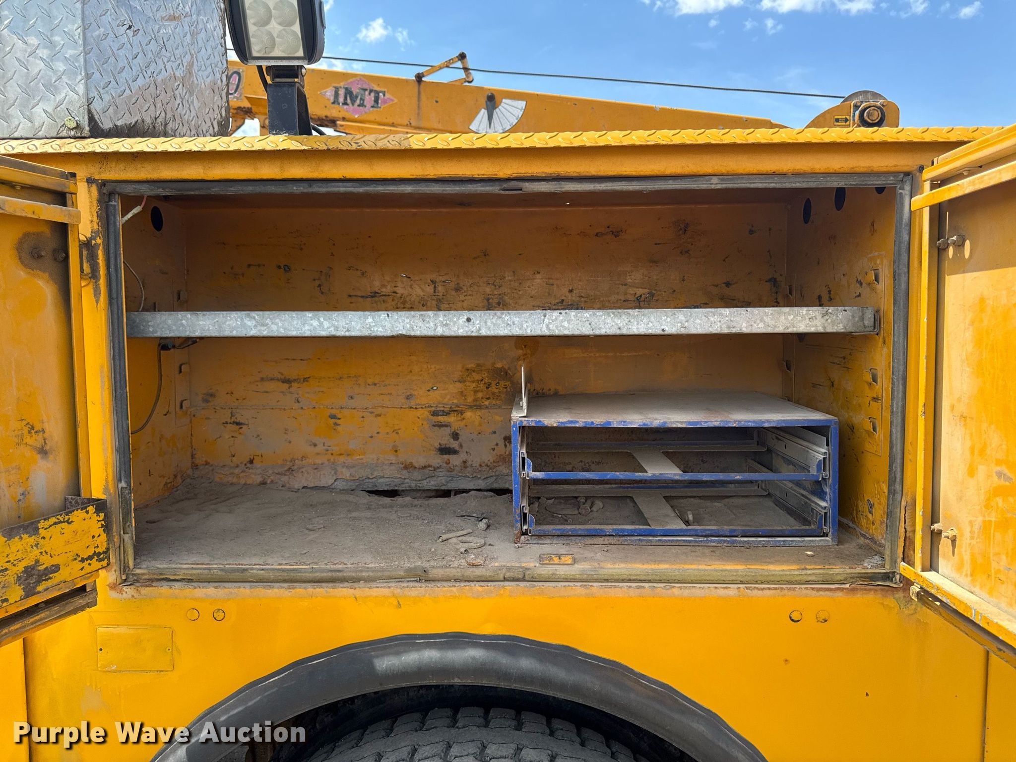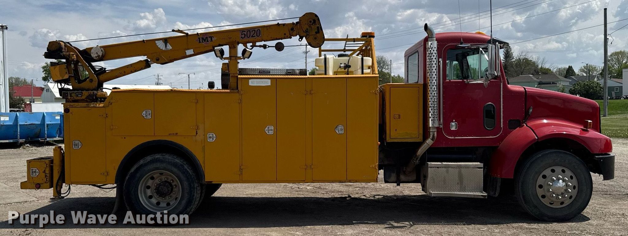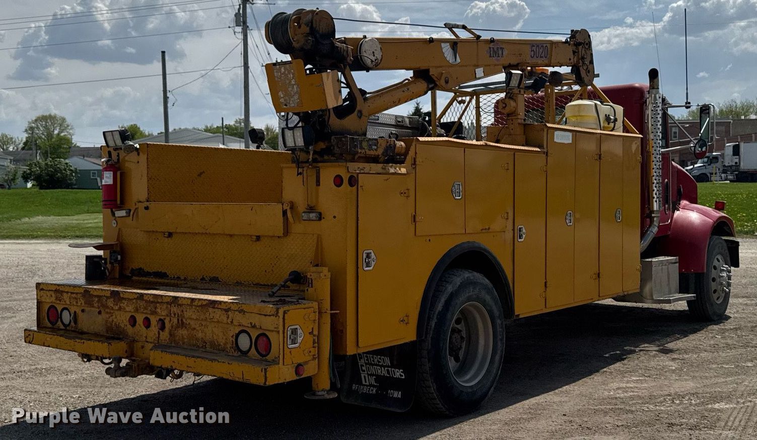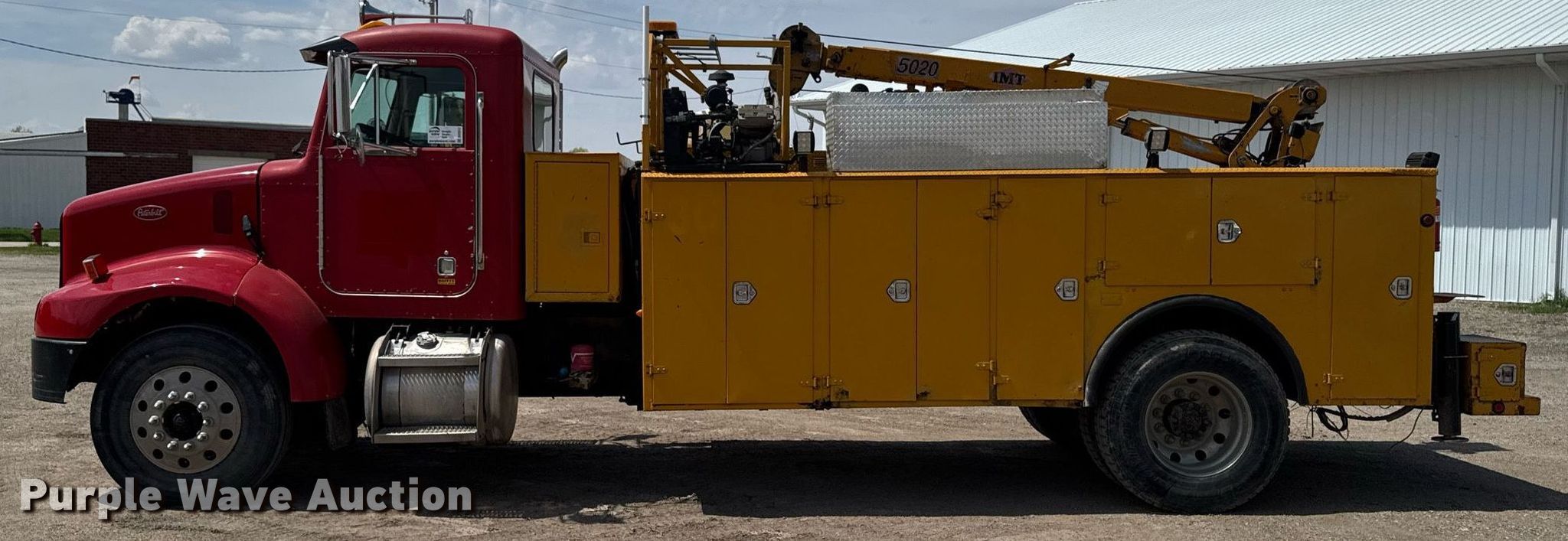 2004 Peterbilt 330 utility / service truck. Miles: 144,345 on odometer, Hours: 23,969 on meter, VIN: 2NPNHD7X54M817247. Engine Caterpillar C7, Displacement: 7.2L, Cylinders: 6, Fuel type: Diesel. Transmission Allison MD3060P, Automatic. Chassis Axles: Single, Suspension: Spring, Brakes: Air, PTO, GVWR: 33,000 lbs. Interior AC, Heat, Heated mirrors, Cruise control. Features Bed IMT, 14' 6" L x 94" W, Torch bottle rack Tanks not included, Air compressor IMT 435-WAR, Crane IMT 5020, Maximum boom length: 20' Maximum lift capacity: 8,600 lbs.. Tires Size: 11R22.5. Notes Non-operational air compressor, Windshield chipped or cracked. Iowa title. Title distribution may be delayed up to 14 days from verification of funds. Peterson Construction. Reinneck, IA 50669