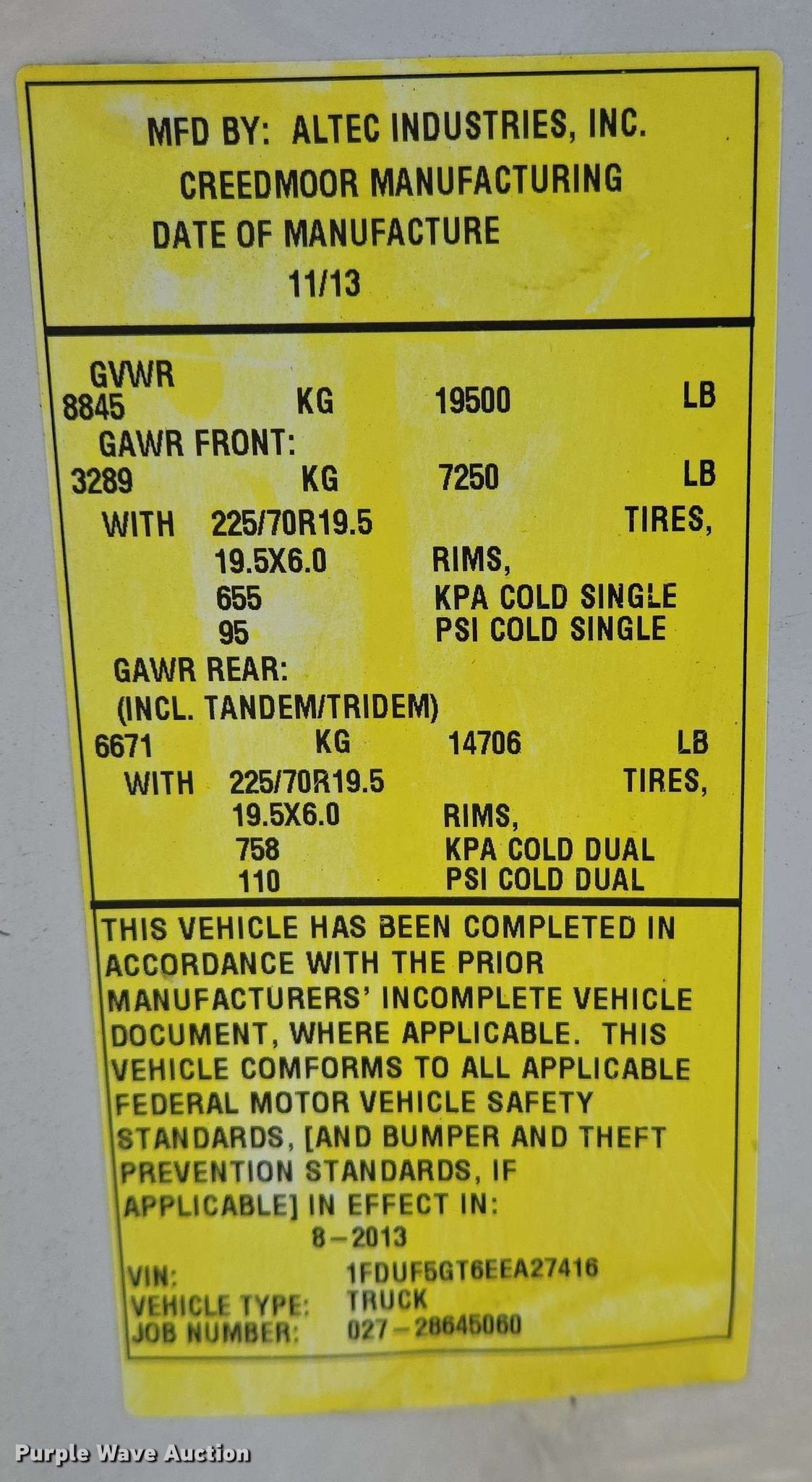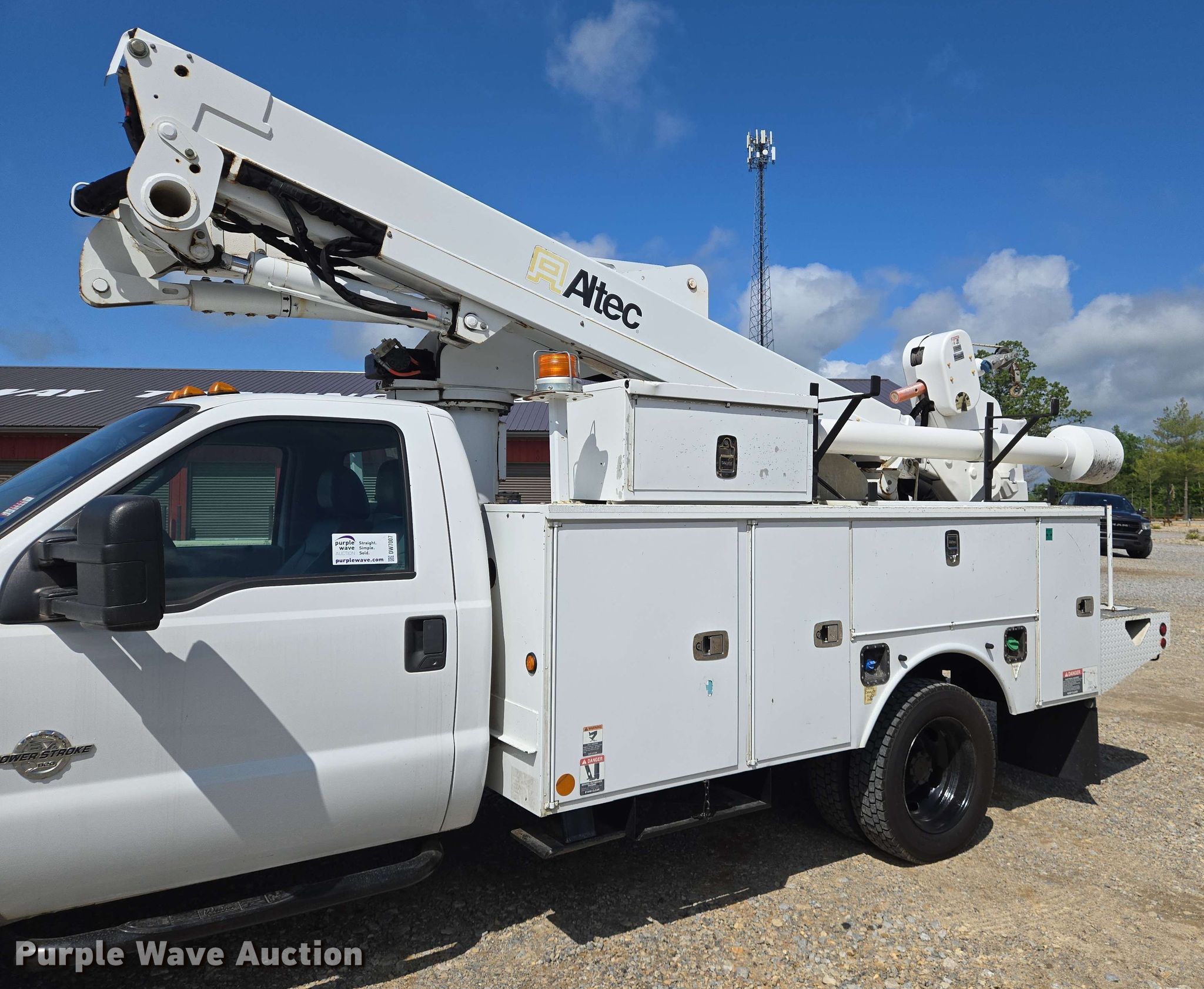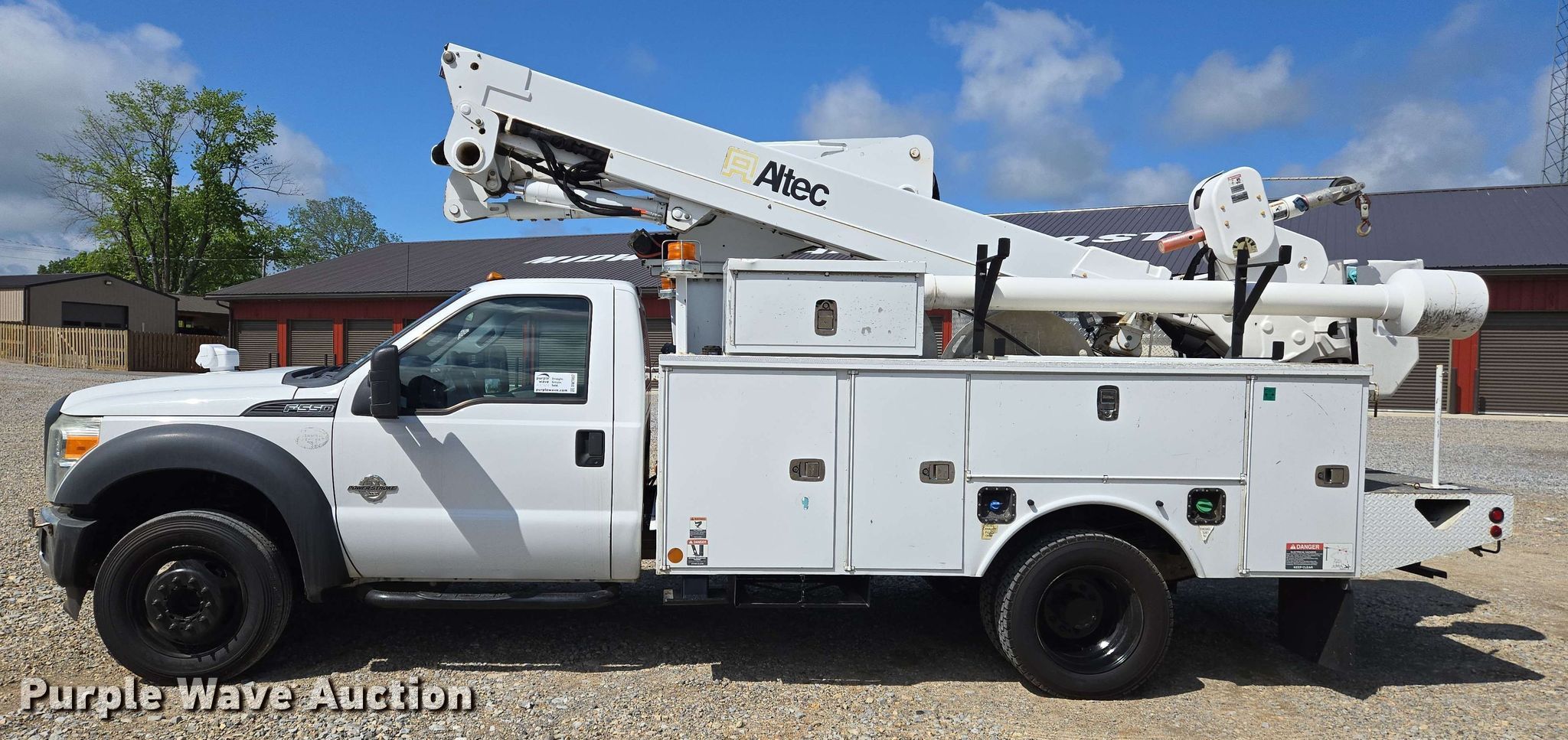 2014 Ford F550 XL Super Duty bucket truck. Miles: 179,575 on odometer, Hours: 1,121 on meter, VIN: 1FDUF5GT6EEA27416. Engine Displacement: 6.7L, Cylinders: 8, Fuel type: Diesel. Transmission Automatic. Chassis Axles: Single, Suspension: Spring, Brakes: Hydraulic, PTO, GVWR: 19,500 lbs. Interior AC, Heat, Cruise control, Auxiliary controls, Brake controller. Features Bed Altec, 11' x 7' 10" W, Boom Altec AR40M, Serial: 1013CZ01390, Maximum lift capacity: 400 lbs, Maximum lift height: 40', Boom type: Articulating, Telescopic, Man basket, Boom controls Ground, Platform/ basket, Material handler. Tires Size: 225/70R19.5. Notes Dash warning indicator: ABS, Airbag. Texas title. Seller is a Missouri licensed motor vehicle dealer. Title will be assigned and distributed by the dealer. Please contact the seller for distribution questions. Title distribution may be delayed up to 14 days from verification of funds. Midway Motors, LLC. Fairdealing, MO 63939