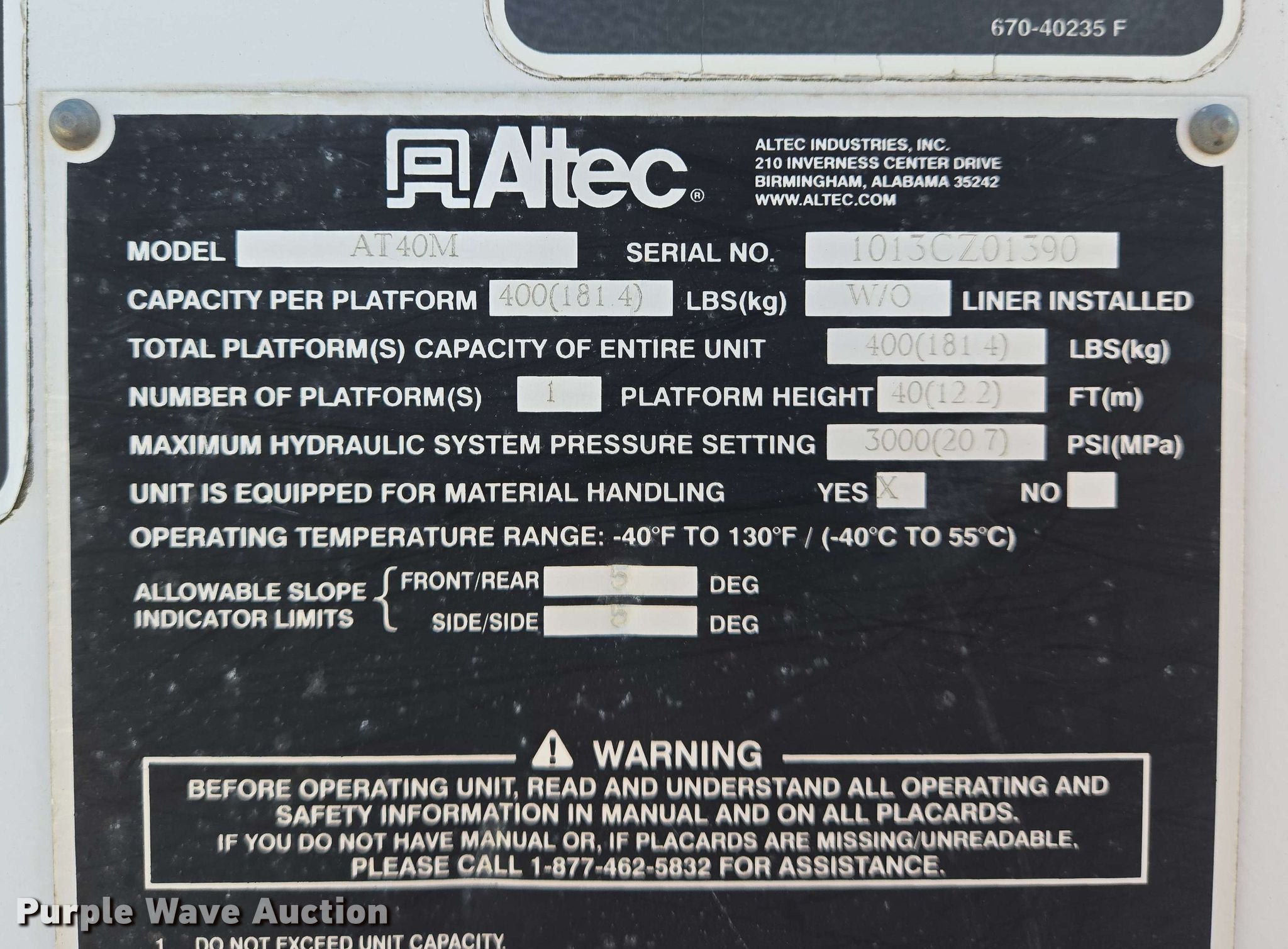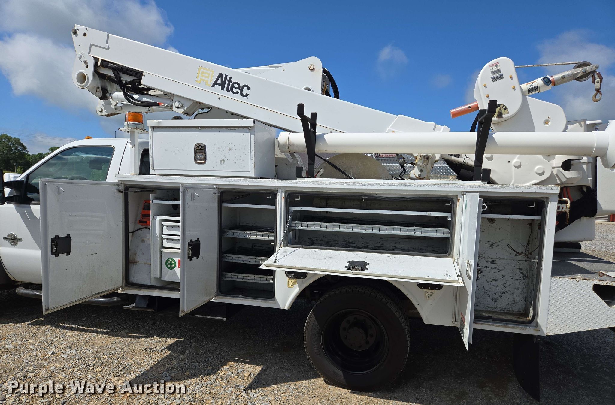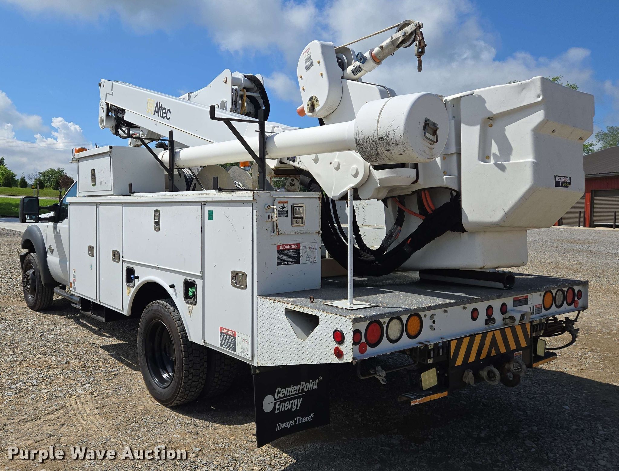 2014 Ford F550 XL Super Duty bucket truck. Miles: 179,575 on odometer, Hours: 1,121 on meter, VIN: 1FDUF5GT6EEA27416. Engine Displacement: 6.7L, Cylinders: 8, Fuel type: Diesel. Transmission Automatic. Chassis Axles: Single, Suspension: Spring, Brakes: Hydraulic, PTO, GVWR: 19,500 lbs. Interior AC, Heat, Cruise control, Auxiliary controls, Brake controller. Features Bed Altec, 11' x 7' 10" W, Boom Altec AR40M, Serial: 1013CZ01390, Maximum lift capacity: 400 lbs, Maximum lift height: 40', Boom type: Articulating, Telescopic, Man basket, Boom controls Ground, Platform/ basket, Material handler. Tires Size: 225/70R19.5. Notes Dash warning indicator: ABS, Airbag. Texas title. Seller is a Missouri licensed motor vehicle dealer. Title will be assigned and distributed by the dealer. Please contact the seller for distribution questions. Title distribution may be delayed up to 14 days from verification of funds. Midway Motors, LLC. Fairdealing, MO 63939