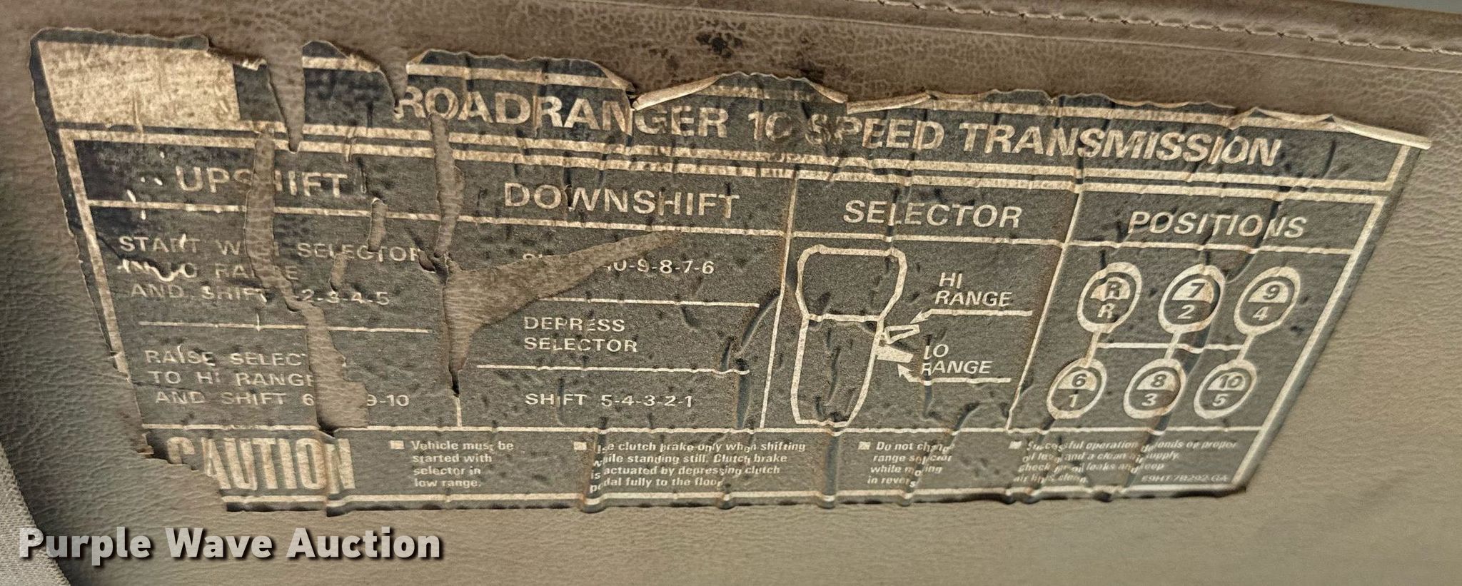 2003 Sterling A9500 semi truck. Miles: 489,297 on odometer, VIN: 2FWJA3BD63AL06969. Engine Cummins N14, Displacement: 14.0L, Cylinders: 6, Fuel type: Diesel, HP: 330. Transmission Eaton Fuller, Manual, Speed: 10. Chassis Axles: Tandem, Differential lock: Inter-axle, Suspension: Air Dump valves, Brakes: Air, PTO. Interior AC, Heat. Features Deck plate: Aluminum, Fifth wheel type: Sliding, Fuel tank: Dual. Tires Size: 315/80R22.5, Front: 11R22.5. Missouri title. Title distribution may be delayed up to 14 days from verification of funds. Harvey Brothers Trucking & Wrecking Co. Inc.. Kansas City, KS 66104
