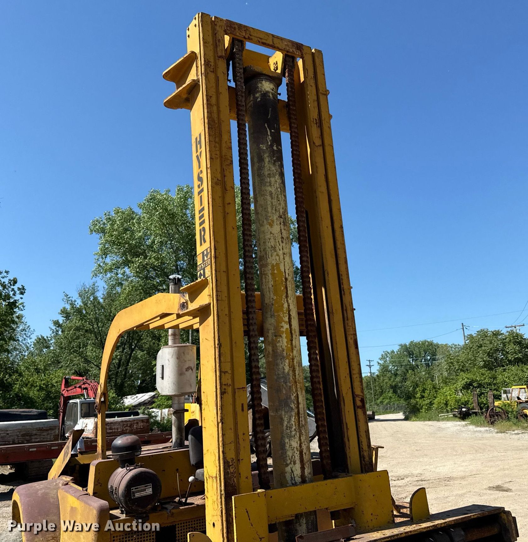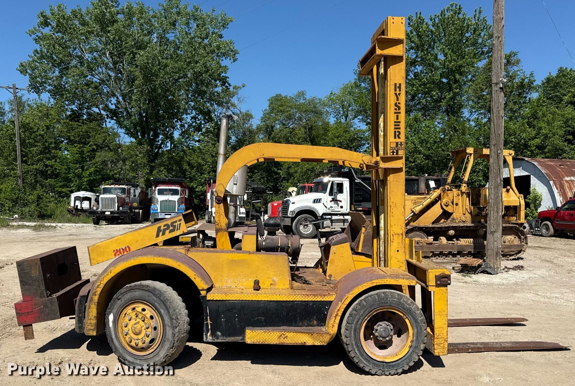 Purple Wave is selling a used Strt. Mast Rough Terr. Forklift in Kansas. This item is a Hyster 200 forklift with the following: Cylinders: 4, Fuel type: Diesel