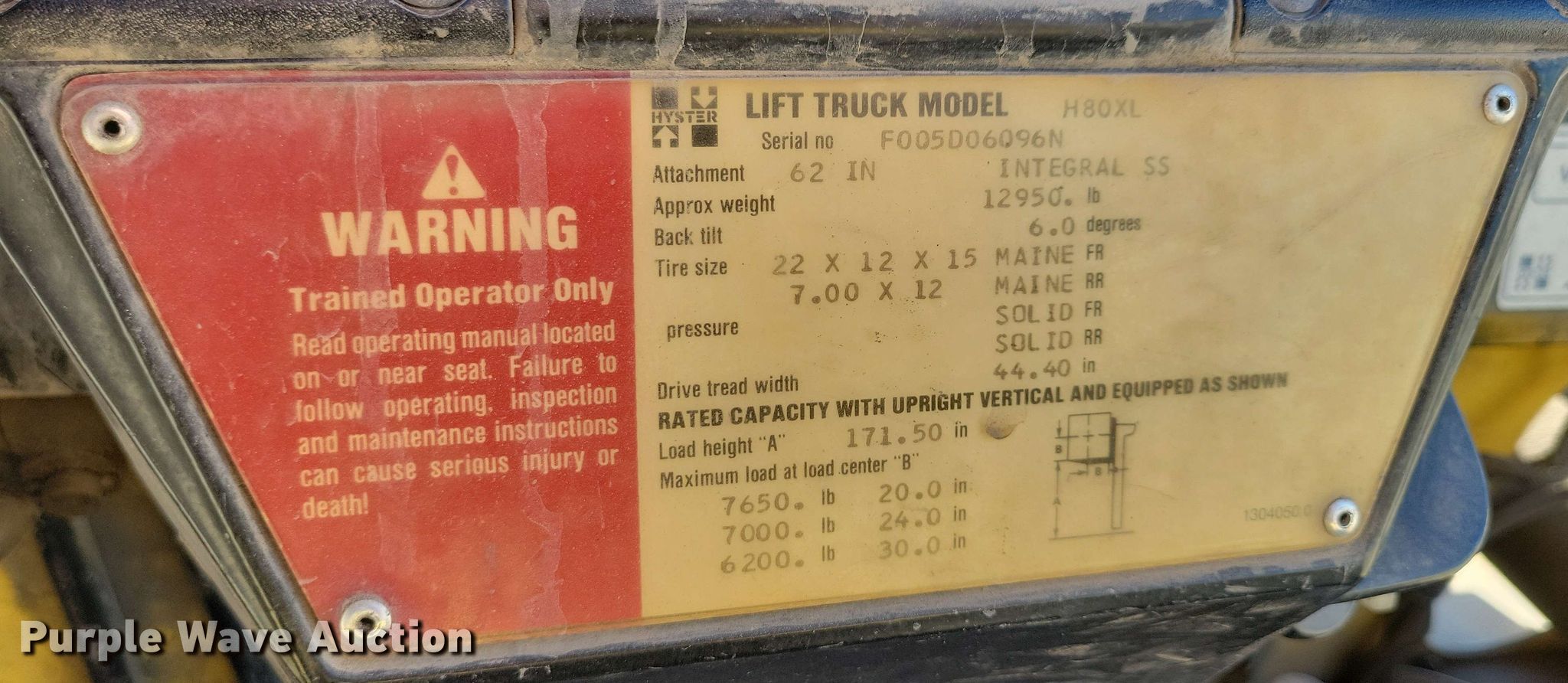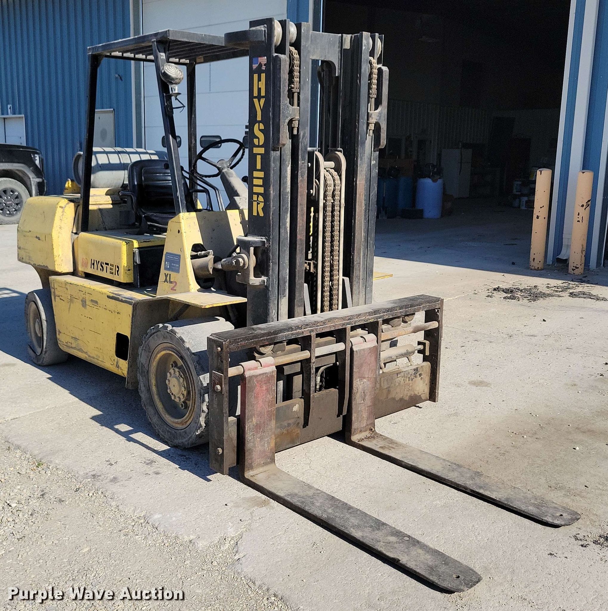 Purple Wave is selling a used Cushion Tire or Pneumatic Forklift in Iowa. This item is a Hyster 80 XL2 forklift with the following: Hours: 8,339 on meter, Serial: F005D06096N