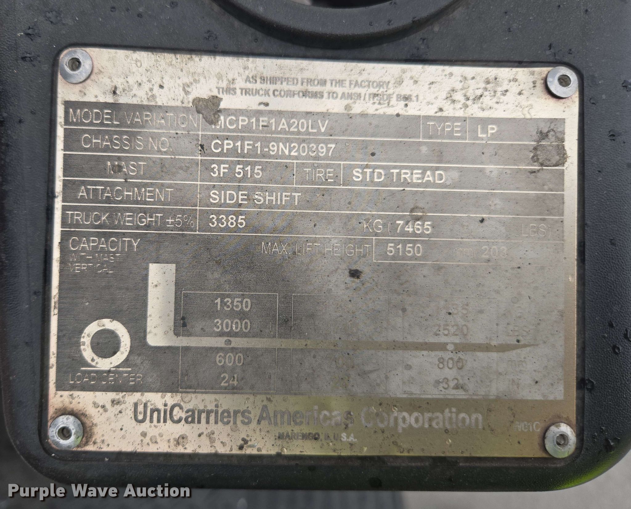 2016 Unicarriers CFS40 forklift. Hours: 841 on meter, Serial: CP1F1-9N20397, Unit #: SFS2074. Engine GCT, Serial: CP1F1-9N20397, Displacement: 2.1L, Fuel type: LPG LP bottle: Included. Transmission Automatic. Operators station Canopy. Features Maximum lift capacity: 3,000 lbs, Maximum lift height: 203", Mast stages: 3, Side shift, Mast tilt, Fork length: 48". Tires Front: 18x6x12 1/8, Rear: 14x5x10, Solid. Ferguson. Phoenix, AZ 85004