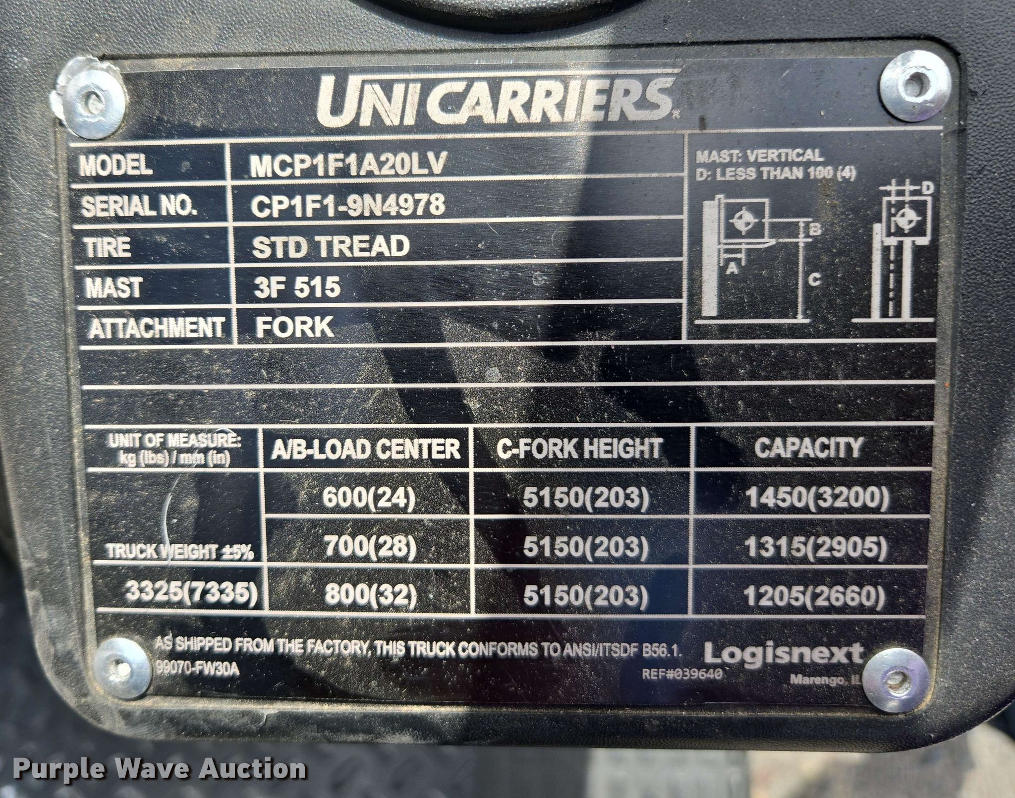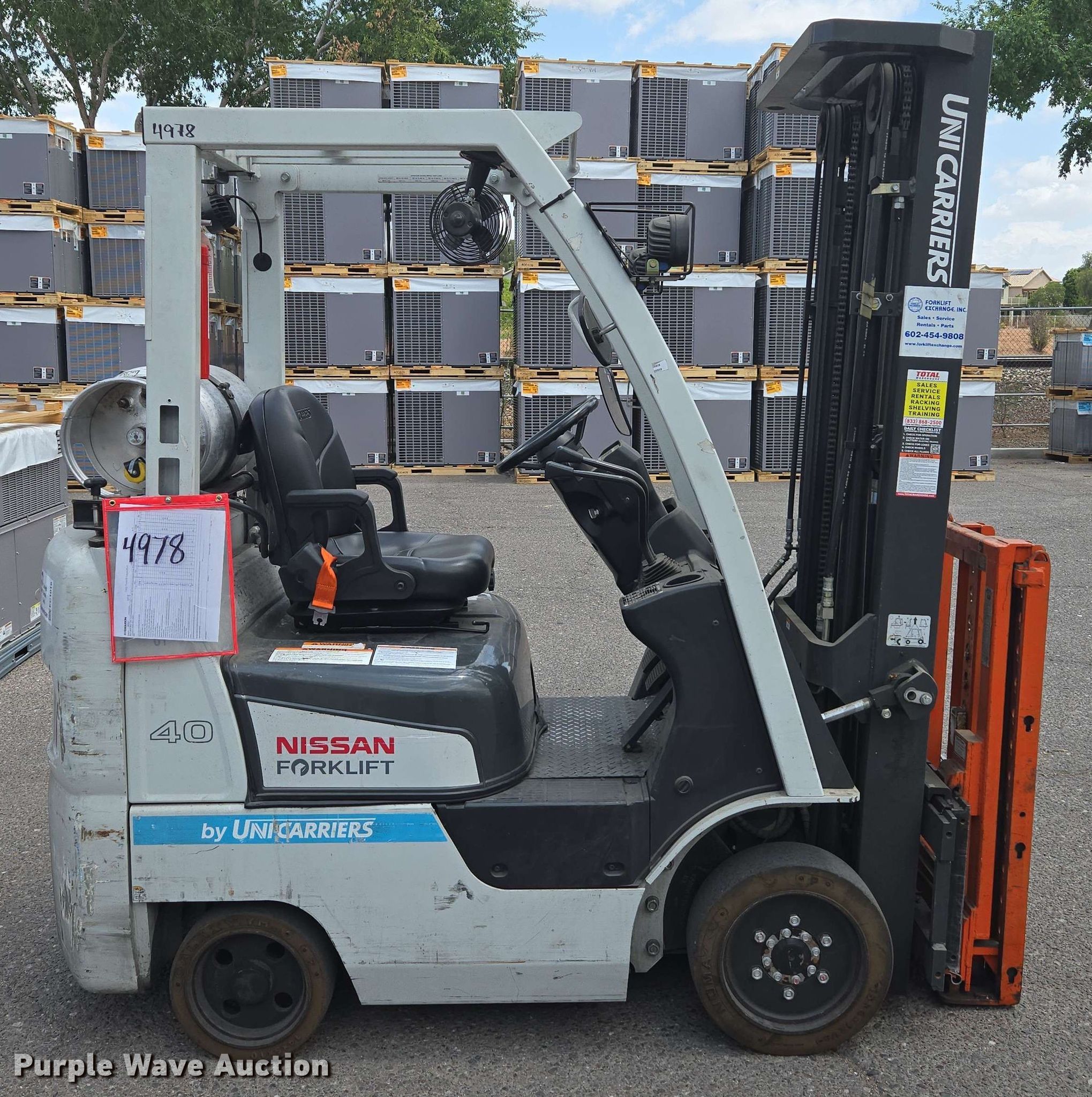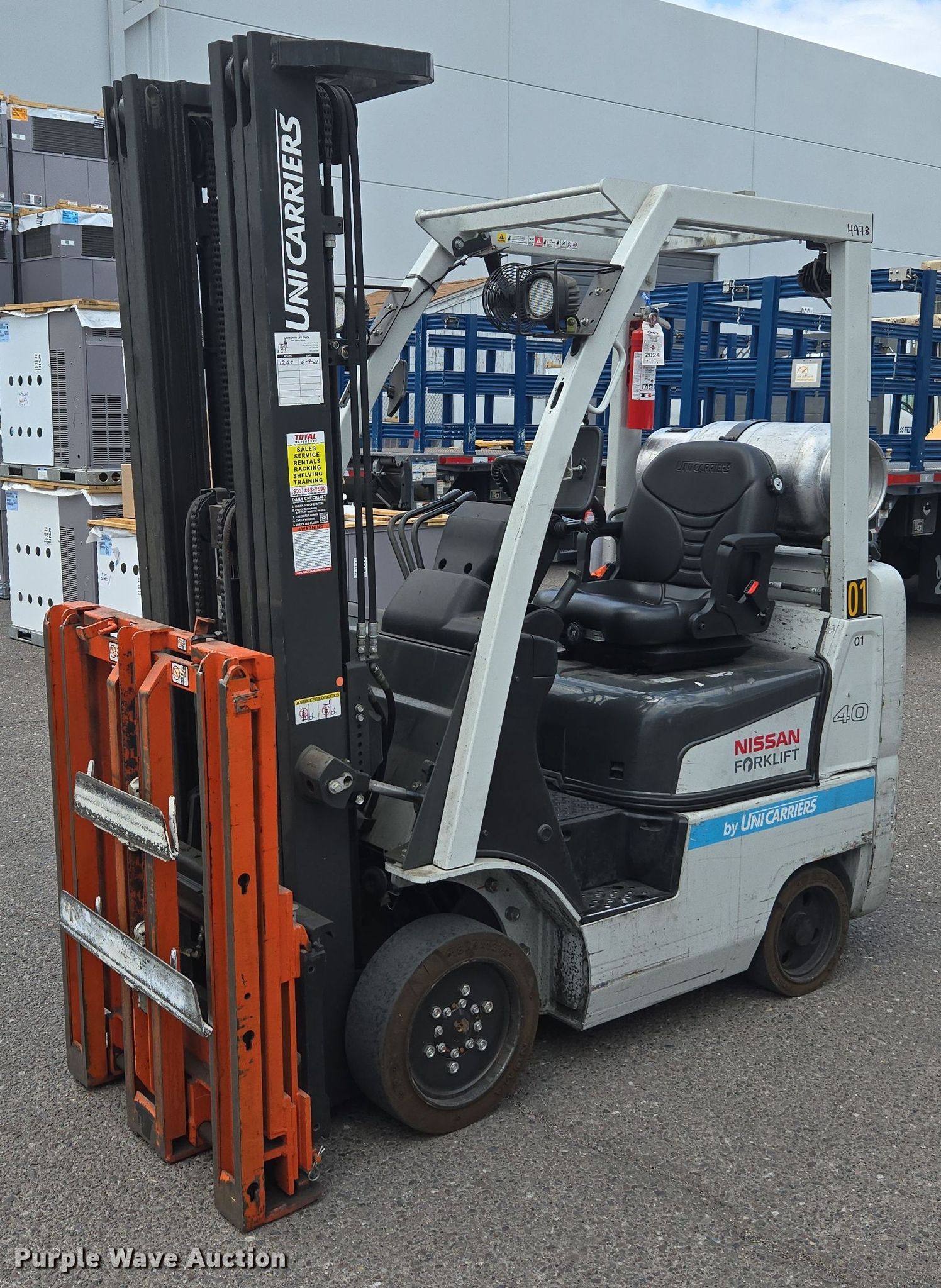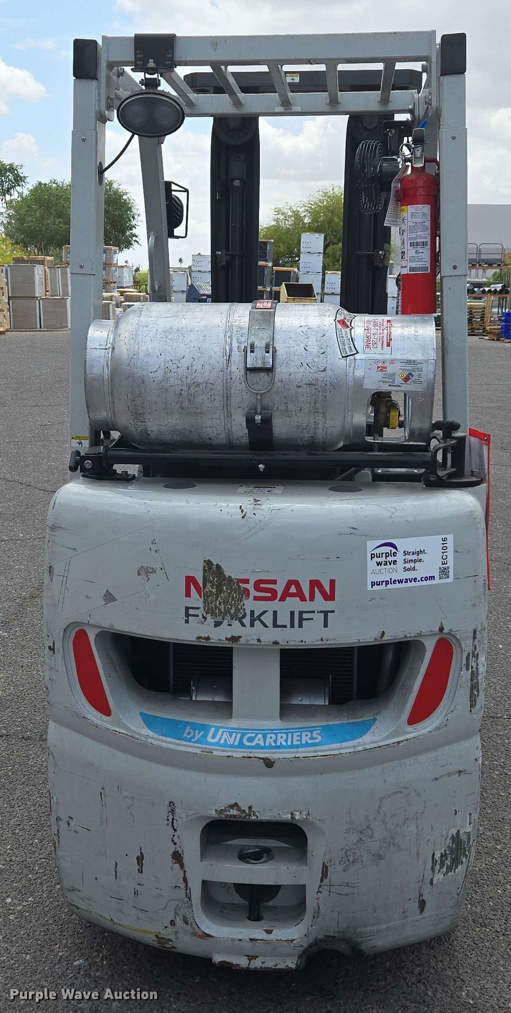 Purple Wave is selling a used Warehouse Forklift in Arizona. This item is a 2015 Nissan CFS40 forklift with the following: Hours: 1,724 on meter, Serial: CP1F1-9N4978, Unit #: SFS2087