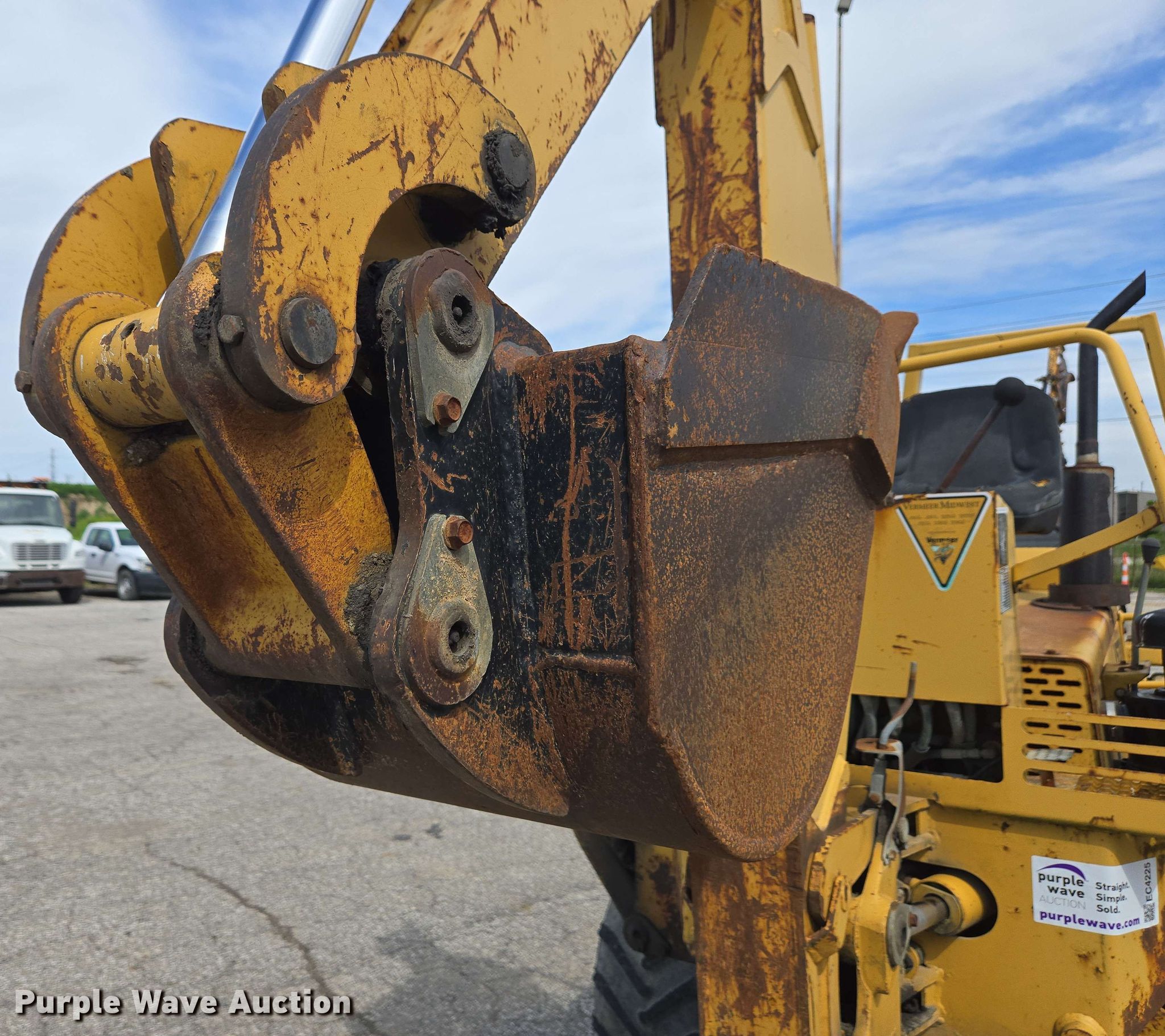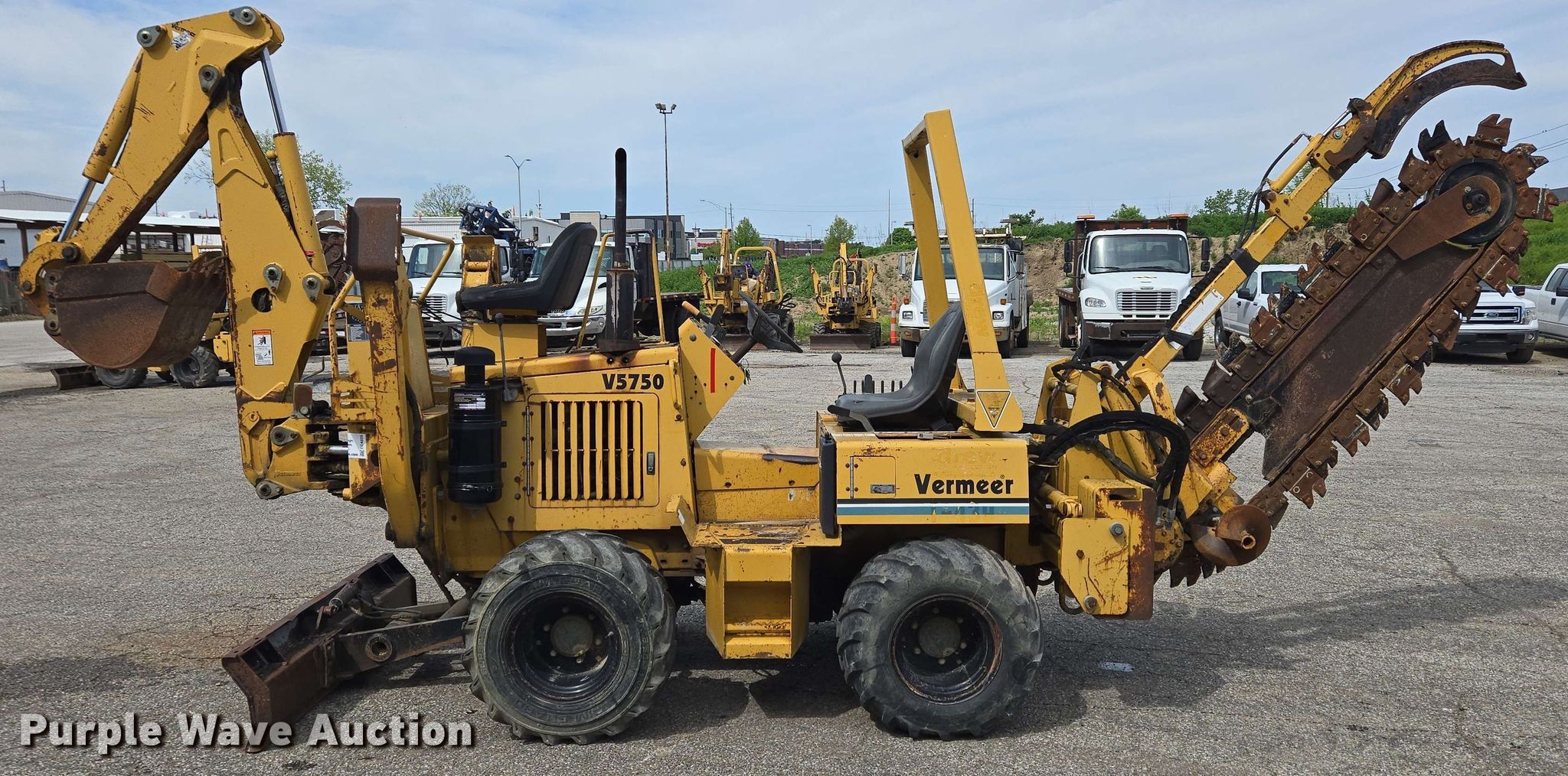 1996 Vermeer V5750 trencher. Engine. Deutz, Cylinders: 4, Fuel type: Diesel. Transmission Hydrostatic, Two speed travel. Chassis Four wheel drive, Four wheel steer. Operators station OROPS. Features Trencher Model: S05750, Estimated dig depth: 84", Cutting width: 6", Side shift, Teeth: Dirt, Backhoe Model: B600, Bucket width: 18", Backfill blade Width: 72". Tires Size: 31x15.50-15. Notes Hydraulic leaks, Non-operational right outrigger. James H. Drew Corp.. Indianapolis, IN 46268