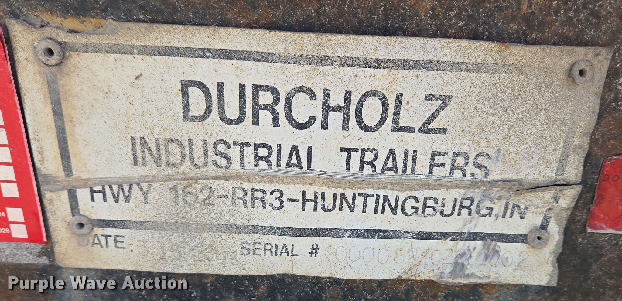 2011 Durcholz equipment trailer. VIN: 20000821022011002. Dimensions Overall: 31' L x 8' 6" W, Deck: 20' L x 8' 2" W, Deck height: 3', Tail length: 5' 3", Ramps: Manual Length: 4'. Features Deck type: Wood. Chassis Landing gear: Single, Suspension: Spring, Brakes: Electric, Axles: Tandem. Tires Steel wheels, Size: 225/75R16. Notes Unknown operating condition of landing gear, crank is missing. Indiana title. Title distribution may be delayed up to 14 days from verification of funds. James H. Drew Corp.. Indianapolis, IN 46268