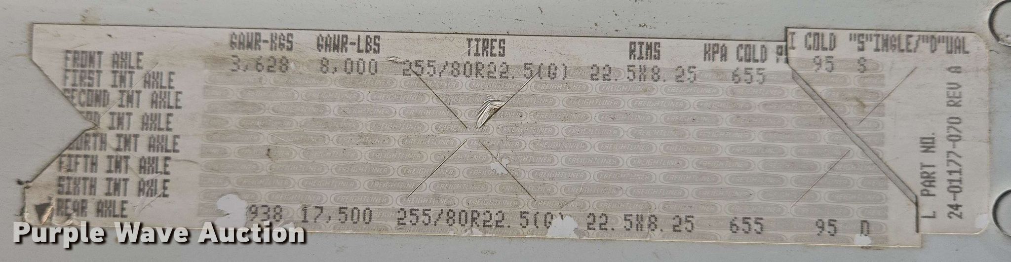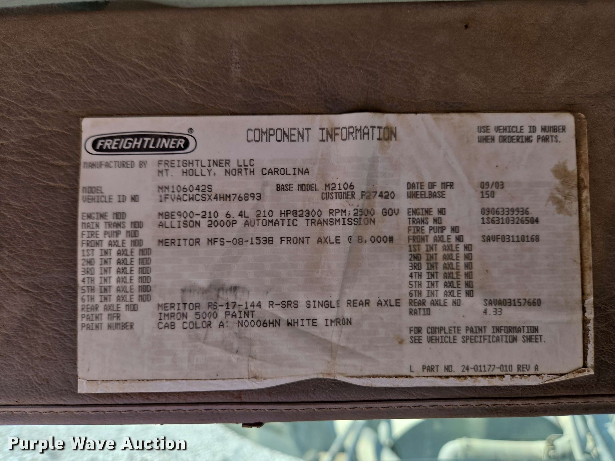 2004 Freightliner M2 106 utility / service truck. Miles: 278,956 on odometer, Hours: 21,741 on meter, VIN: 1FVACWCSX4HM76893. Engine Mercedes Benz MBE900, Displacement: 6.4L, Cylinders: 6, Fuel type: Diesel. Transmission Allison 2000P, Automatic. Chassis Axles: Single, Suspension: Air, Brakes: Air, GVWR: 25,500 lbs. Interior AC, Heat, Heated mirrors, Cruise control, Brake controller. Features Bed Knapheide, 11' 2" L x 95" W, Oil/lube system Nozzles, Pump. Tires Size: 295/75R22.5. Notes Windshield chipped or cracked. Indiana title. Title distribution may be delayed up to 14 days from verification of funds. James H. Drew Corp.. Mooresville, IN 46158