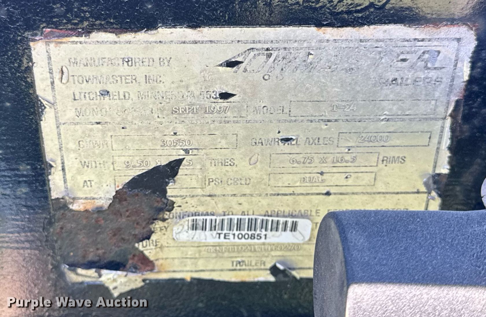 1998 Towmaster T24 equipment trailer. VIN: 4KNFT1921WL160270. Dimensions Overall: 29' 6" L x 101" W, Deck: 19' L x 101" W, Deck height: 34", Tail length: 60", Ramps: Manual Length: 60". Features Deck type: Wood. Chassis Hitch: Pintle, Landing gear: Single, Suspension: Spring, Brakes: Air, Axles: Tandem, GVWR: 30,550 lbs, GAWR: 12,000 lbs. Tires Steel wheels, Size: 235/85R16. Wisconsin title. Title distribution may be delayed up to 14 days from verification of funds. JJ Vondrum & Sons LLC.. Lancaster, WI 53813