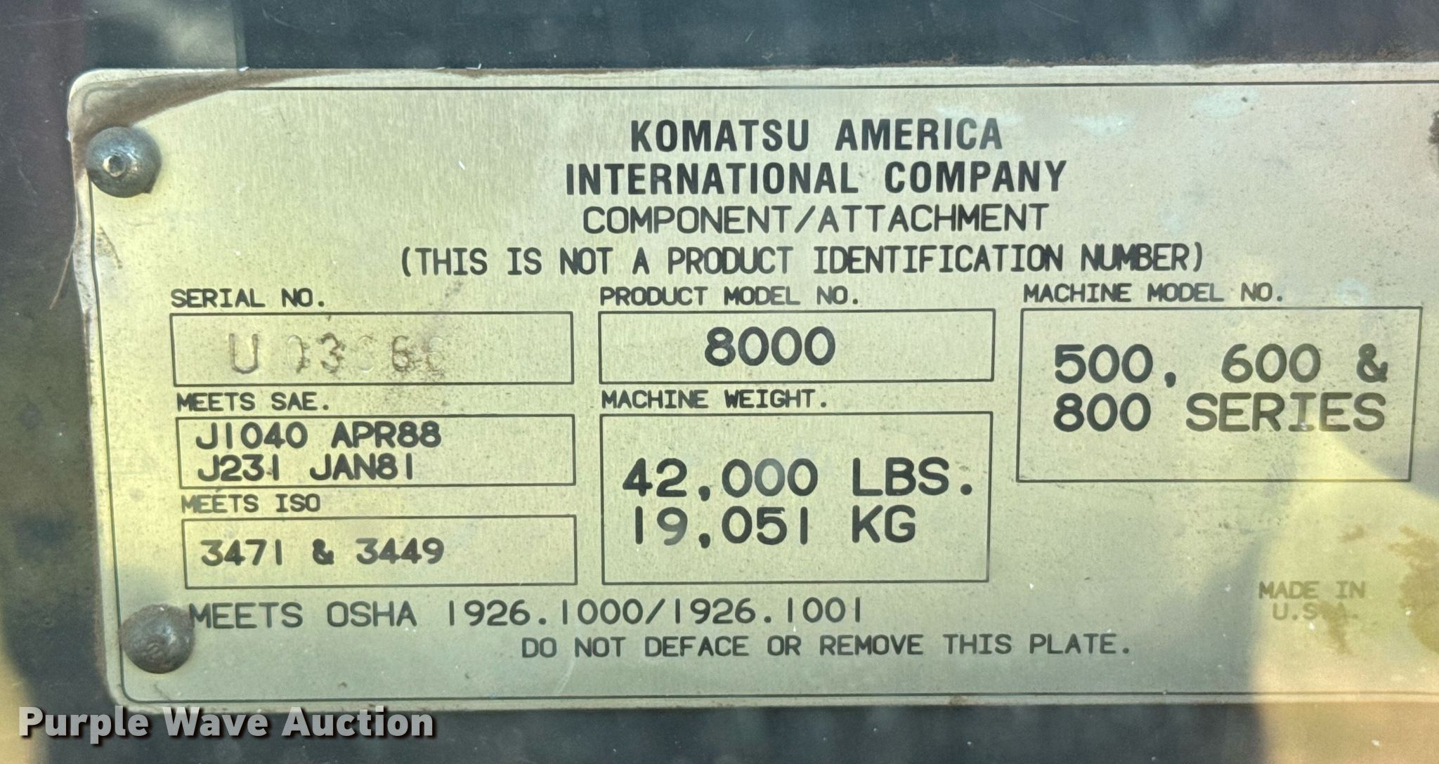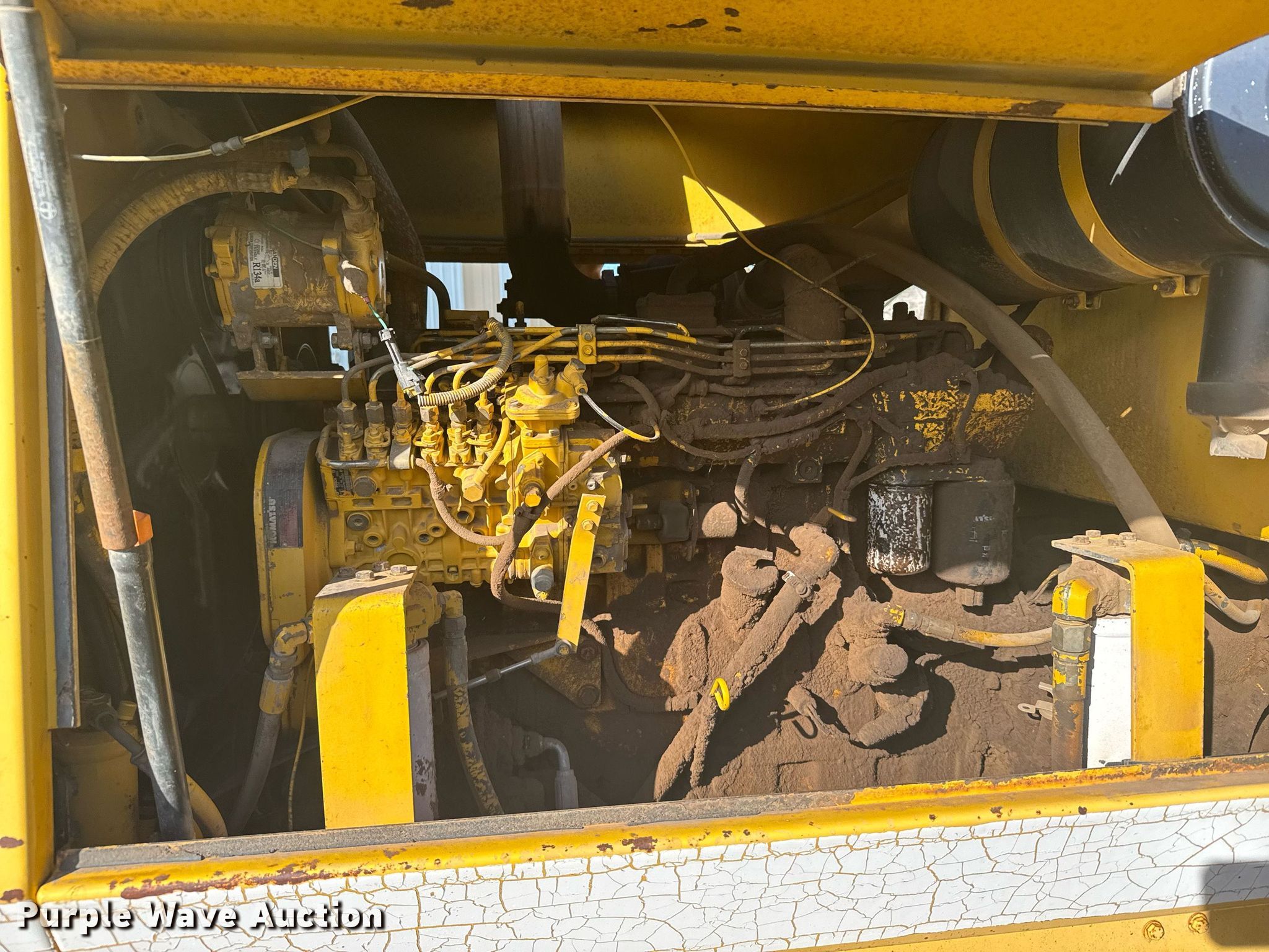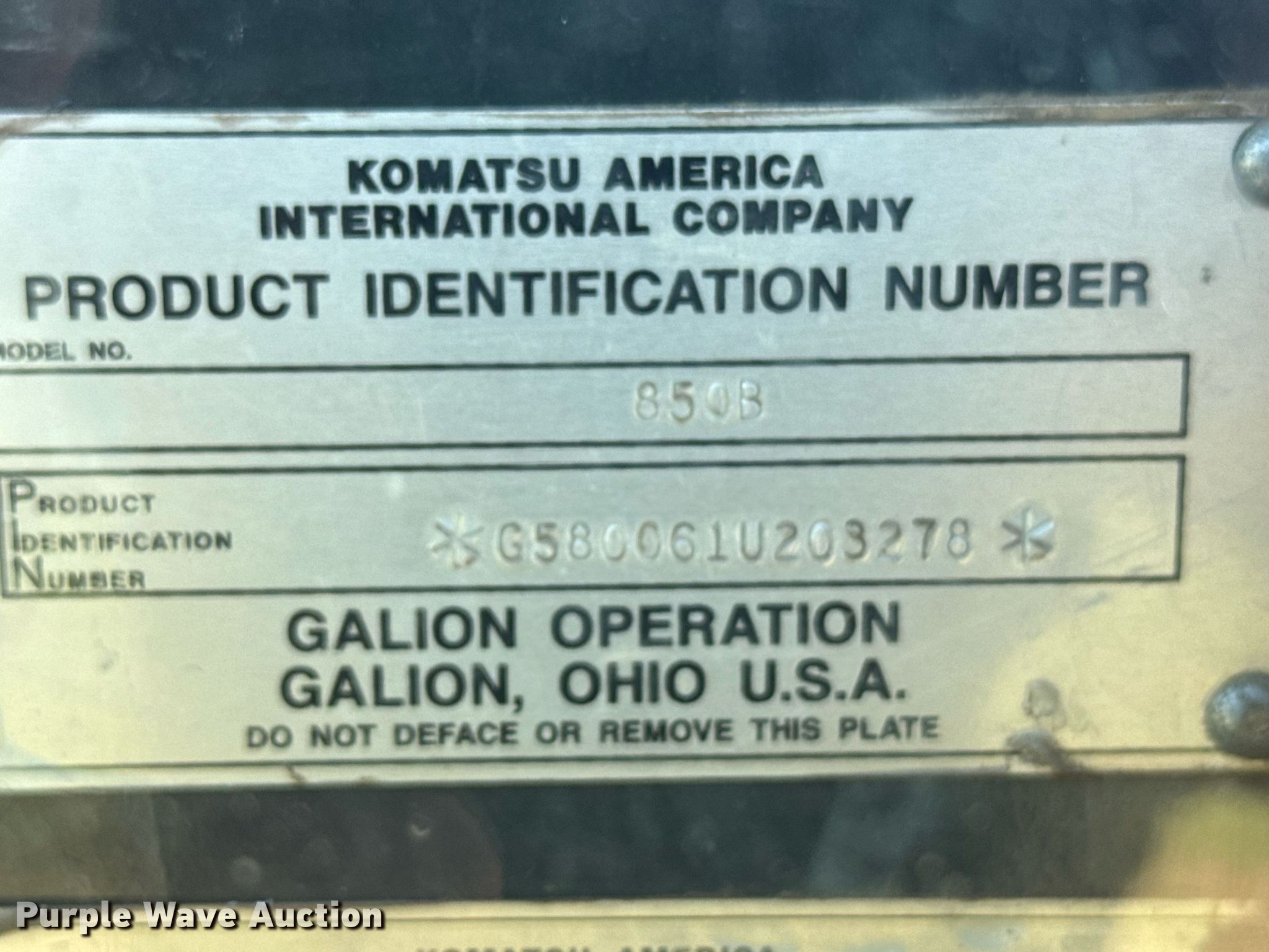 1997 Galion 850B motor grader. Hours: 6,743 on meter, Serial: U203278. Engine Komatsu, Cylinders: 6, Fuel type: Diesel. Transmission Powershift, 6F - 3R. Operators station Enclosed cab, Heat, Hydraulic control valves: 9. Features Moldboard: Tip control, Side shift, Moldboard total width: 14', Front-mounted lift group Make: Dynamax, Scarifier Make: Dynamax, Scarifier type: Front-mounted Teeth: 5.. Tires Size: 14.00R24. Claflin, KS 67525