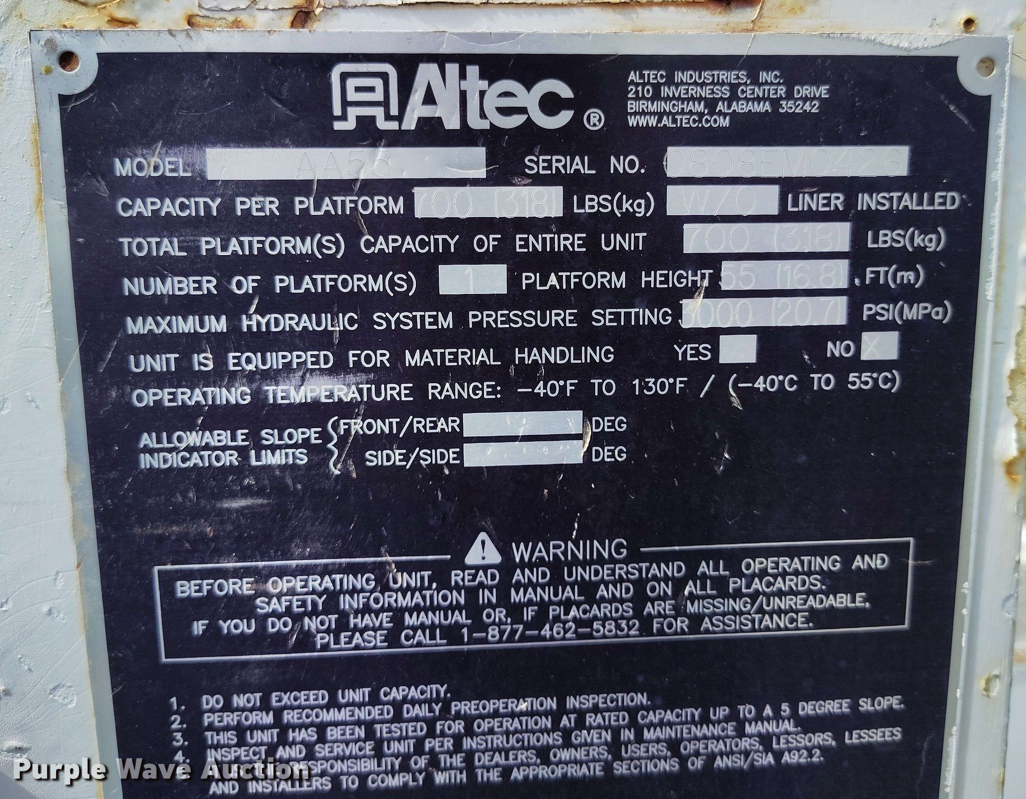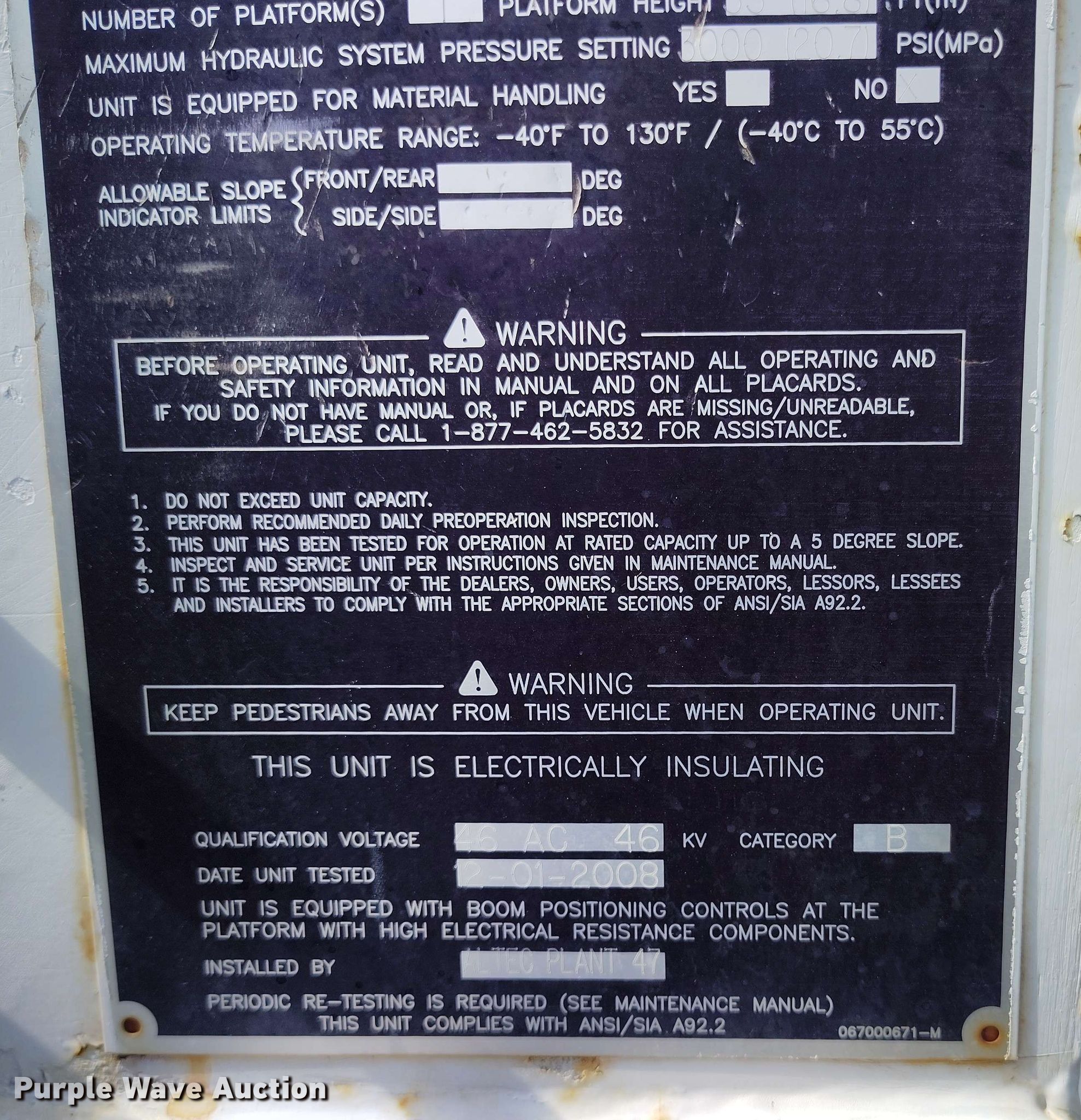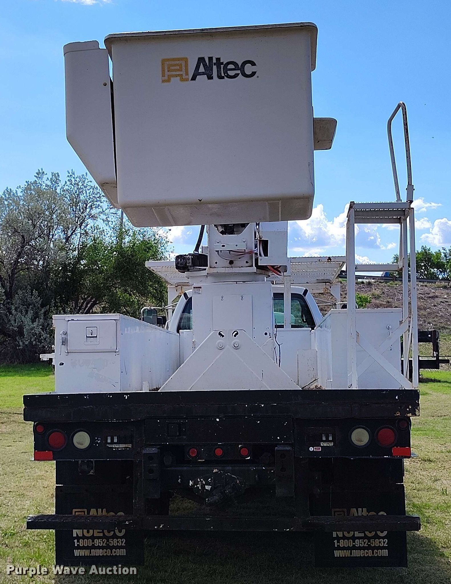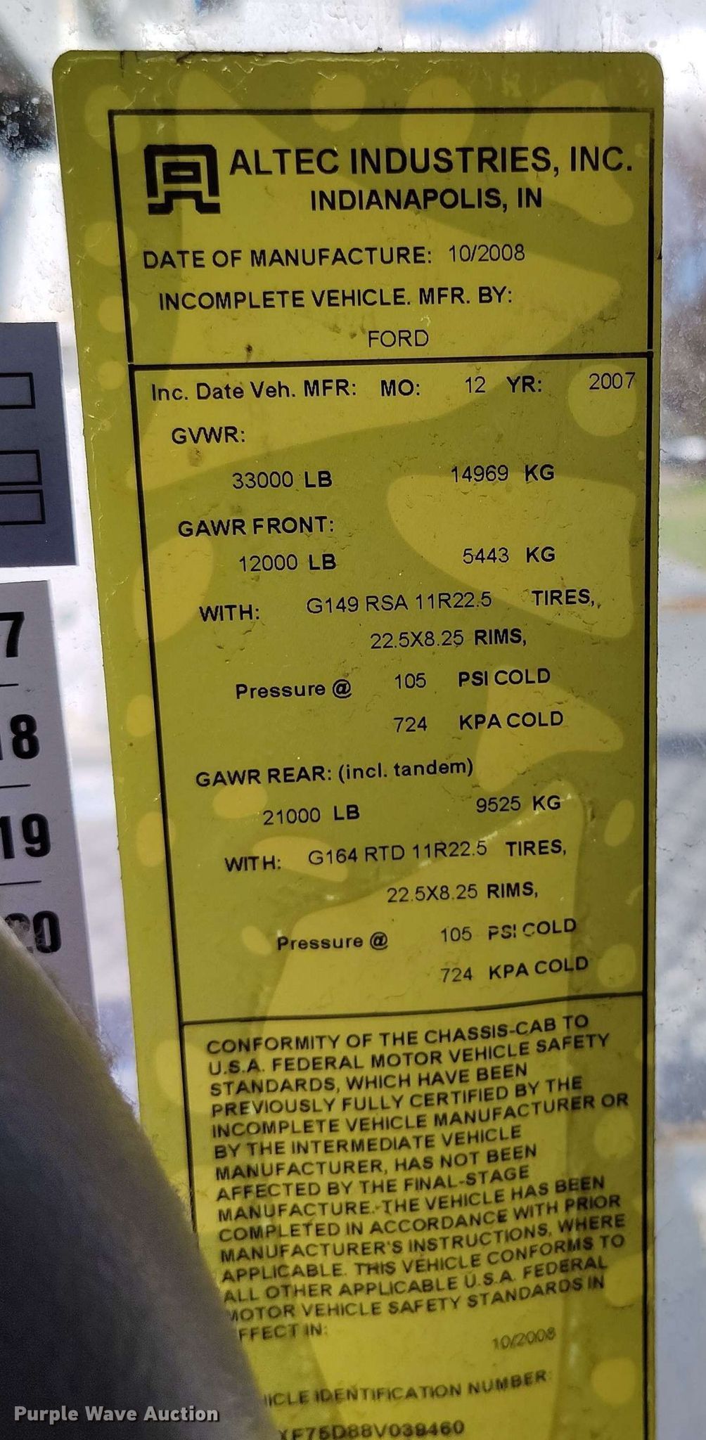2008 Ford F750 Super Duty bucket truck. Miles: 76,008 on odometer, Hours: 2,246 on meter, VIN: 3FRXF75D88V039460. Engine Cummins ISB 240, Serial: 57789300, Displacement: 6.7L, Cylinders: 6, Fuel type: Diesel. Transmission Manual, Speed: 6. Chassis Axles: Single, Suspension: Spring, Brakes: Air, PTO, GVWR: 33,000 lbs, Wheelbase: 194". Interior AC, Heat, Cruise control, Brake controller. Features Bed Altec, Serial: 47-11566208, 17' 3" L x 93" W, Boom 2008 Altec AA55, Serial: 0808EM0426, Maximum lift capacity: 700 lbs, Maximum lift height: 55', Boom type: Articulating, Insulated, Man basket, Boom controls Ground, Platform/ basket.. Tires Size: 11R22.5. Notes Windshield chipped or cracked, Service bed rust damage, holes, Frame rust damage. Colorado title. Title distribution may be delayed up to 14 days from verification of funds. JLH Electrical LLC. La Junta, CO 81050
