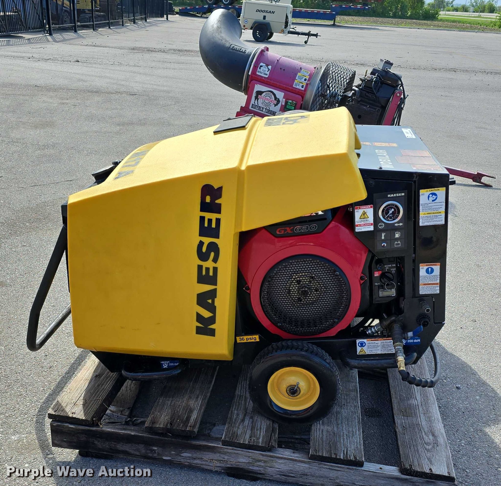 2021 Kaeser MOBILAIR M17A air compressor. Hours: 218 on meter, Serial: 100475. Engine Honda GX630, Cylinders: 2, Fuel type: Gas. Features Air compressor CFM: 60, PSI: 232. Tires Solid. Jordan Machinery/ S & N Auto Sales. Waterloo, NE 68069