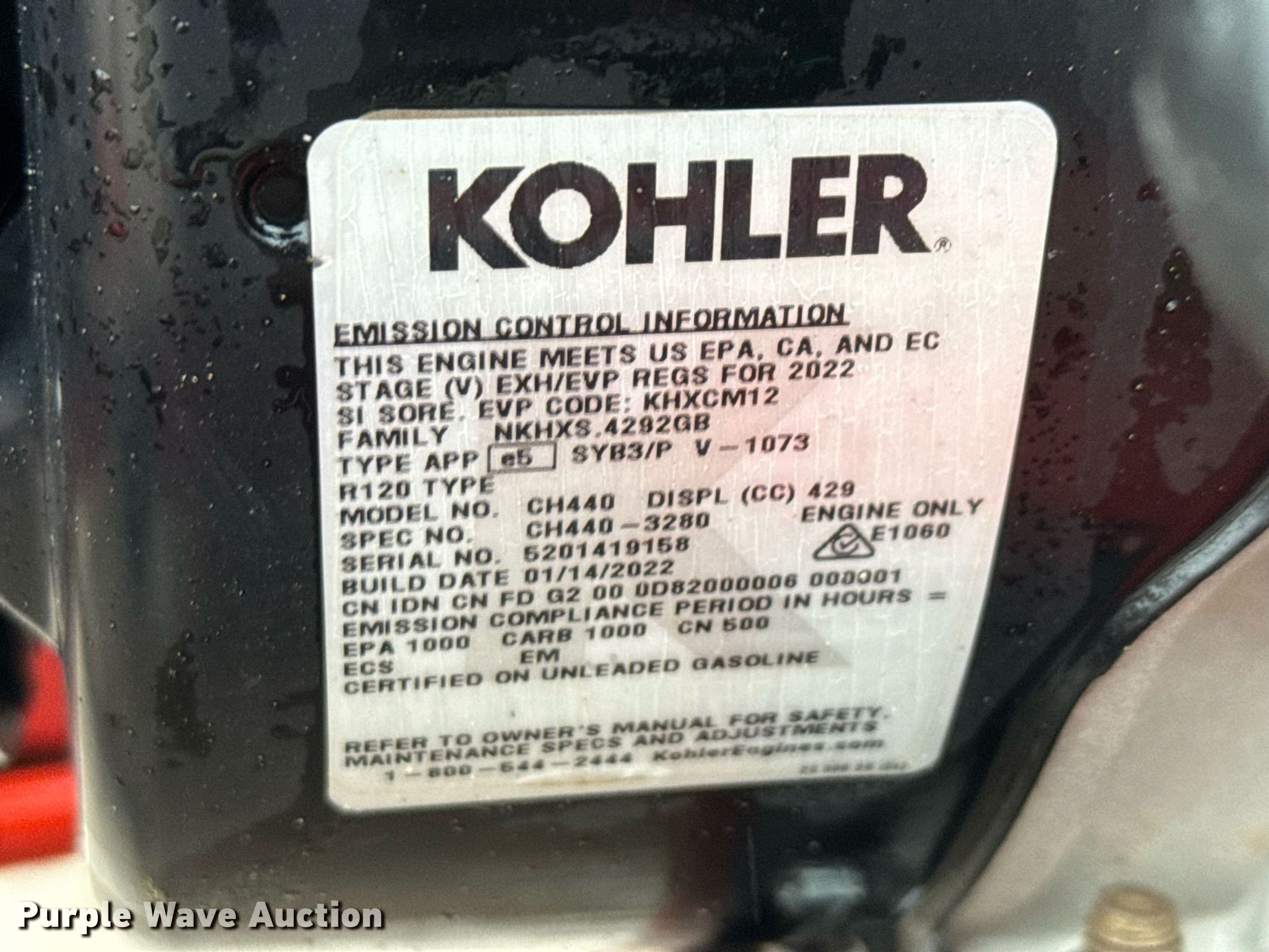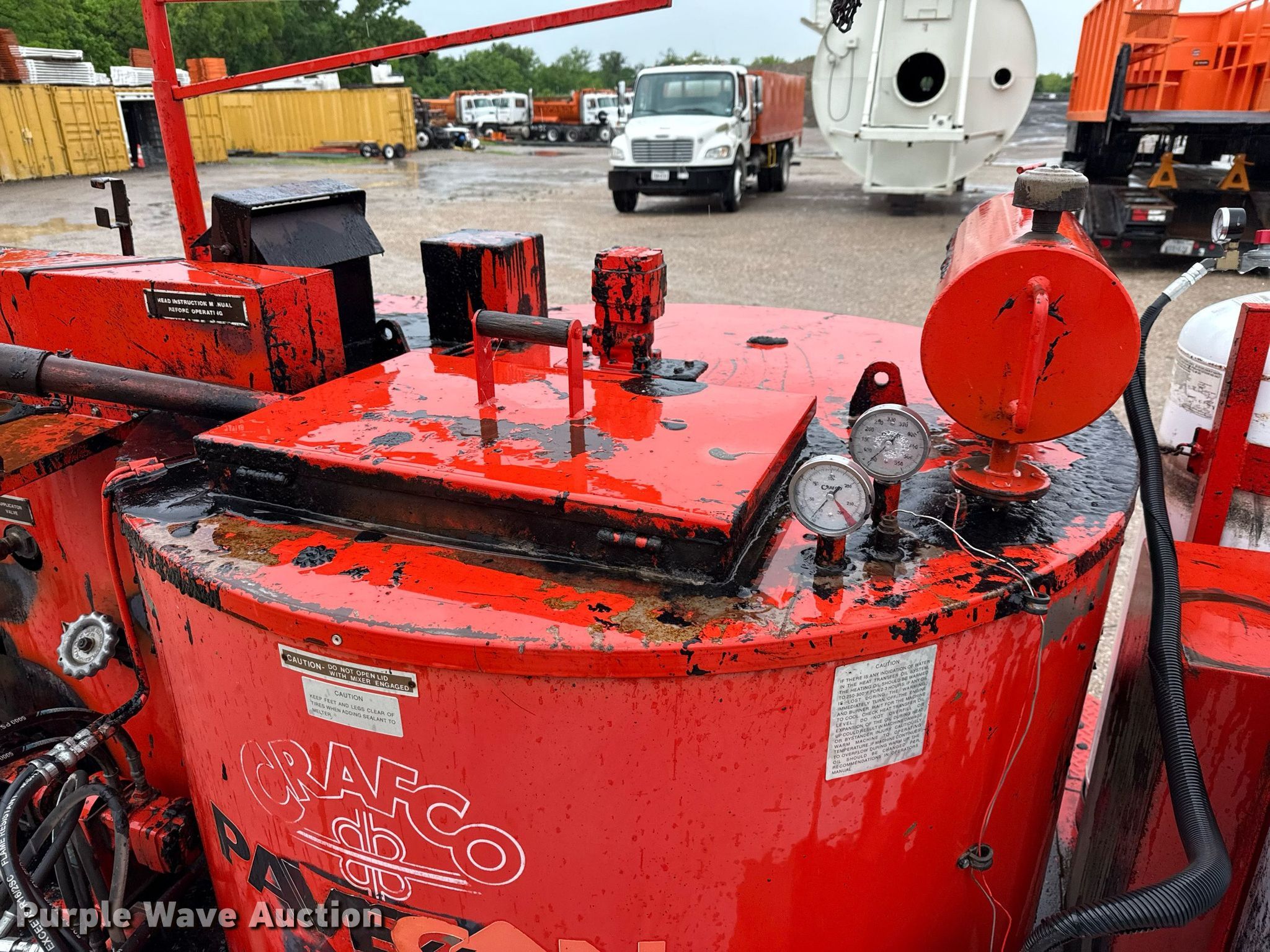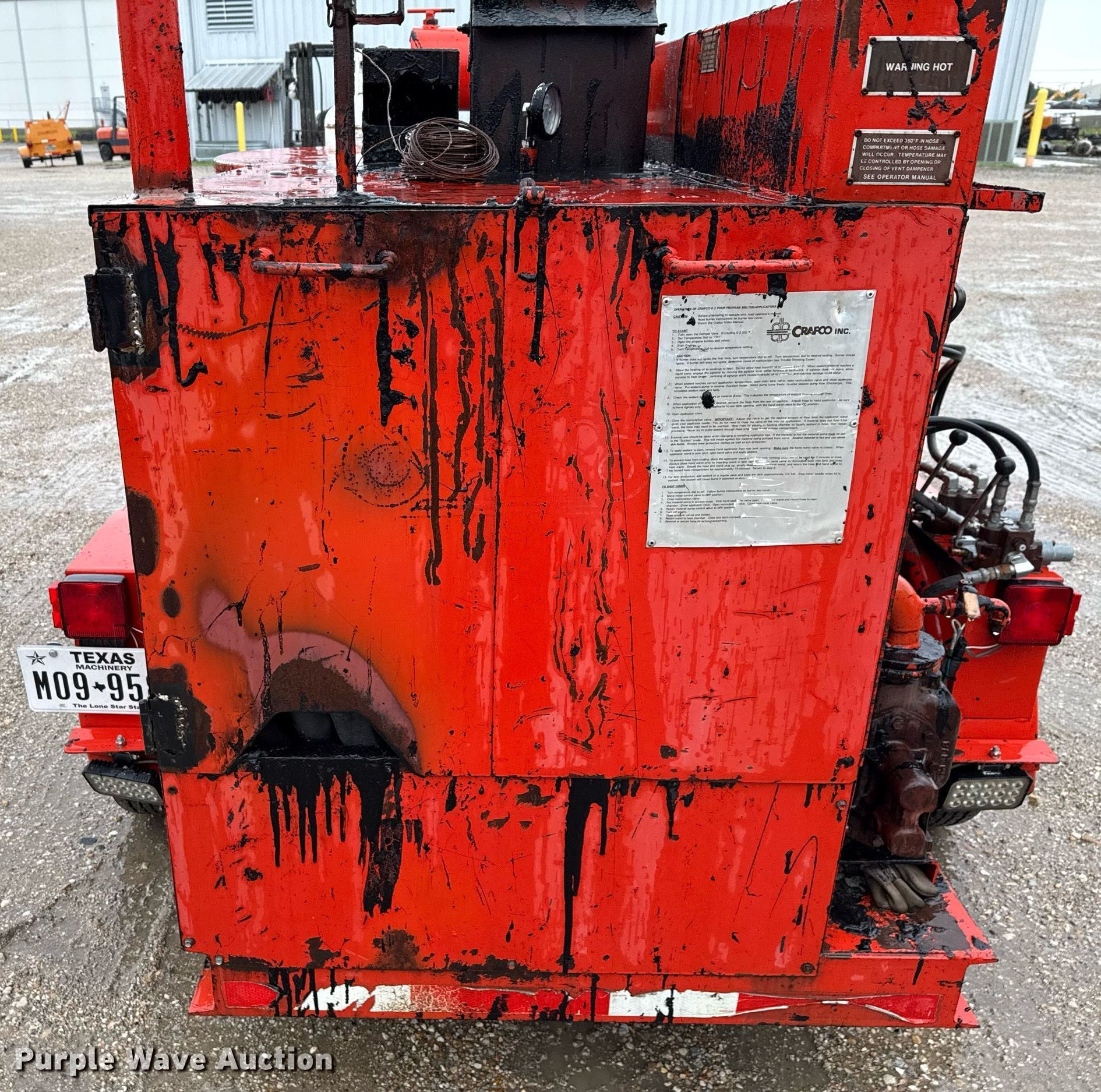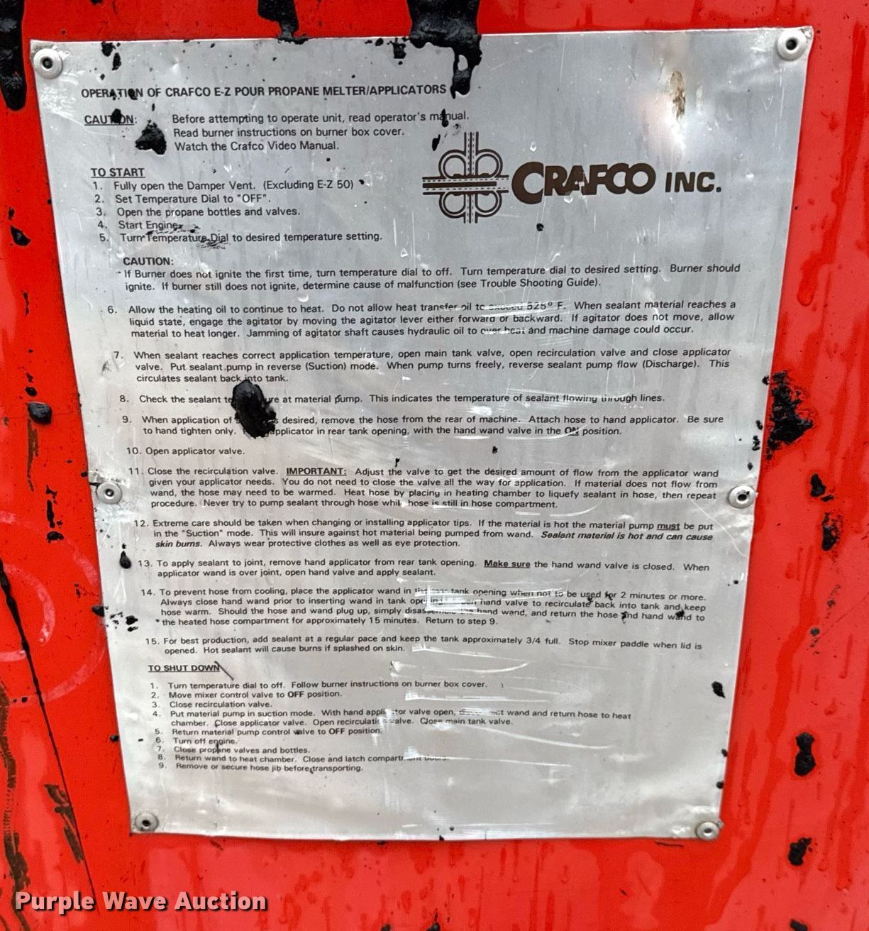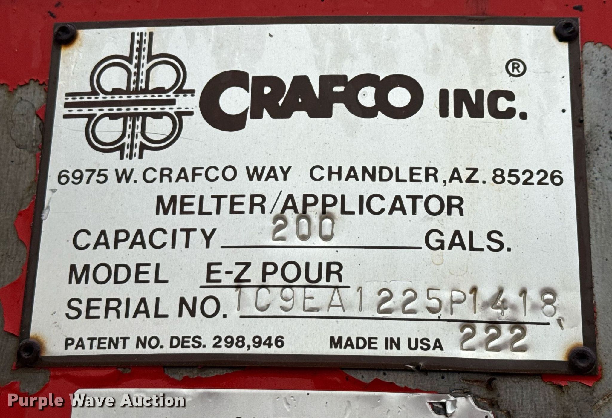 2022 Crafco E-Z Pour melter applicator. Serial: 1C9EA1225P1418. Engine Kohler CH440, Serial: 5201419158, Displacement: 429 cc, Cylinders: 1, Fuel type: Gas, HP: 14. Features Tank Capacity: 200 gallons, Ball hitch: 2 5/16". Tires Size: 205/75R14. Transfer of ownership documentation will be a bill of sale. Grand Prairie, TX 75050