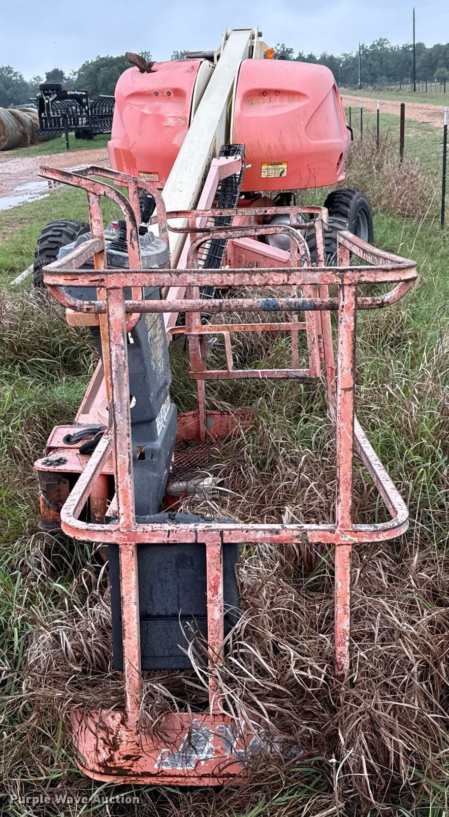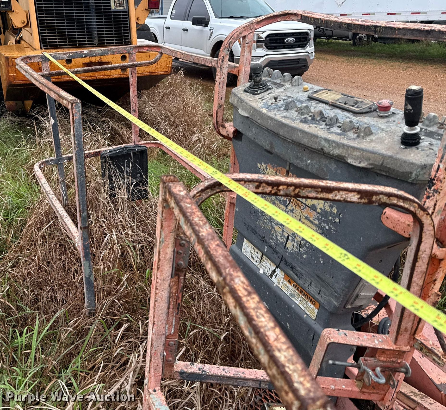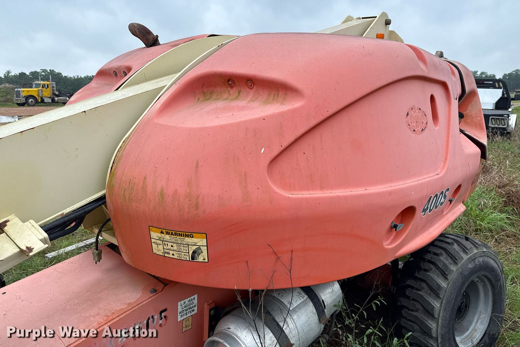 2001 JLG 400S boom lift. Hours: 5,729 on meter, Serial: 0300060777. Engine Cylinders: 4, Fuel type: Dual fuel. Electric Motor Volts: 12. Chassis Four wheel drive. Features Rough terrain, Boom type: Telescopic, Maximum lift capacity: 1,000 lbs, Maximum reach length: 34', Maximum lift height: 40', Platform: 96" L x 30" W, AC power outlet, Controls: Platform, Ground, Platform rotation: Hydraulic. Tires Tire size: 12-16.5. Notes Non-operational unit. Lee County Crawlers, LLC. Giddings, TX 78942