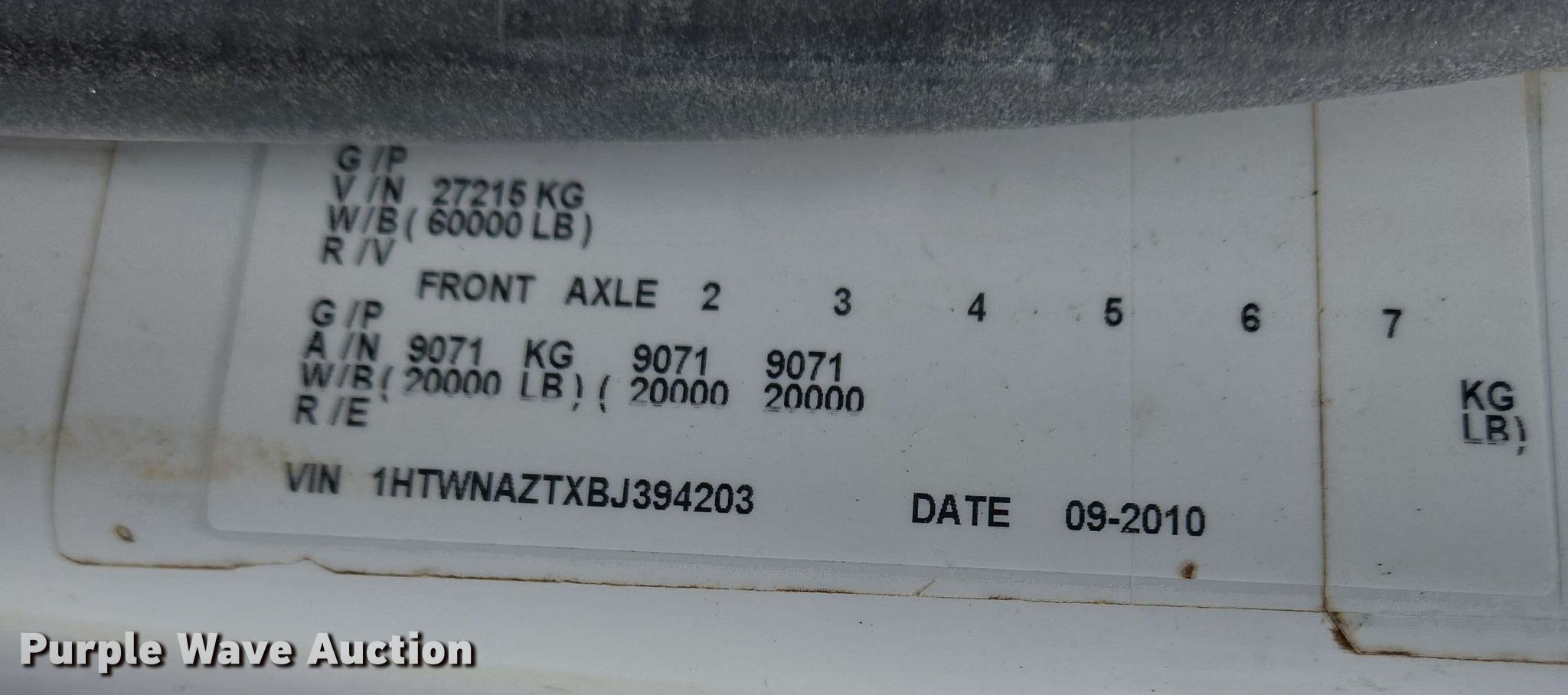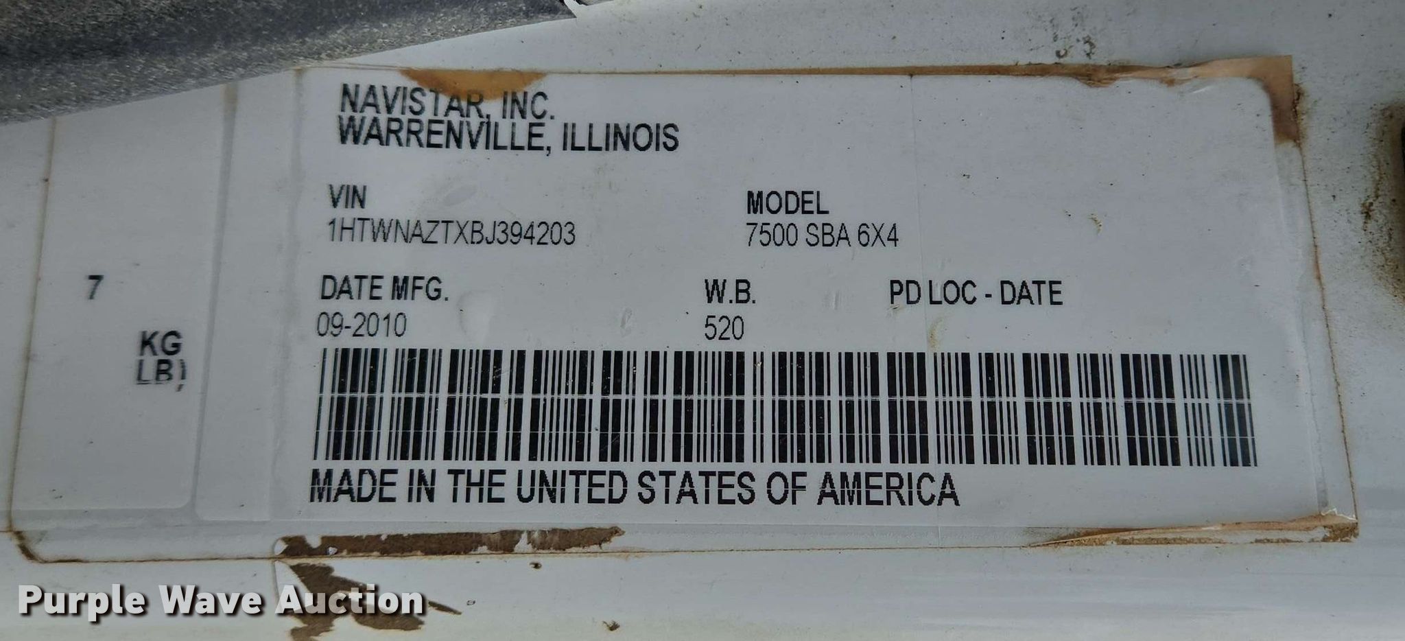 2011 International 7500 water truck. Miles: 110,626 on odometer, Hours: 10,453 on meter, VIN: 1HTWNAZTXBJ394203. Engine International MaxxForce 10, Displacement: 9.3L, Cylinders: 6, Fuel type: Diesel. Transmission Allison, Automatic. Chassis Axles: Tandem, Differential lock: Inter-axle, Suspension: Spring over walking beam, Brakes: Air, PTO, GVWR: 60,000 lbs. Interior AC, Heat, Heated mirrors, Cruise control, Auxiliary controls. Features Bed / tank Capacity: 4,000 gallons, 15' L x 8' W, Spray bar: Front, Rear, Side discharge, Hose reel, Top fill, Rear drain: 3". Tires Front: 425/65R22.5, Rear: 11R22.5. Notes Possible ECM issues, Flat tire, Dead battery, Unknown operating condition. Missouri title. Title distribution may be delayed up to 30 days from verification of funds. A&M Engineering and Environmental. Potosi, MO 63664