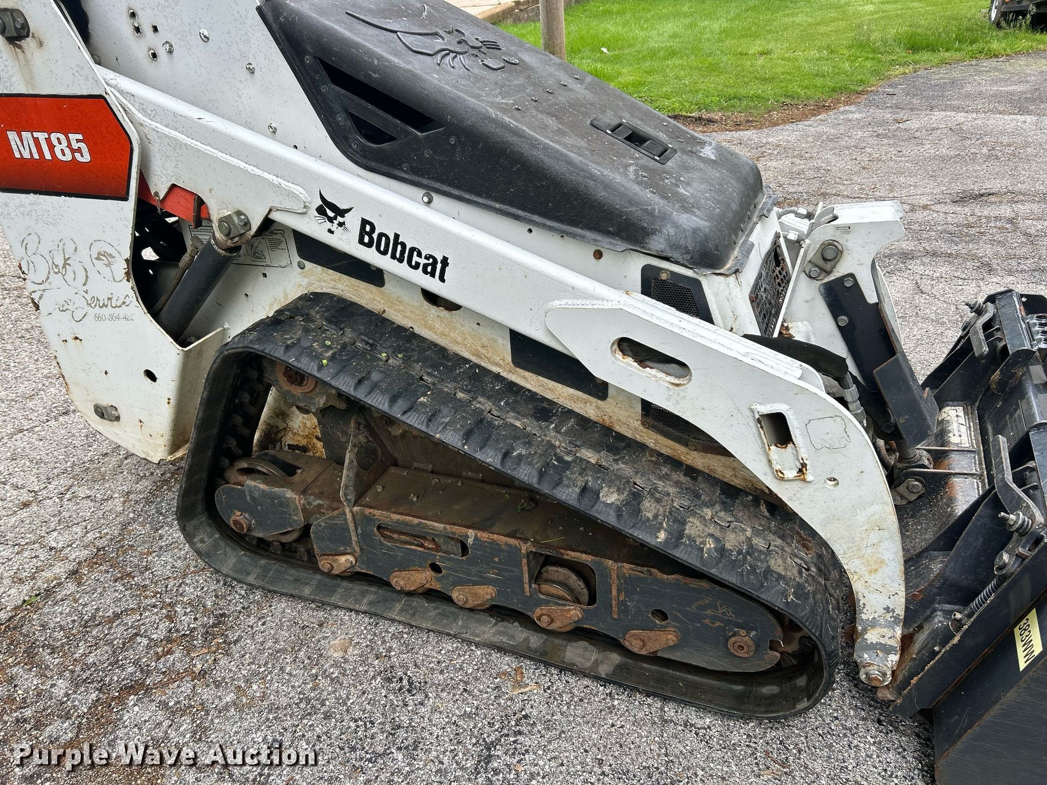 2016 Bobcat MT85 compact utility loader. Hours: 1,951 on meter, Miles or hours may vary, unit still in use, Serial: B3TR11368. Engine Kubota, Displacement: 0.898L, Cylinders: 3, Fuel type: Diesel. Transmission Hydrostatic. Operators station Bucket control: Hand. Features Auxiliary hydraulics, Quick coupler: Manual, Bucket Bobcat, Width: 44", Teeth: Bolt-on. Tracks Width: 9.5". McCaw's Wrecking LLC. Saint Louis, MO 63135