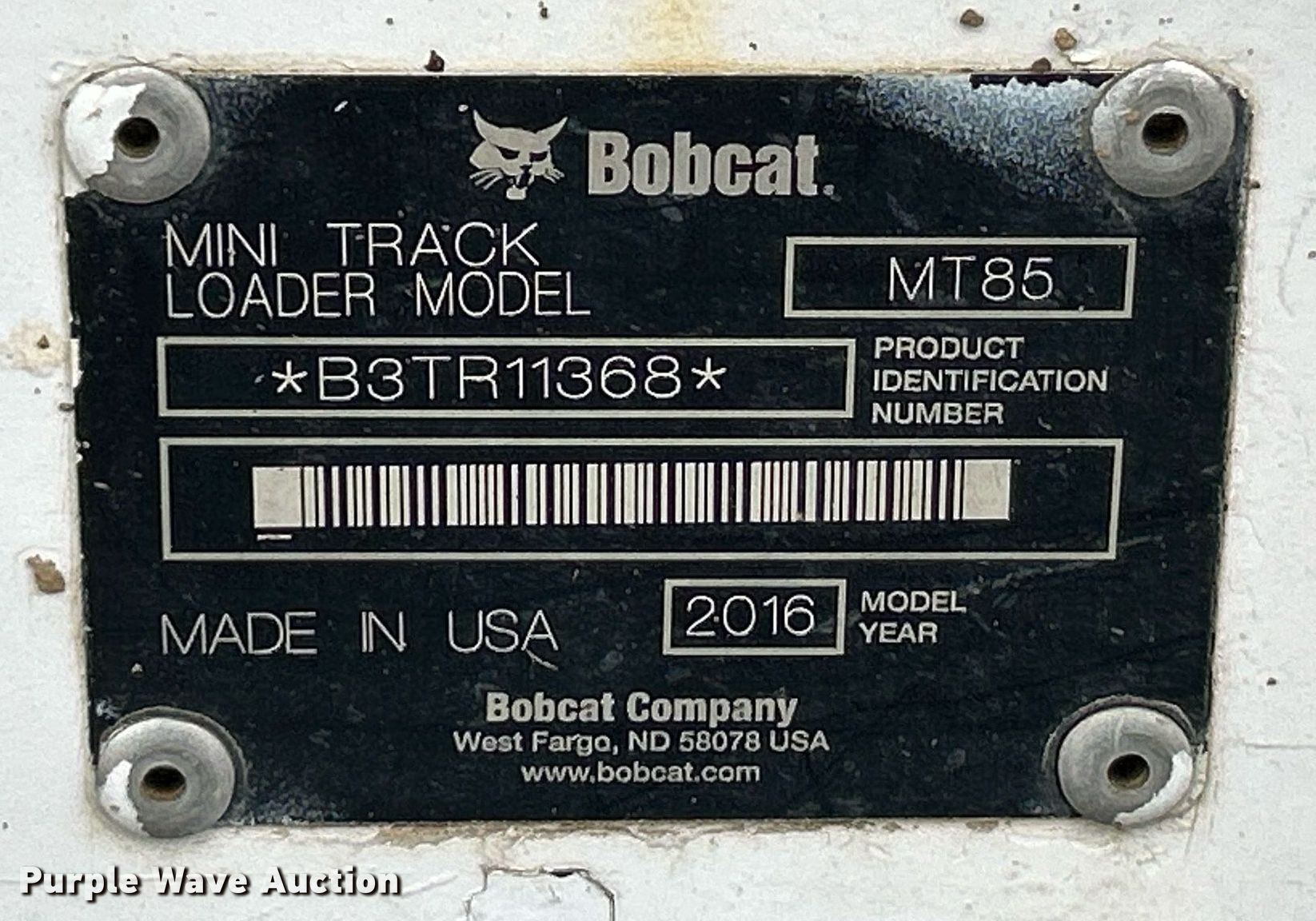 Purple Wave is selling a used Compact Utility Loader in Missouri. This item is a 2016 Bobcat MT85 compact utility loader with the following: Hours: 1,951 on meter, Miles or hours may vary, unit still in use, Serial: B3TR11368