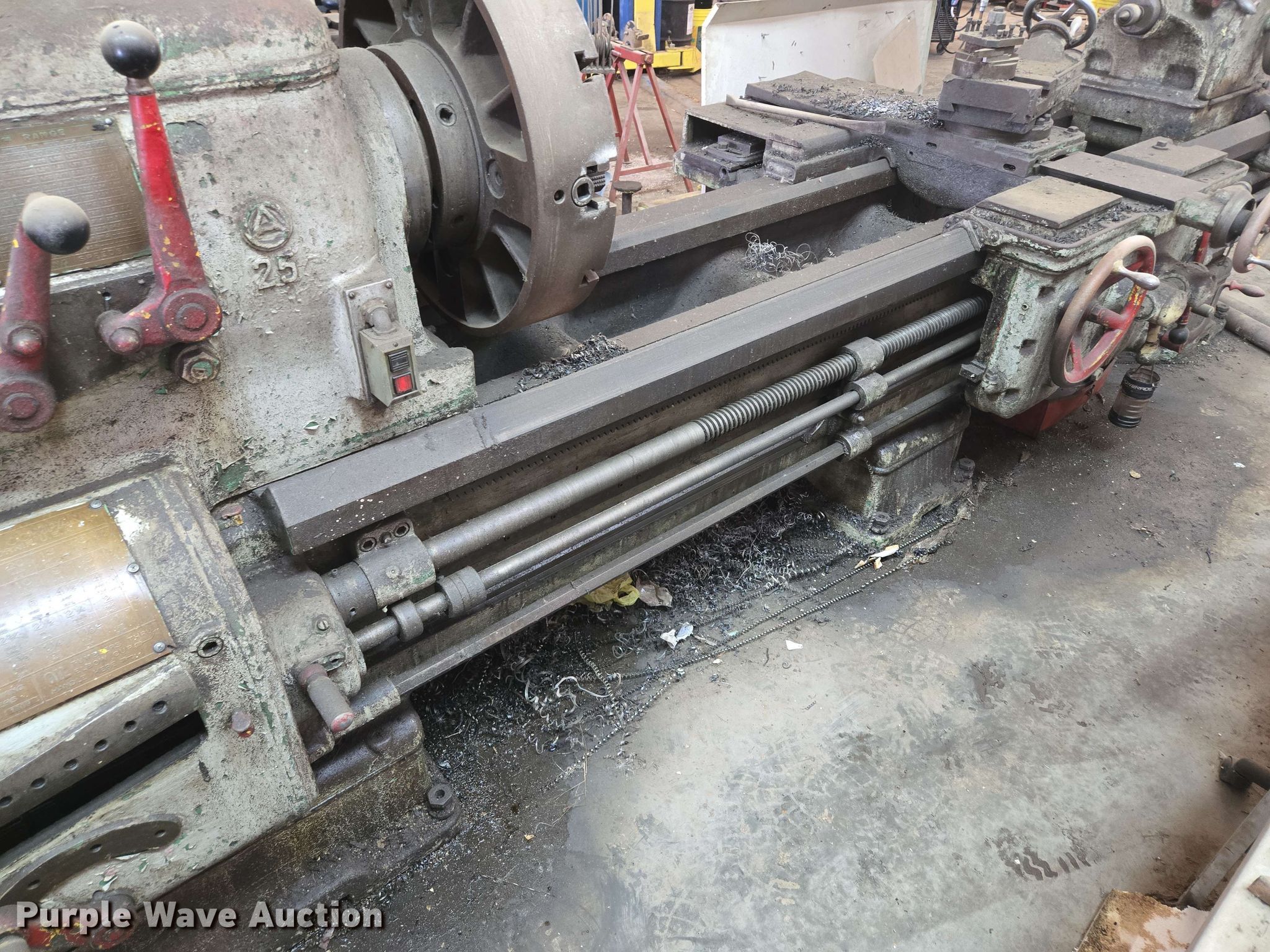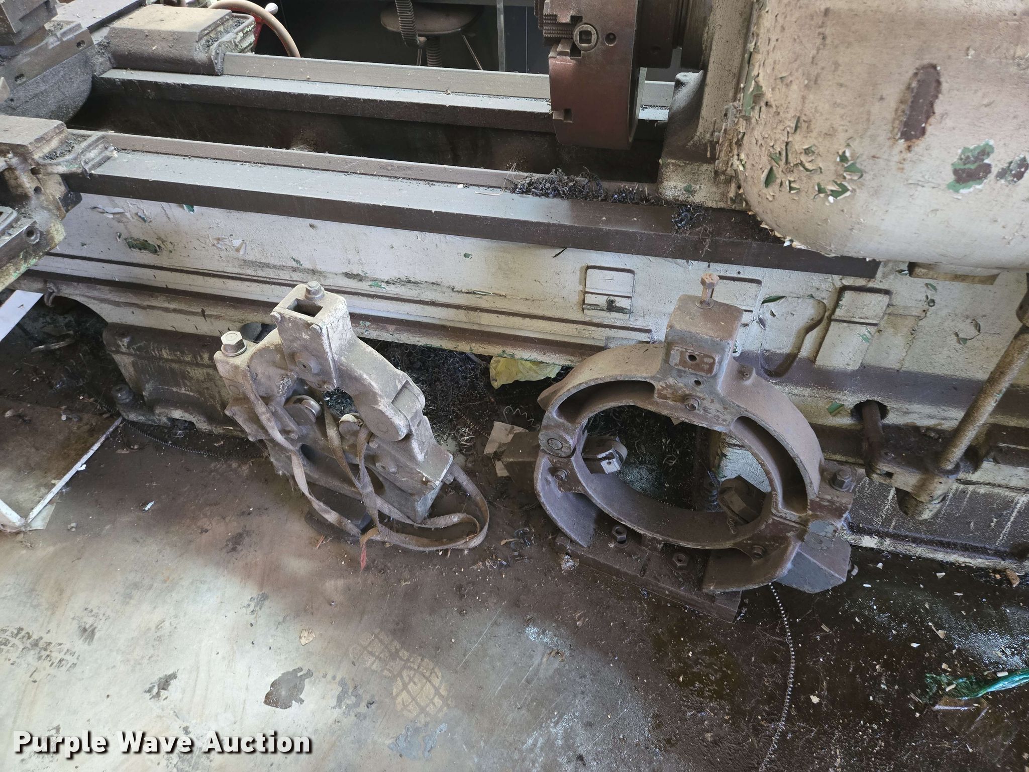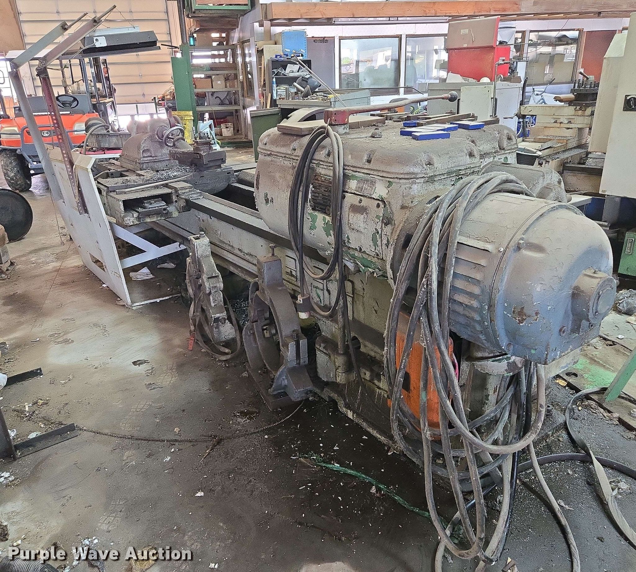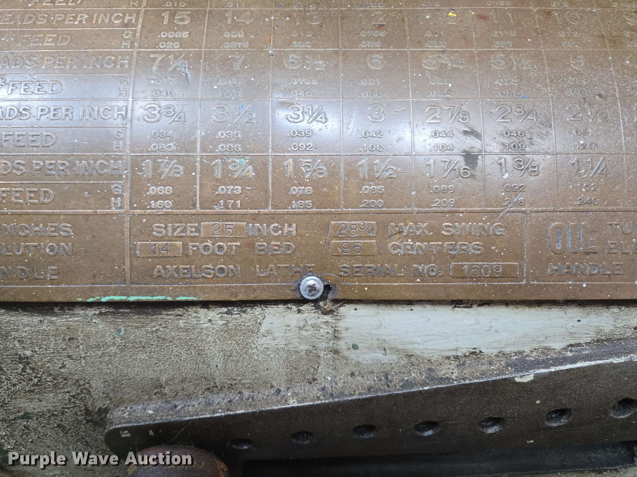 Axelson lathe. Serial: 1609. Electric Motor Westinghouse Electric, Volts: 220/440, Phase: Three. Features Size: 25", Maximum swing: 28 1/2", Bed: 14', Centers: 96", Clamp head Diameter: 24", Adjustable, Length adjustment: Manual. Notes (2) additional pipe clamps, Self-standing light fixture. Gary Sisk Drilling. Odessa, MO 64076