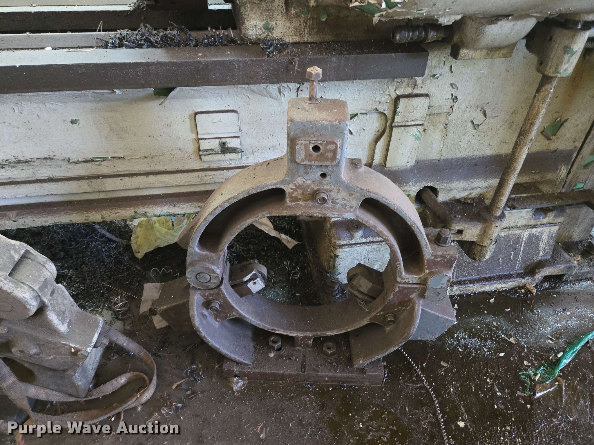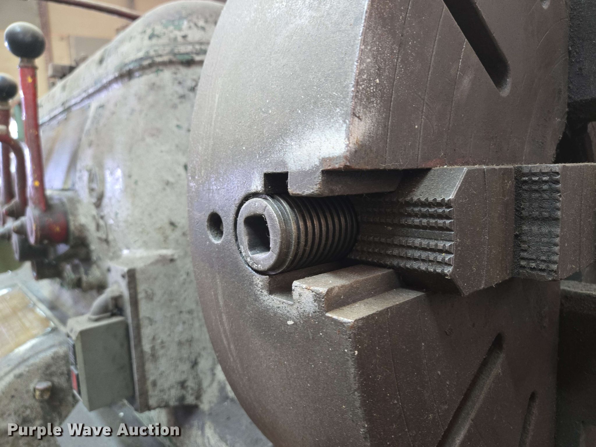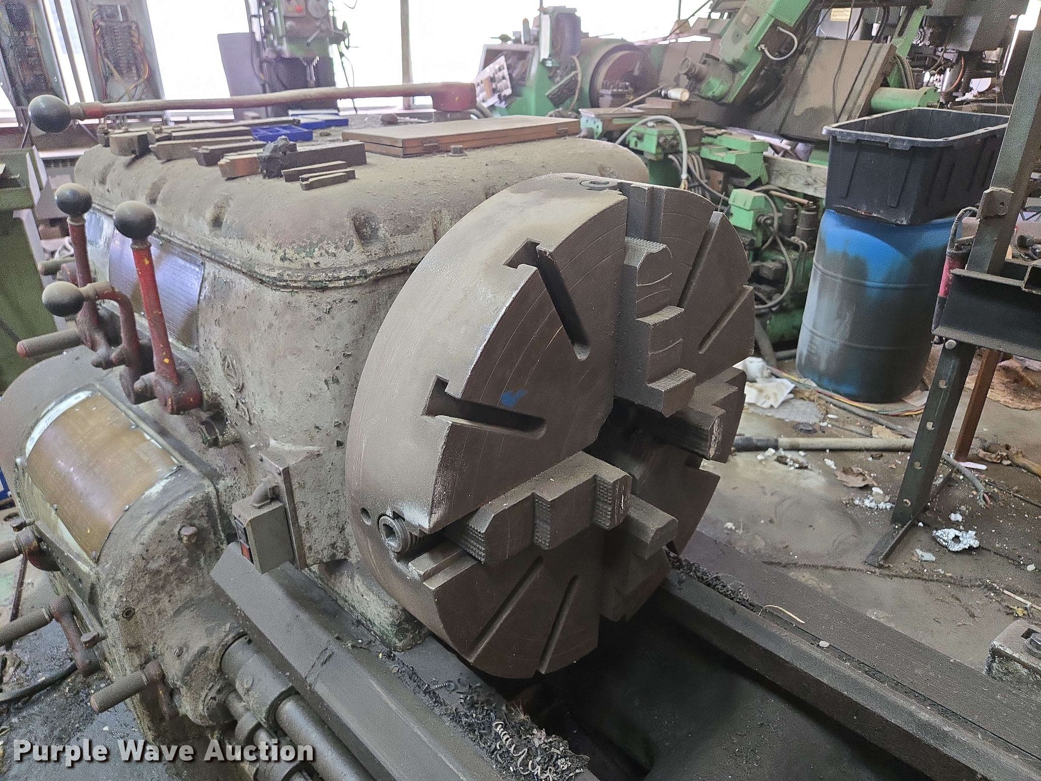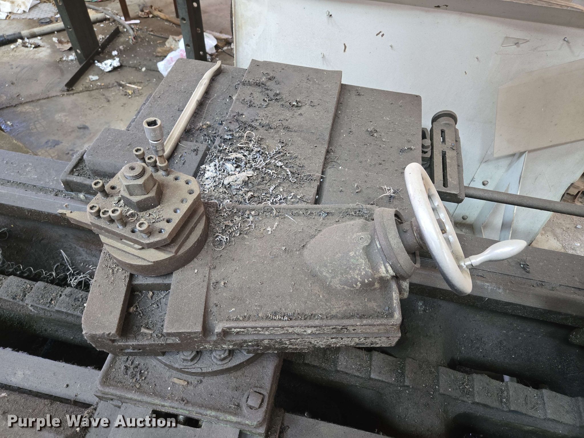 Axelson lathe. Serial: 1609. Electric Motor Westinghouse Electric, Volts: 220/440, Phase: Three. Features Size: 25", Maximum swing: 28 1/2", Bed: 14', Centers: 96", Clamp head Diameter: 24", Adjustable, Length adjustment: Manual. Notes (2) additional pipe clamps, Self-standing light fixture. Gary Sisk Drilling. Odessa, MO 64076