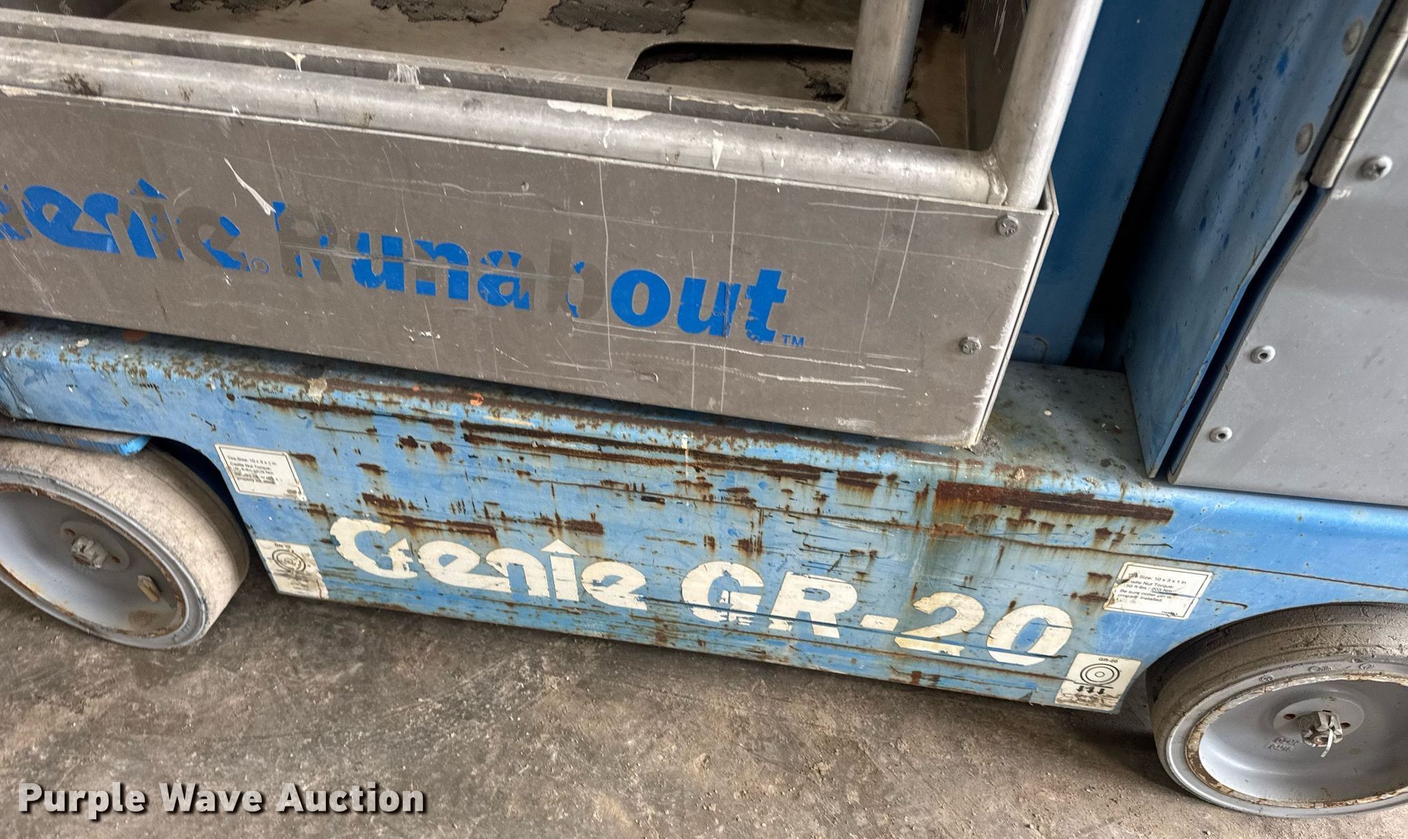 2012 Genie GR-20 vertical lift. Hours: 181 on meter, Serial: GR12-21437. Electric Motor HP: 8.3, kW: 6.2, Volts: 24. Features Maximum lift capacity: 350 lbs, Maximum lift height: 19' 9", Platform: 35" L x 26" W, AC power outlet, Controls: Platform, Ground, Platform extensions: Manual, Safety alarm. Tires Tire size: 10X3, Solid, Non-marking. T&R Equipment. New Bloomfield, MO 65080