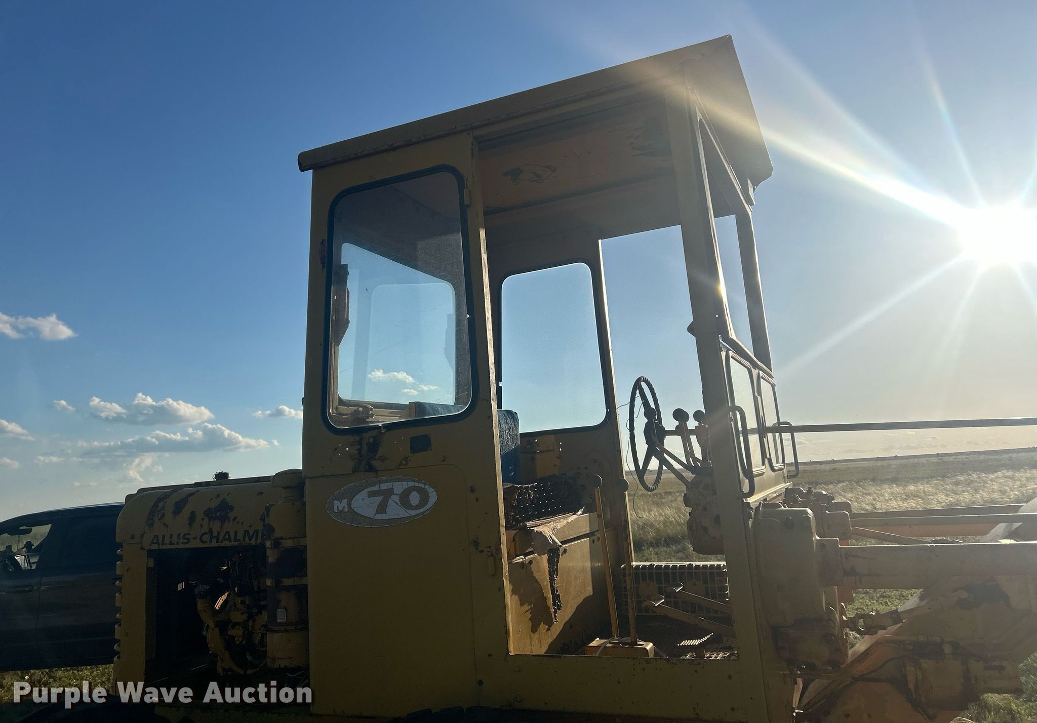 Allis-Chalmers M70 rigid frame motor grader. Hours: 1,144 on meter. Engine Cylinders: 6, Fuel type: Diesel. Transmission Direct-drive. Operators station Enclosed cab, Hydraulic control valves: 6. Features Moldboard: Tip control, Side shift. Tires Front: 13.00-24, Rear: 14.00-24. Notes Glass cracked, Driver door glass missing, Non-operational unit. Floyd, NM 88118