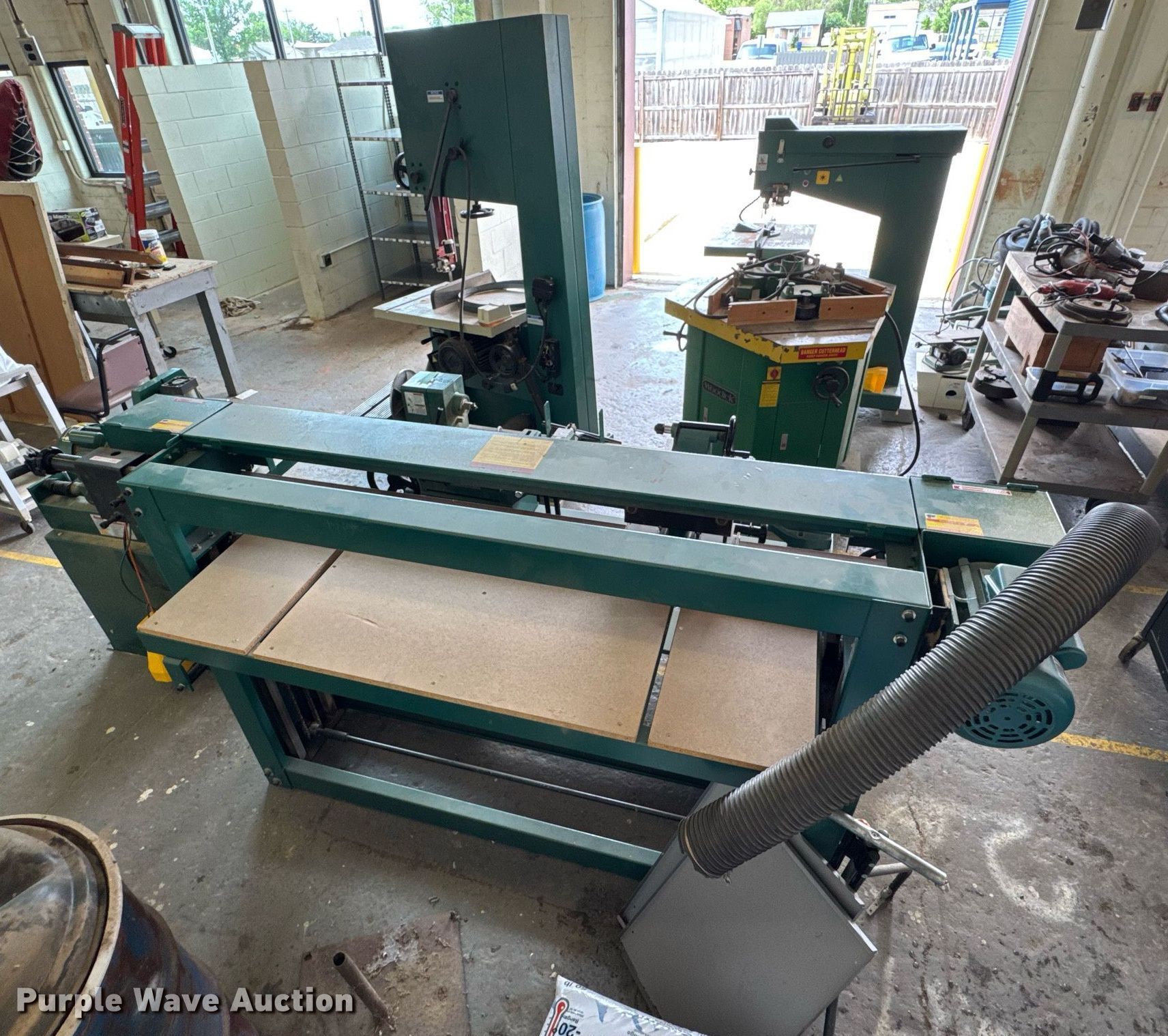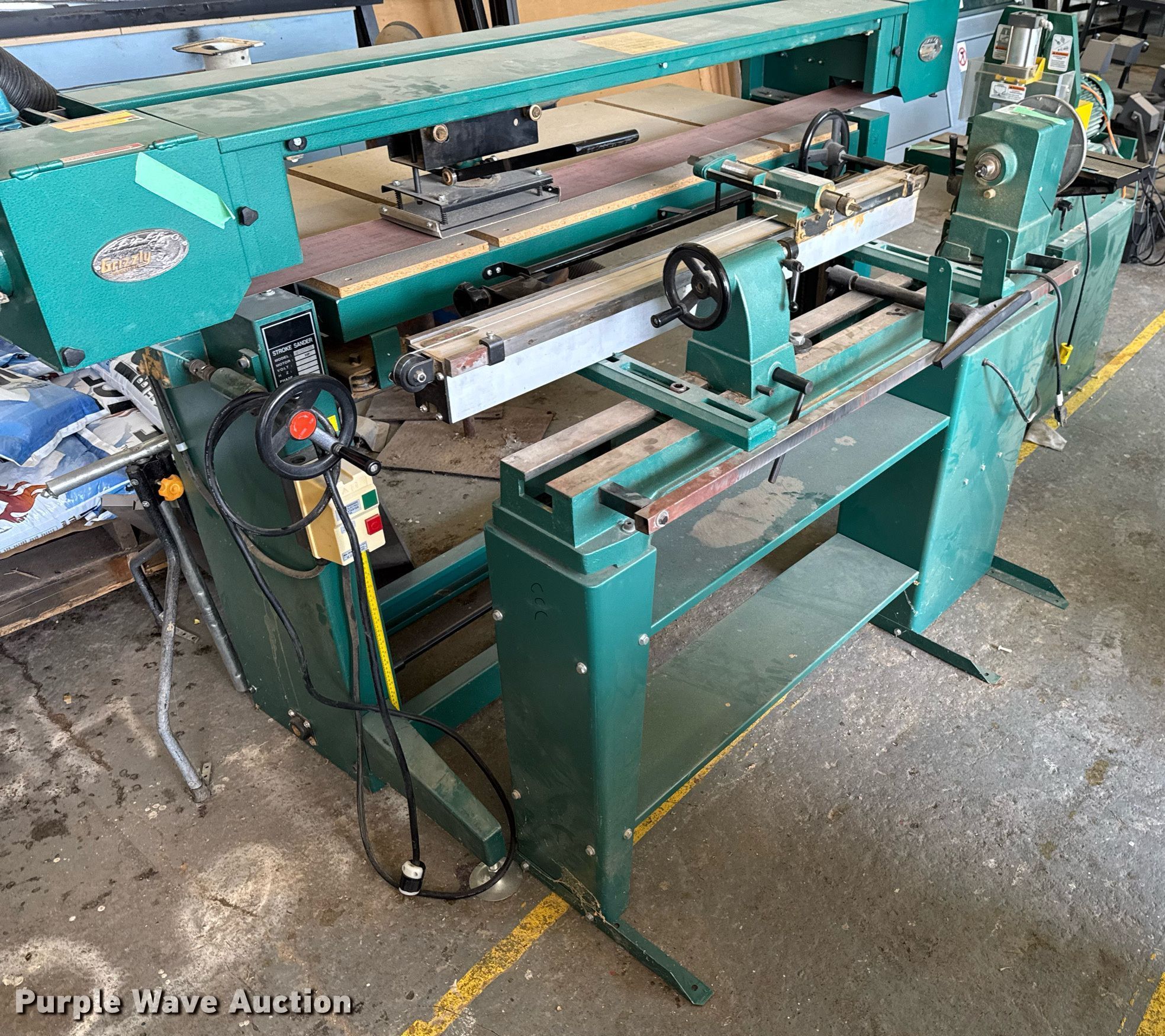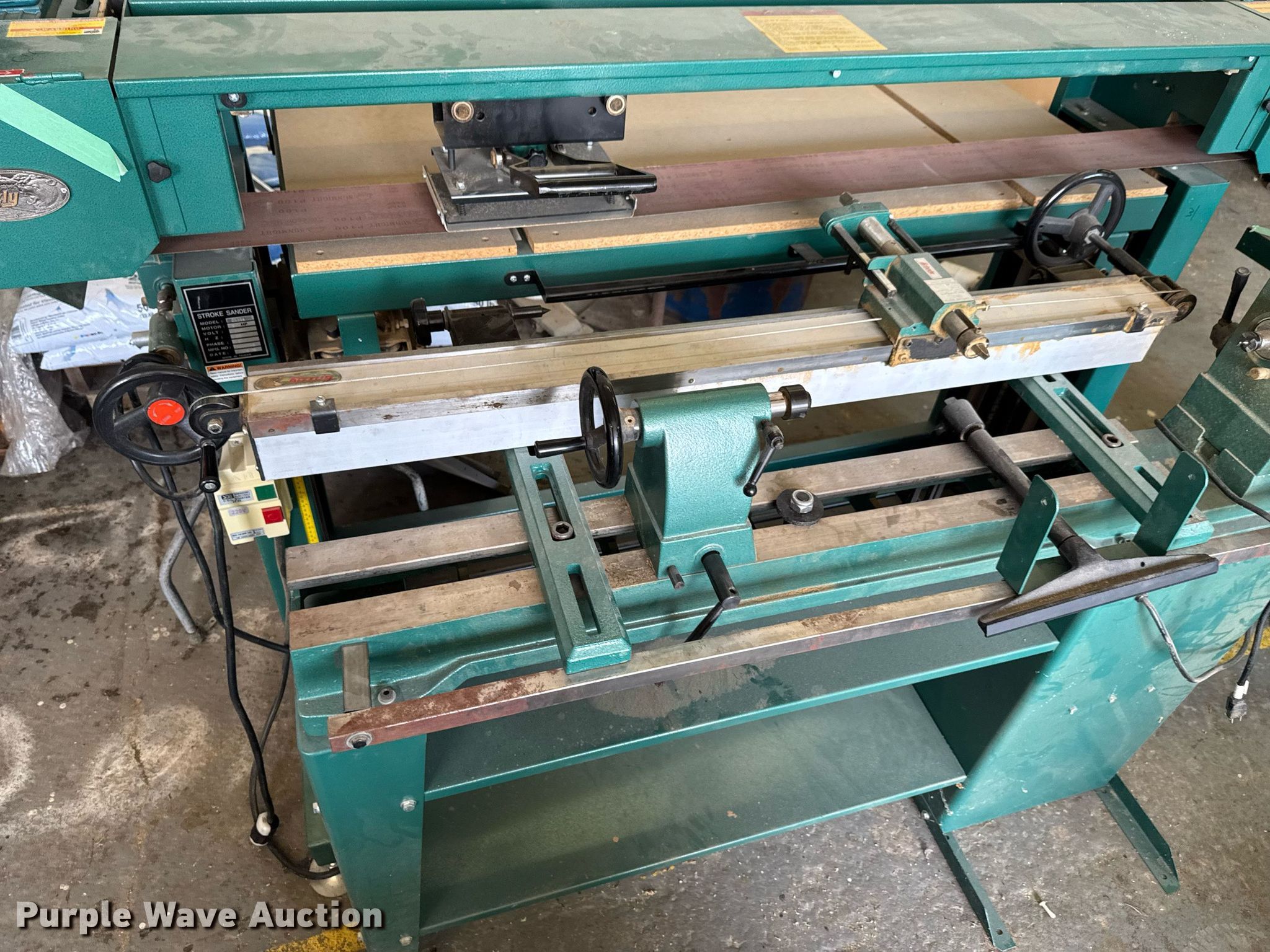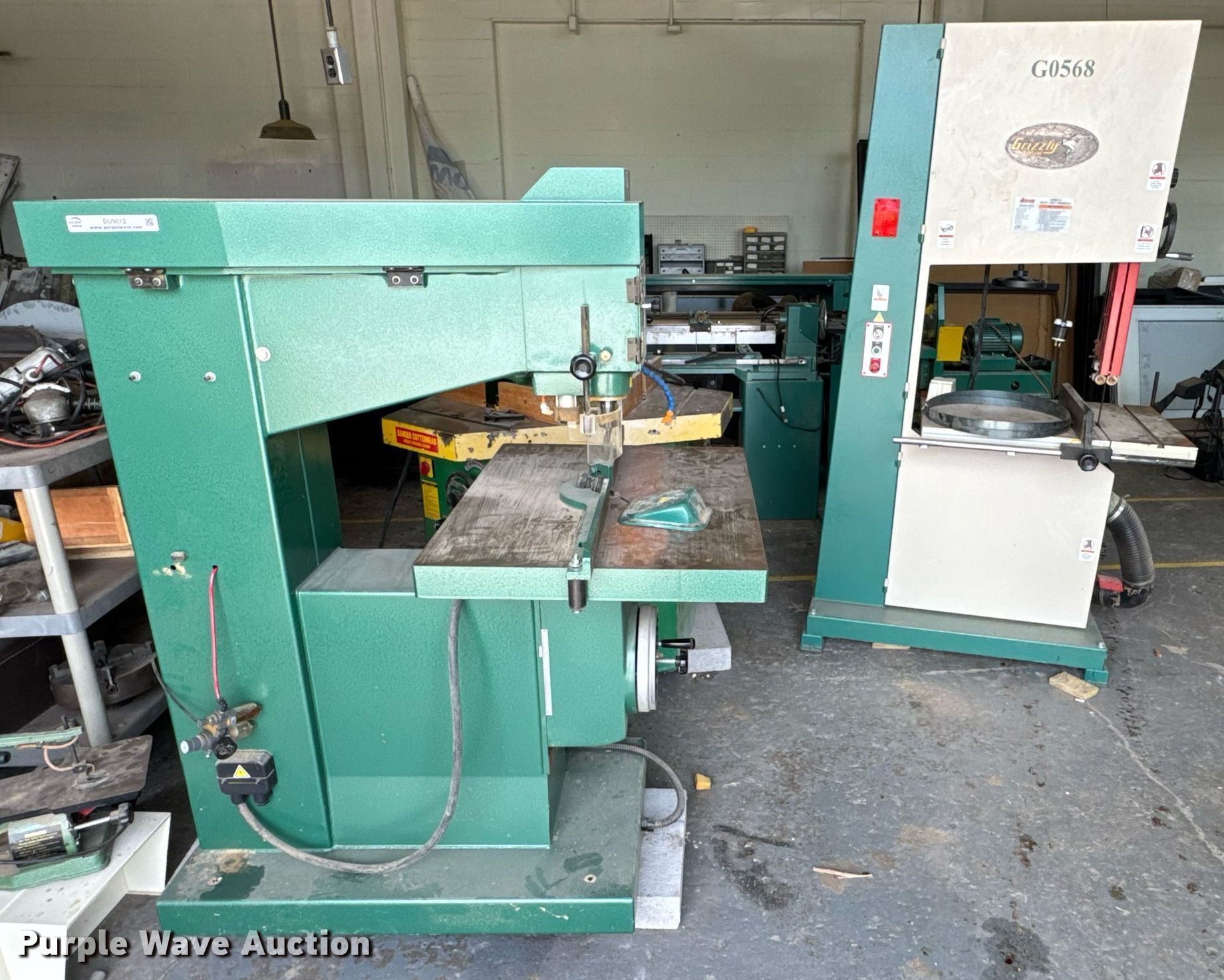 Purple Wave is selling a used Machine Shop Tools and Equip. in Kansas. This item is a Machine shop equipment with the following: Grizzly G9981 overarm router, Electric motor, Volts: 220, HP: 5, Phase: Three,, Woodtek 3-way router, Phase: Three, Grizzly G0568 24" band saw, Electric motor, Volts: 220, HP: 5, Phase: Single, Range: 1/4" to 1 1/2", Maximum cutting height: 16", Maximum width: 24 1.5", Grizzly 62891 wood lathe, Cutting depth: .2mm, Phase: Single, Grizzly G5394 Stroke Sander, HP: 3, Volts: 220, Phase: Single, Grizzly G4185 horizontal boring machine, Electric motor, Grizzly, Volts: 220, HP: 2, Phase: Single, Spindle travel: 3", Bit capacity: 9/16", Shop Fox W1833 Pocket Hole Machine, Volts: 120, HP: 1/2, Drill bit diameter: 3/8", Scroll saw, Volts: 115, HP: 1/8