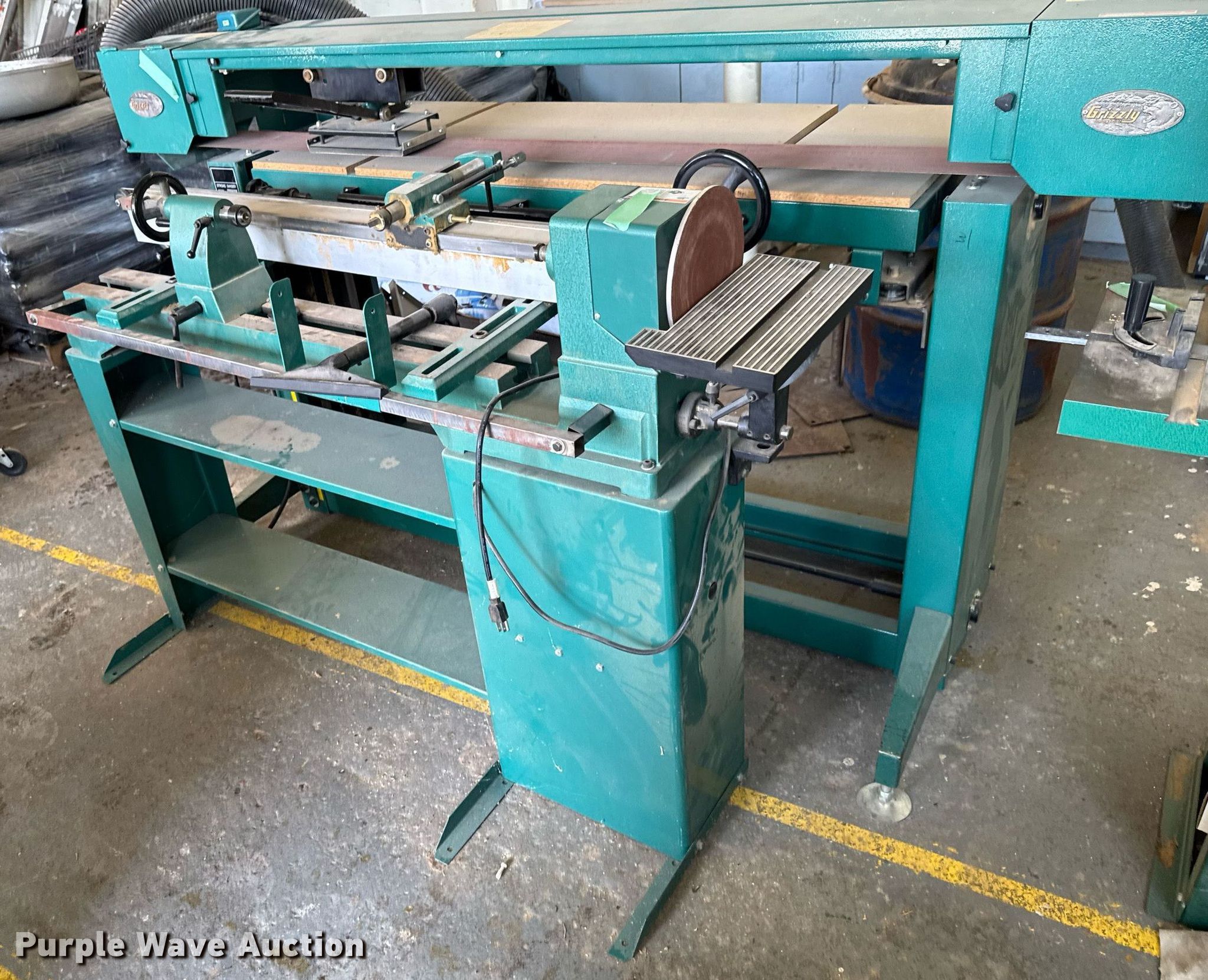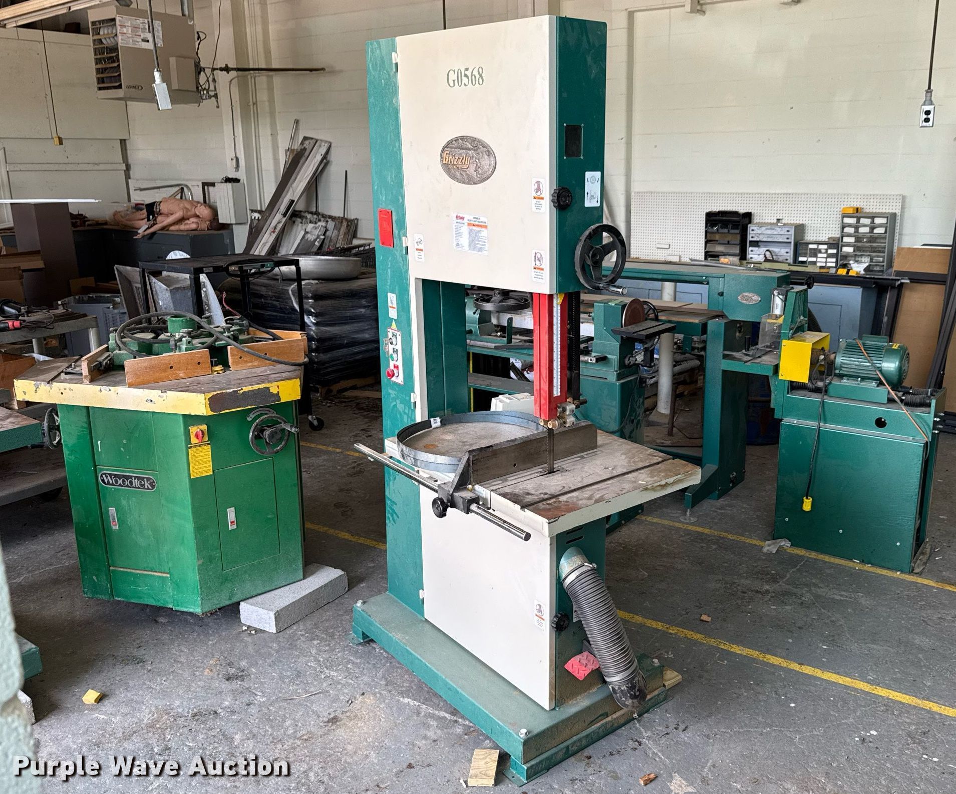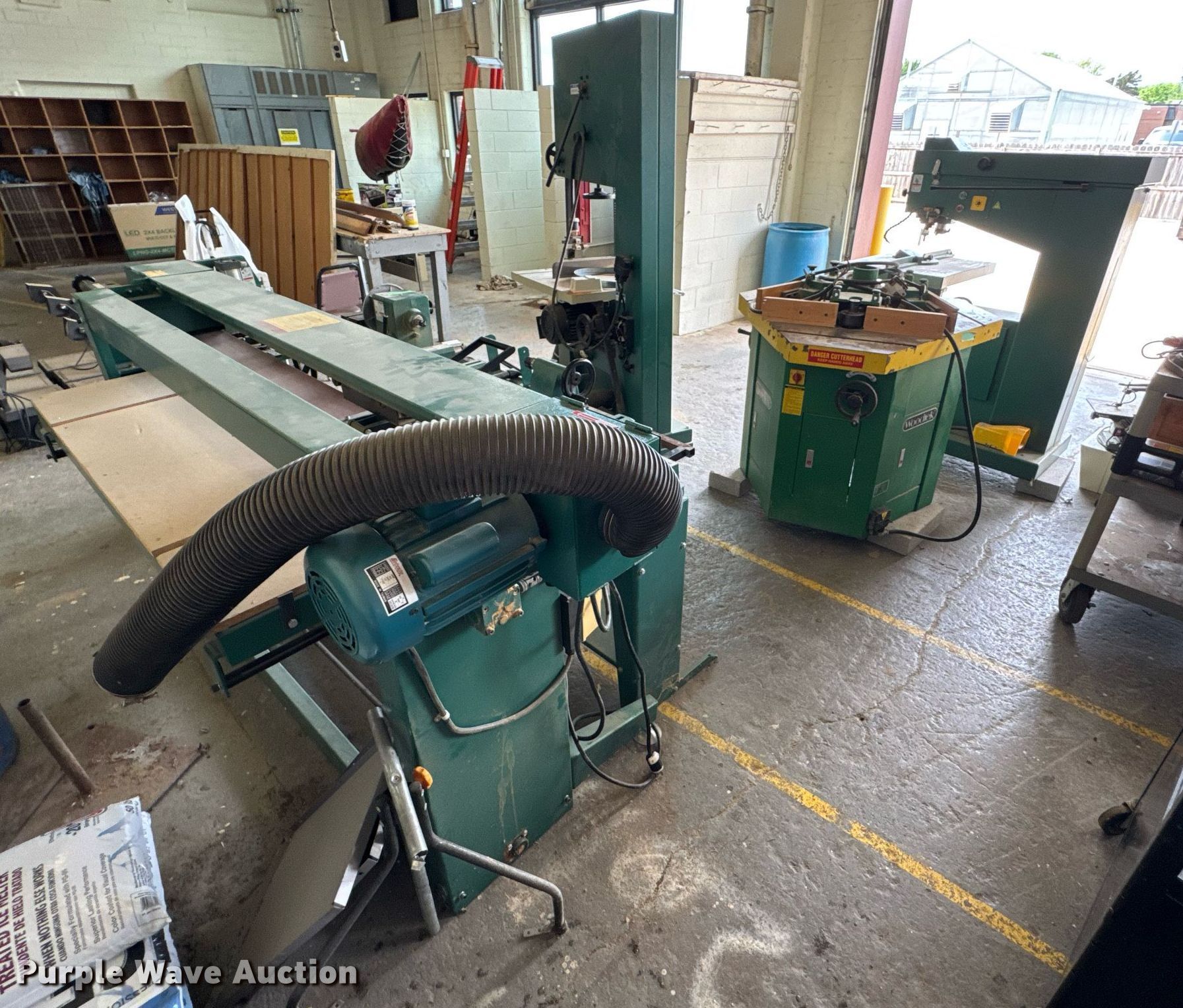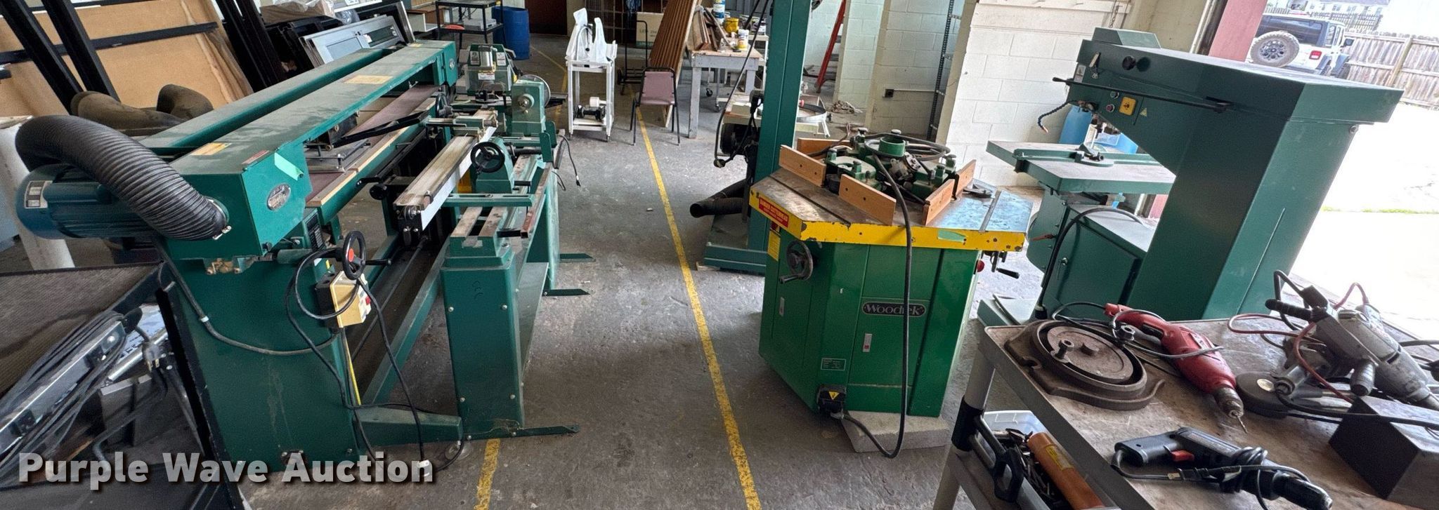 Purple Wave is selling a used Machine Shop Tools and Equip. in Kansas. This item is a Machine shop equipment with the following: Grizzly G9981 overarm router, Electric motor, Volts: 220, HP: 5, Phase: Three,, Woodtek 3-way router, Phase: Three, Grizzly G0568 24" band saw, Electric motor, Volts: 220, HP: 5, Phase: Single, Range: 1/4" to 1 1/2", Maximum cutting height: 16", Maximum width: 24 1.5", Grizzly 62891 wood lathe, Cutting depth: .2mm, Phase: Single, Grizzly G5394 Stroke Sander, HP: 3, Volts: 220, Phase: Single, Grizzly G4185 horizontal boring machine, Electric motor, Grizzly, Volts: 220, HP: 2, Phase: Single, Spindle travel: 3", Bit capacity: 9/16", Shop Fox W1833 Pocket Hole Machine, Volts: 120, HP: 1/2, Drill bit diameter: 3/8", Scroll saw, Volts: 115, HP: 1/8