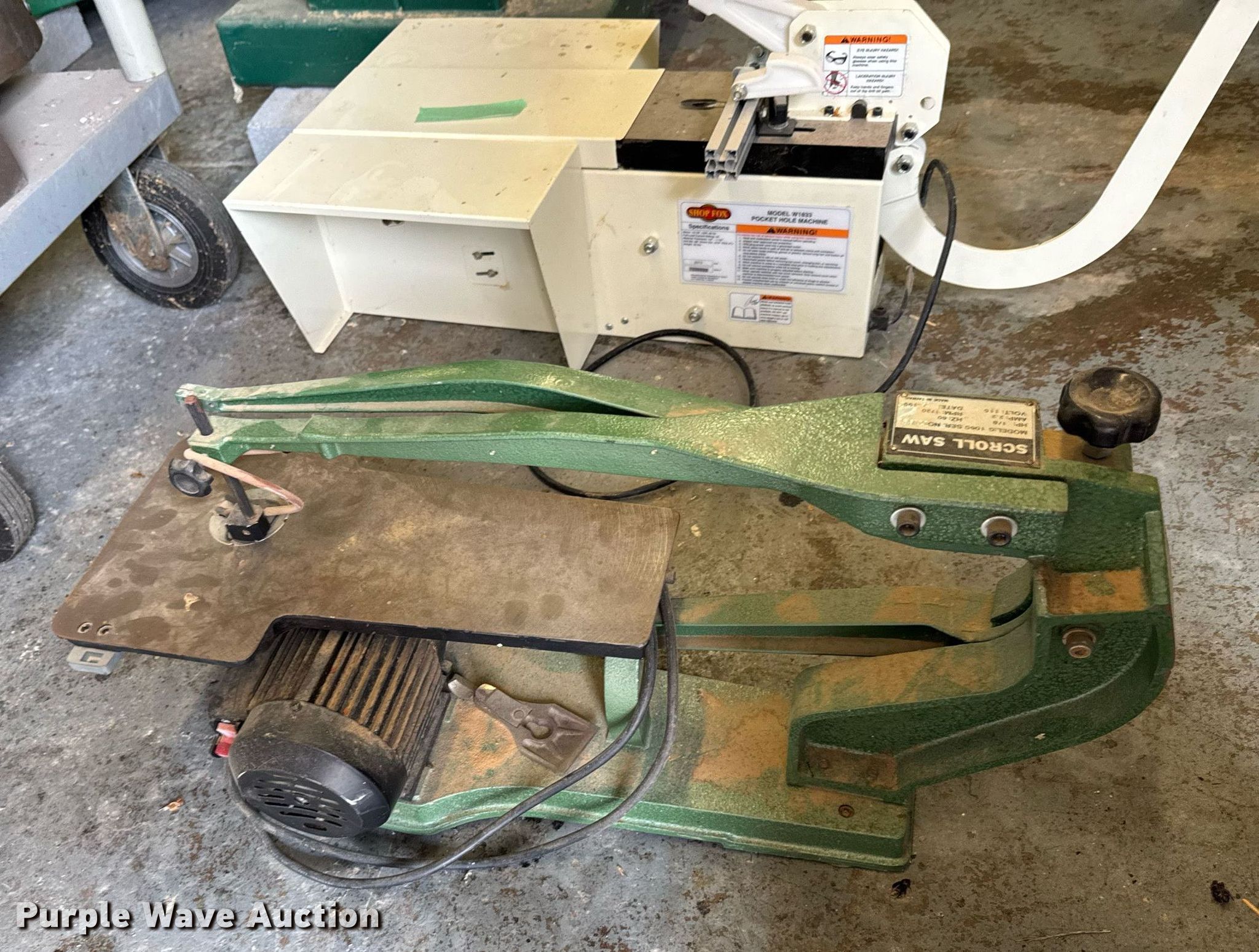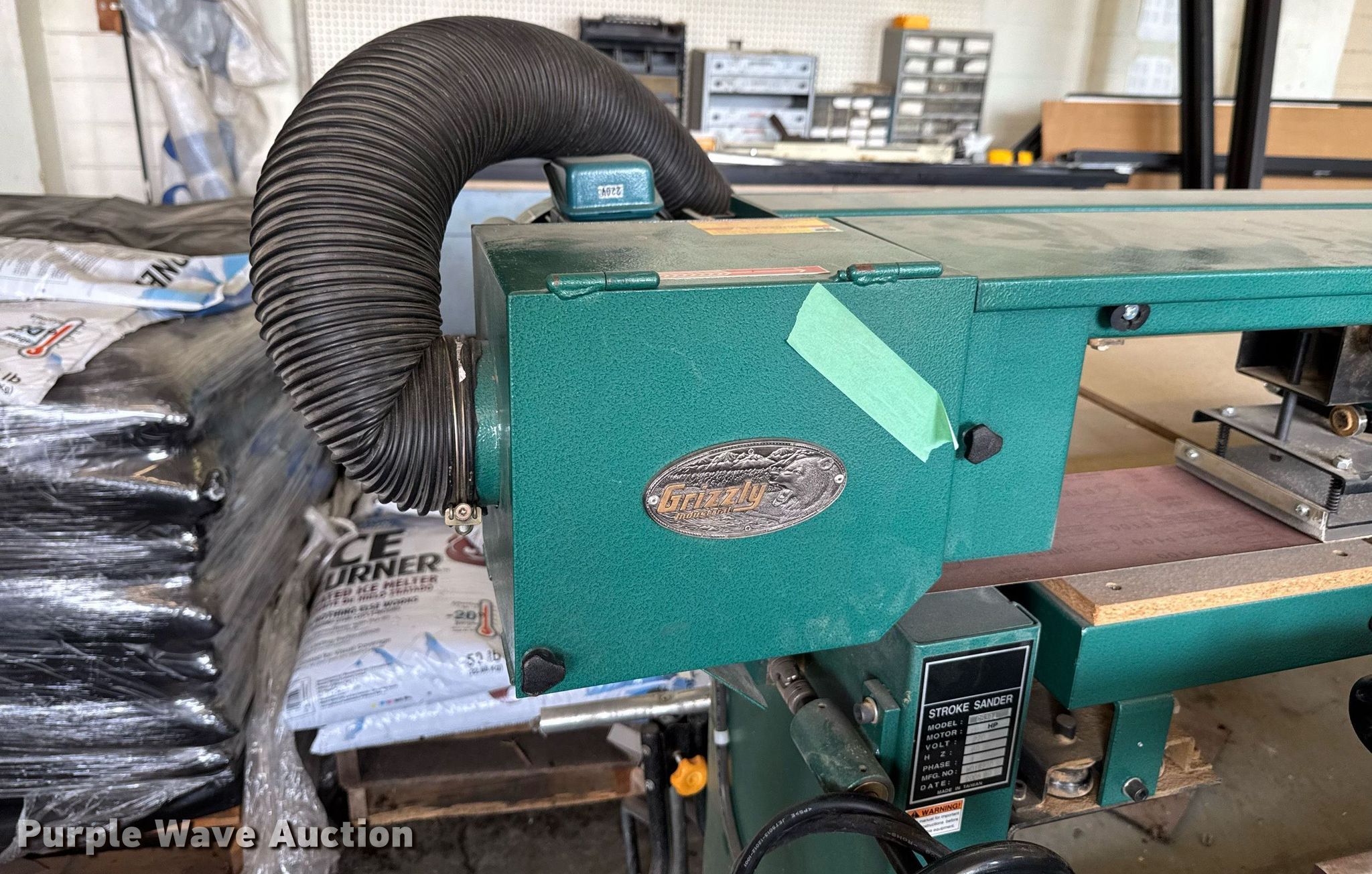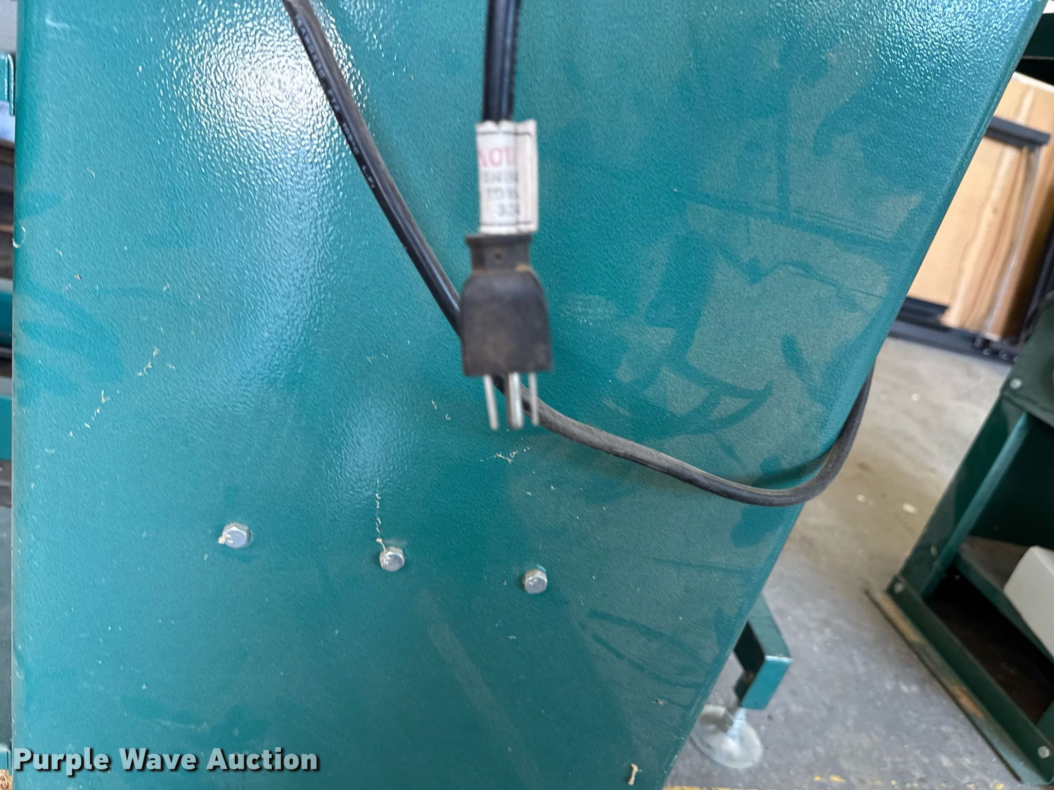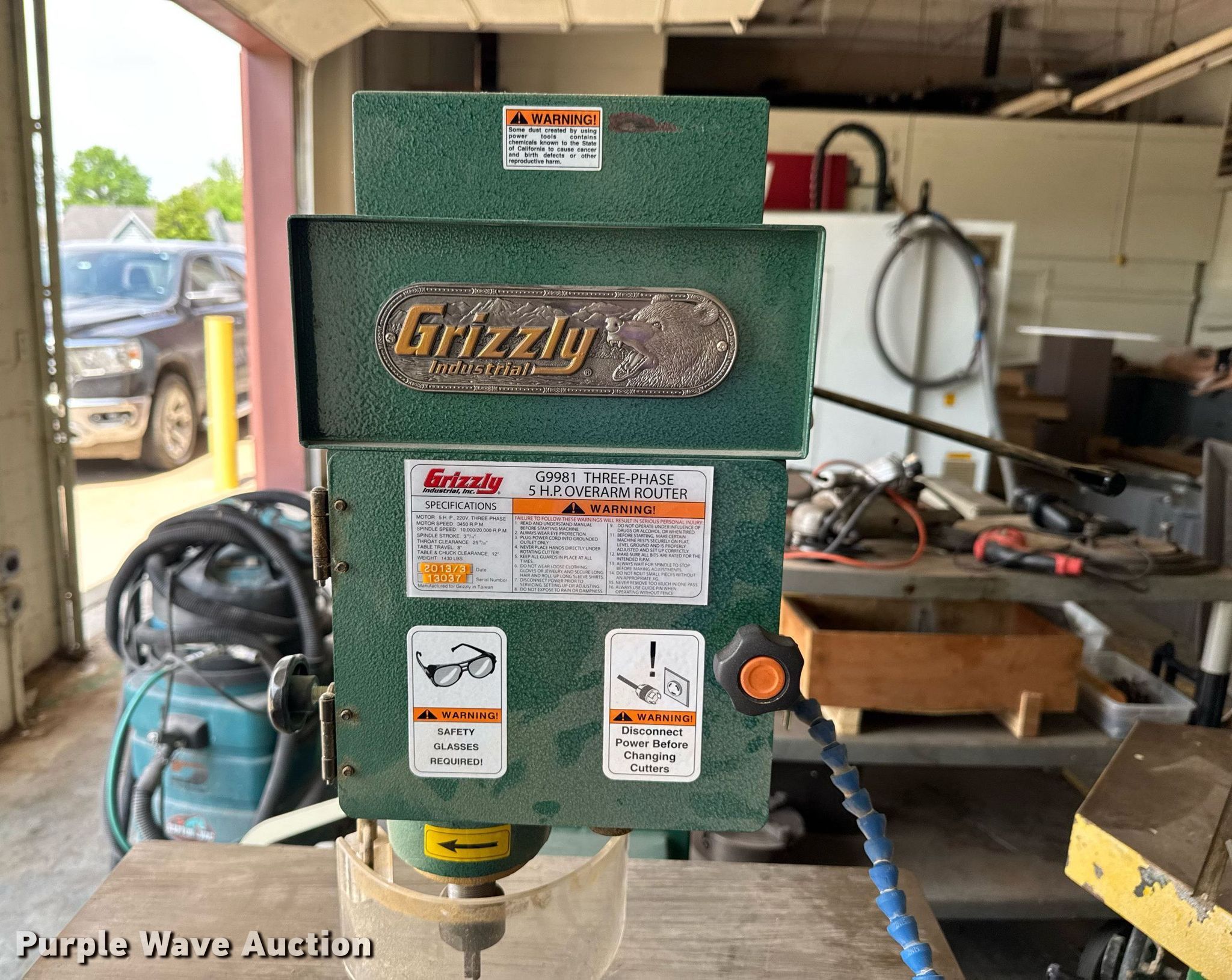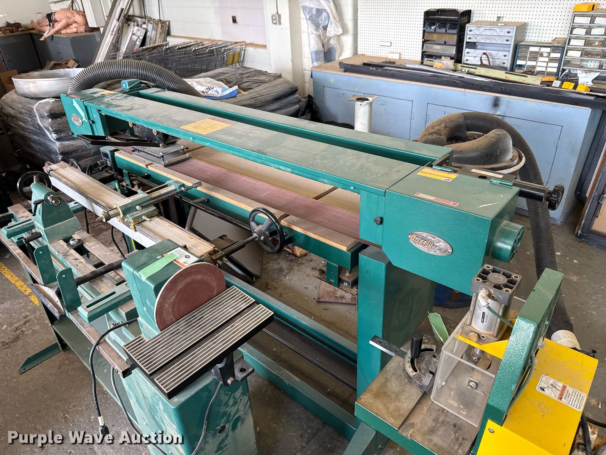 Purple Wave is selling a used Machine Shop Tools and Equip. in Kansas. This item is a Machine shop equipment with the following: Grizzly G9981 overarm router, Electric motor, Volts: 220, HP: 5, Phase: Three,, Woodtek 3-way router, Phase: Three, Grizzly G0568 24" band saw, Electric motor, Volts: 220, HP: 5, Phase: Single, Range: 1/4" to 1 1/2", Maximum cutting height: 16", Maximum width: 24 1.5", Grizzly 62891 wood lathe, Cutting depth: .2mm, Phase: Single, Grizzly G5394 Stroke Sander, HP: 3, Volts: 220, Phase: Single, Grizzly G4185 horizontal boring machine, Electric motor, Grizzly, Volts: 220, HP: 2, Phase: Single, Spindle travel: 3", Bit capacity: 9/16", Shop Fox W1833 Pocket Hole Machine, Volts: 120, HP: 1/2, Drill bit diameter: 3/8", Scroll saw, Volts: 115, HP: 1/8