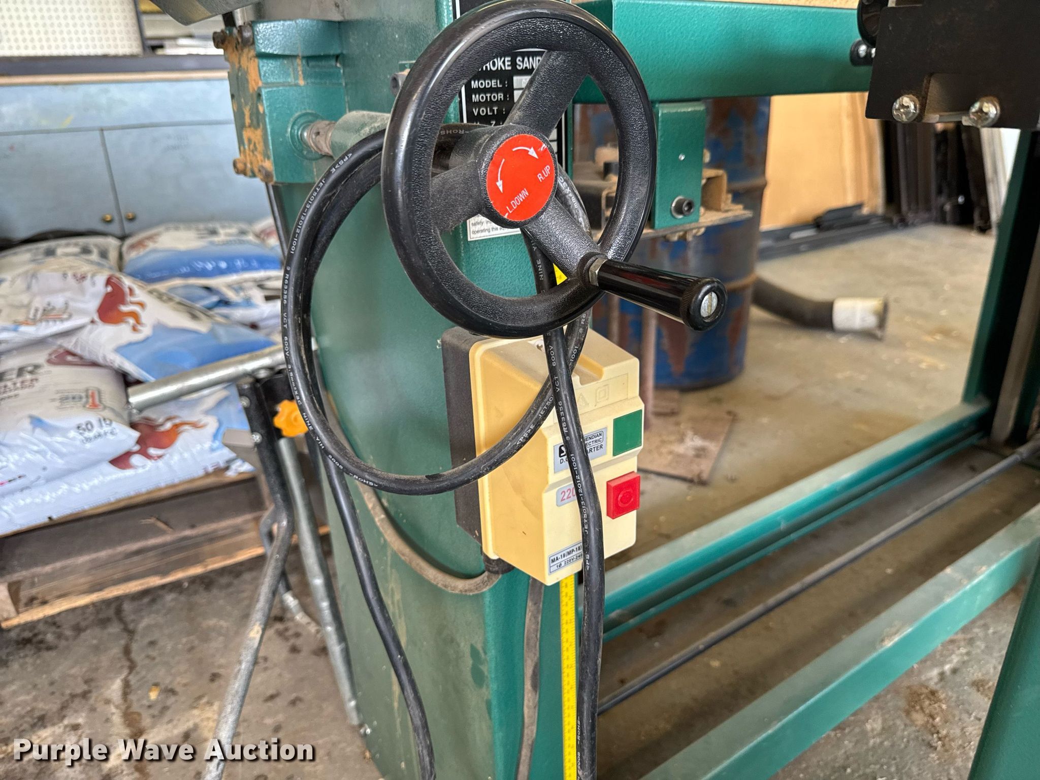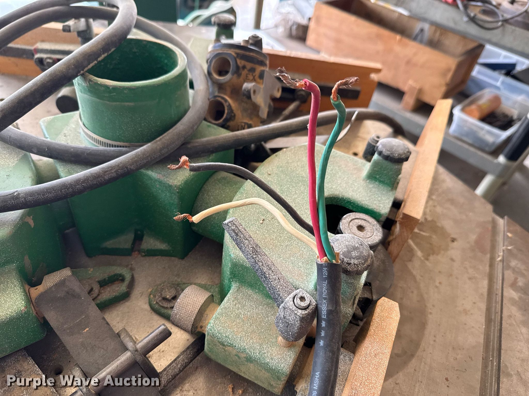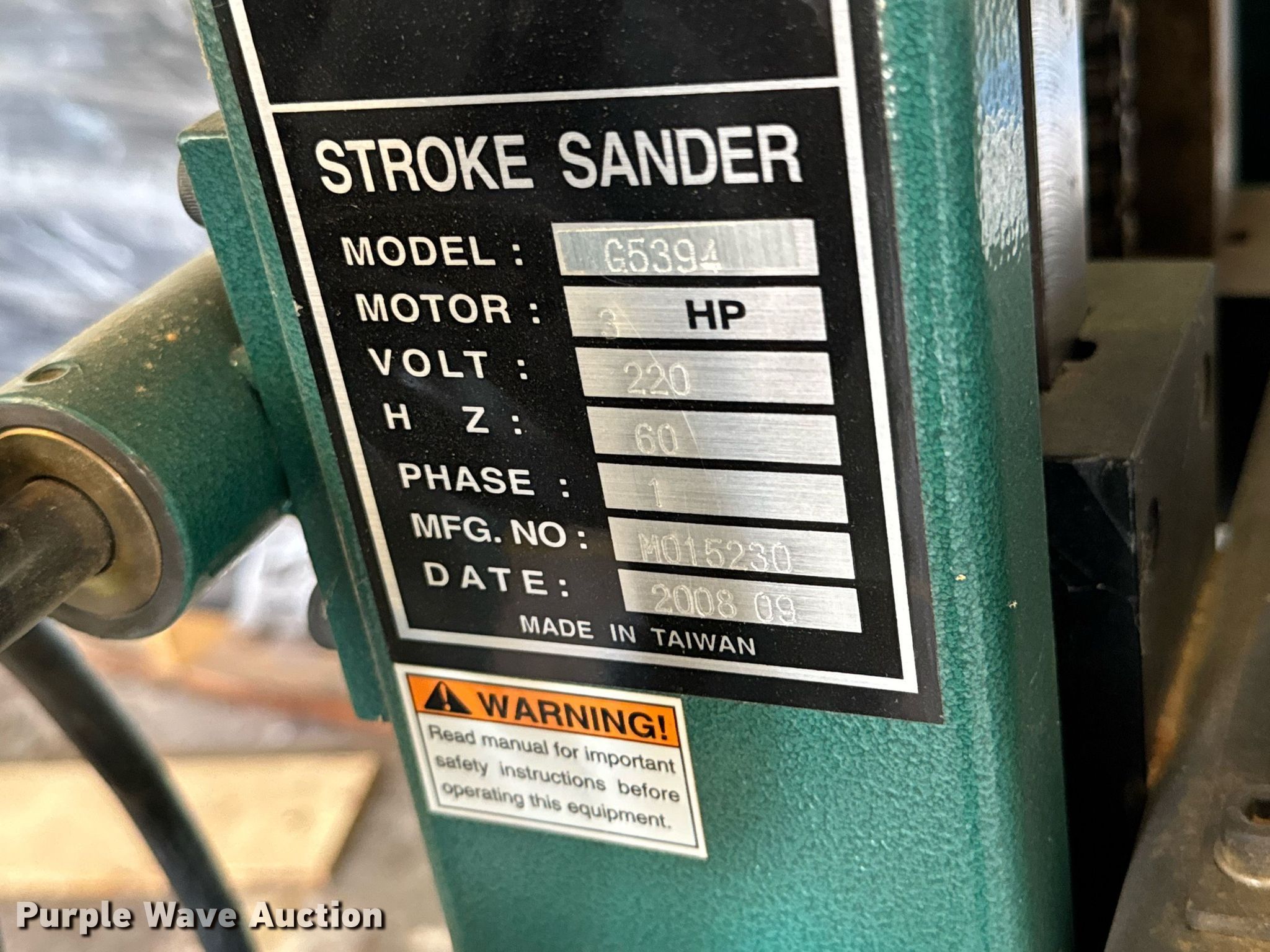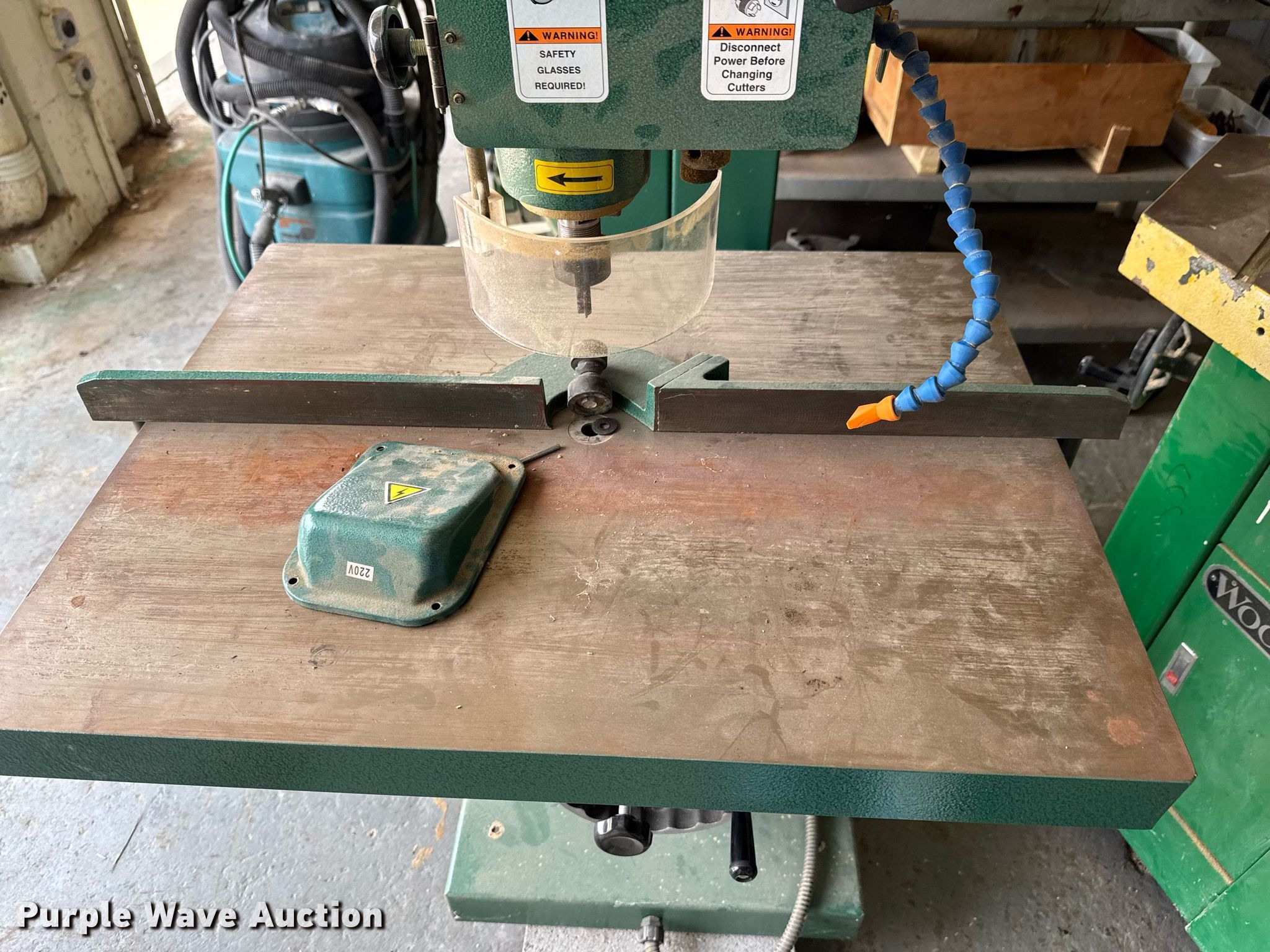 Purple Wave is selling a used Machine Shop Tools and Equip. in Kansas. This item is a Machine shop equipment with the following: Grizzly G9981 overarm router, Electric motor, Volts: 220, HP: 5, Phase: Three,, Woodtek 3-way router, Phase: Three, Grizzly G0568 24" band saw, Electric motor, Volts: 220, HP: 5, Phase: Single, Range: 1/4" to 1 1/2", Maximum cutting height: 16", Maximum width: 24 1.5", Grizzly 62891 wood lathe, Cutting depth: .2mm, Phase: Single, Grizzly G5394 Stroke Sander, HP: 3, Volts: 220, Phase: Single, Grizzly G4185 horizontal boring machine, Electric motor, Grizzly, Volts: 220, HP: 2, Phase: Single, Spindle travel: 3", Bit capacity: 9/16", Shop Fox W1833 Pocket Hole Machine, Volts: 120, HP: 1/2, Drill bit diameter: 3/8", Scroll saw, Volts: 115, HP: 1/8
