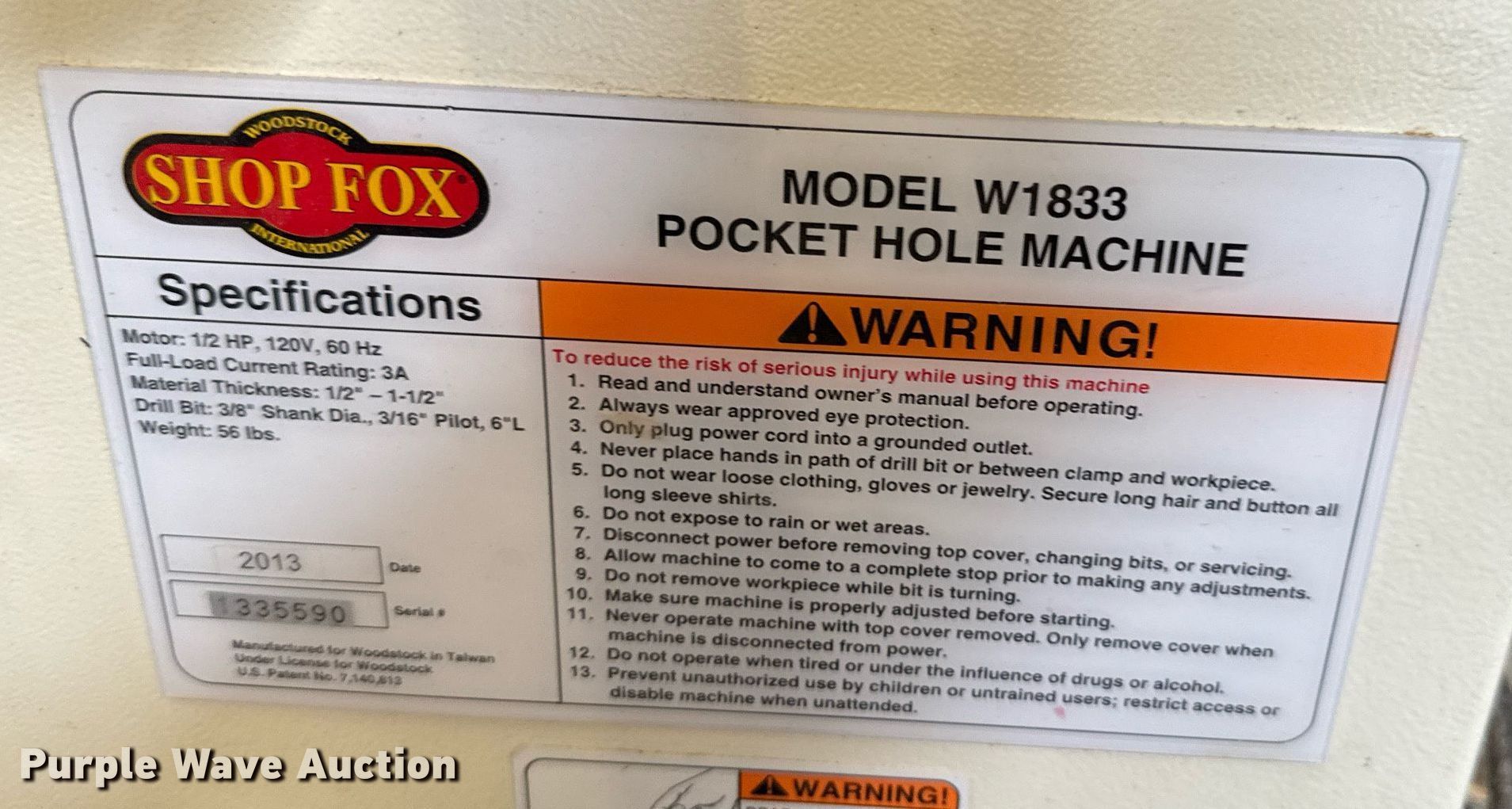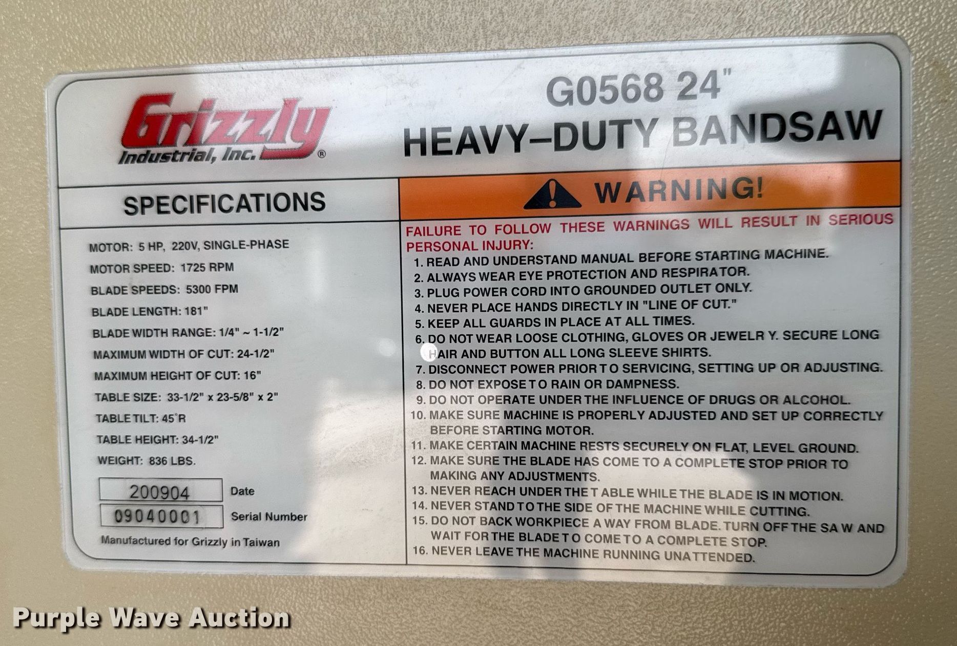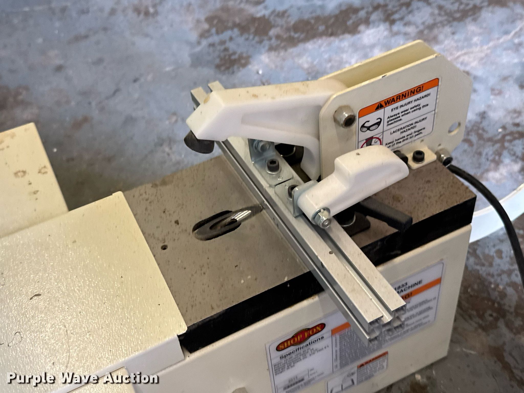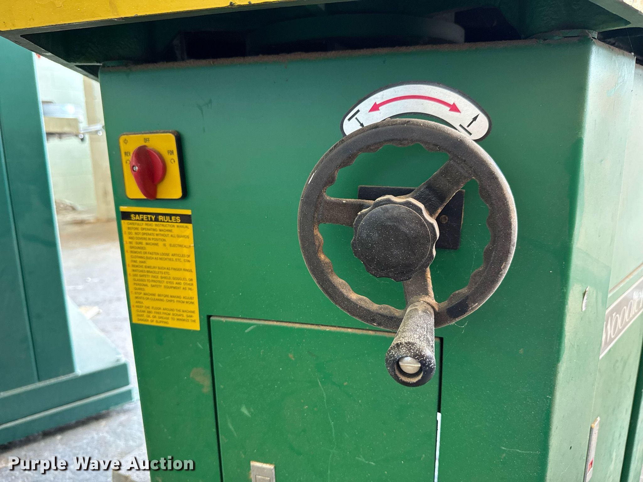 Purple Wave is selling a used Machine Shop Tools and Equip. in Kansas. This item is a Machine shop equipment with the following: Grizzly G9981 overarm router, Electric motor, Volts: 220, HP: 5, Phase: Three,, Woodtek 3-way router, Phase: Three, Grizzly G0568 24" band saw, Electric motor, Volts: 220, HP: 5, Phase: Single, Range: 1/4" to 1 1/2", Maximum cutting height: 16", Maximum width: 24 1.5", Grizzly 62891 wood lathe, Cutting depth: .2mm, Phase: Single, Grizzly G5394 Stroke Sander, HP: 3, Volts: 220, Phase: Single, Grizzly G4185 horizontal boring machine, Electric motor, Grizzly, Volts: 220, HP: 2, Phase: Single, Spindle travel: 3", Bit capacity: 9/16", Shop Fox W1833 Pocket Hole Machine, Volts: 120, HP: 1/2, Drill bit diameter: 3/8", Scroll saw, Volts: 115, HP: 1/8