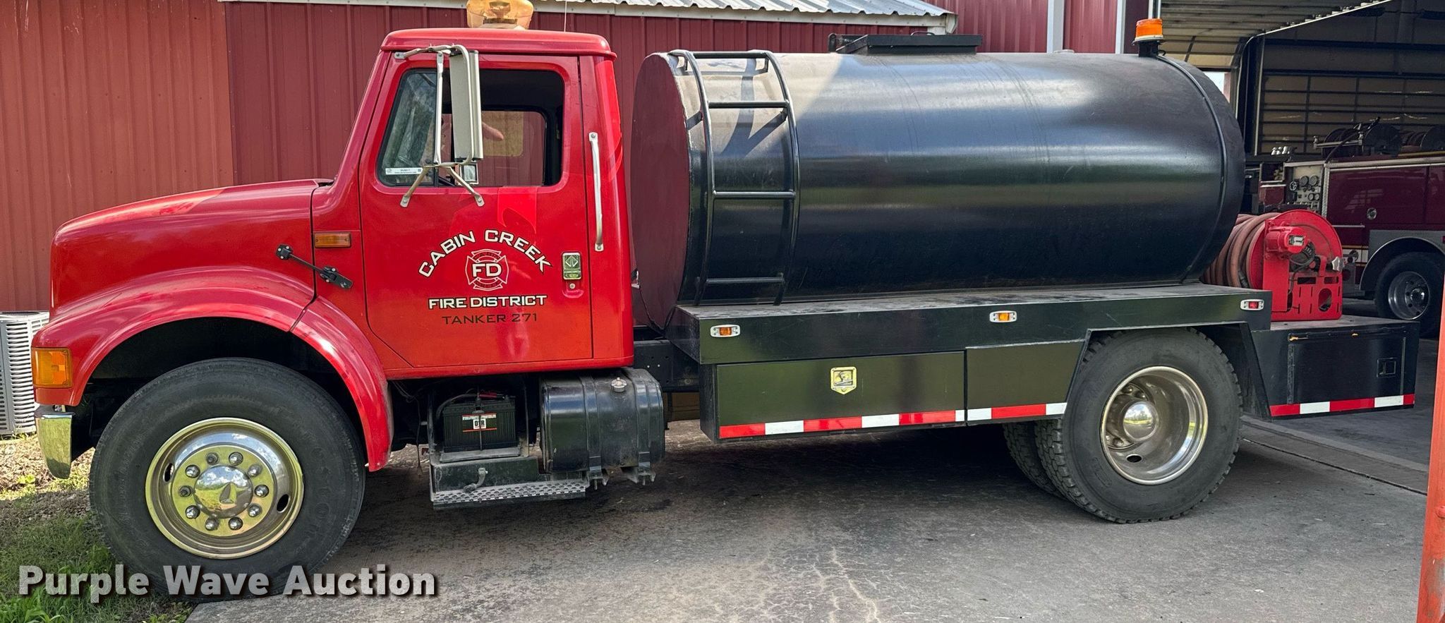 1997 International 4700 water truck. Miles: 146,366 on odometer, VIN: 1HTSCAAP4VH471923. Engine International DT466, Displacement: 7.6L, Cylinders: 6, Fuel type: Diesel. Transmission Automatic. Chassis Axles: Single, Suspension: Spring, Brakes: Hydraulic, GVWR: 33,000 lbs, Wheelbase: 218". Interior AC, Heat, Cruise control, Auxiliary controls. Features Bed / tank 12' 6" L x 100" W, Rear discharge, Hose reel, Top fill, Rear drain: 3", Tank capacity: Approx. 1,500 gallons, Pump Get Fire Pumps MFG Engine Honda, Cylinders: 2, HP: 18, Fuel type: Gas.. Tires Size: 11R22.5. Notes Dead battery. Oklahoma title. Title distribution may be delayed up to 14 days from verification of funds. Cabin Creek Fire District. Vinita, OK 74301