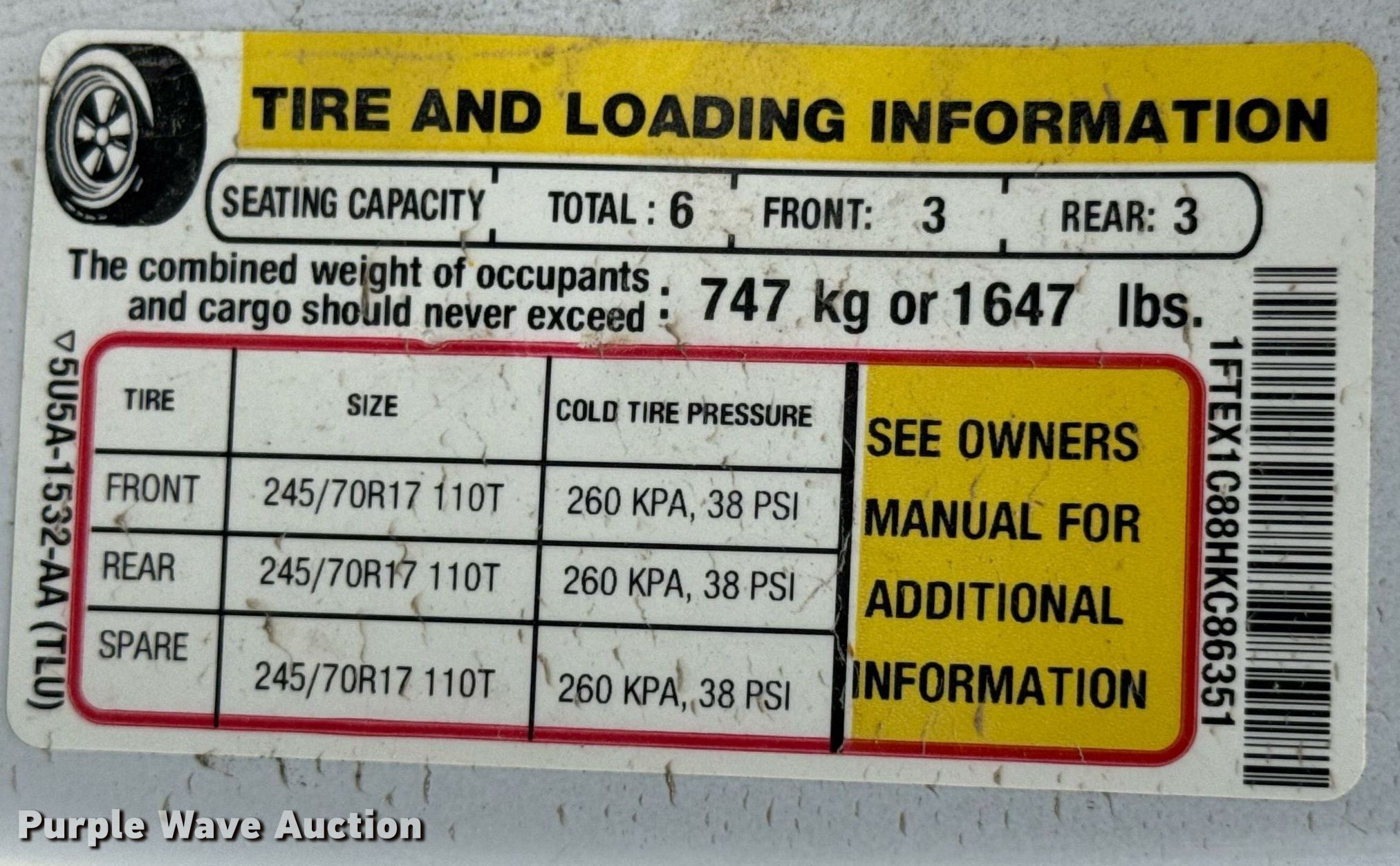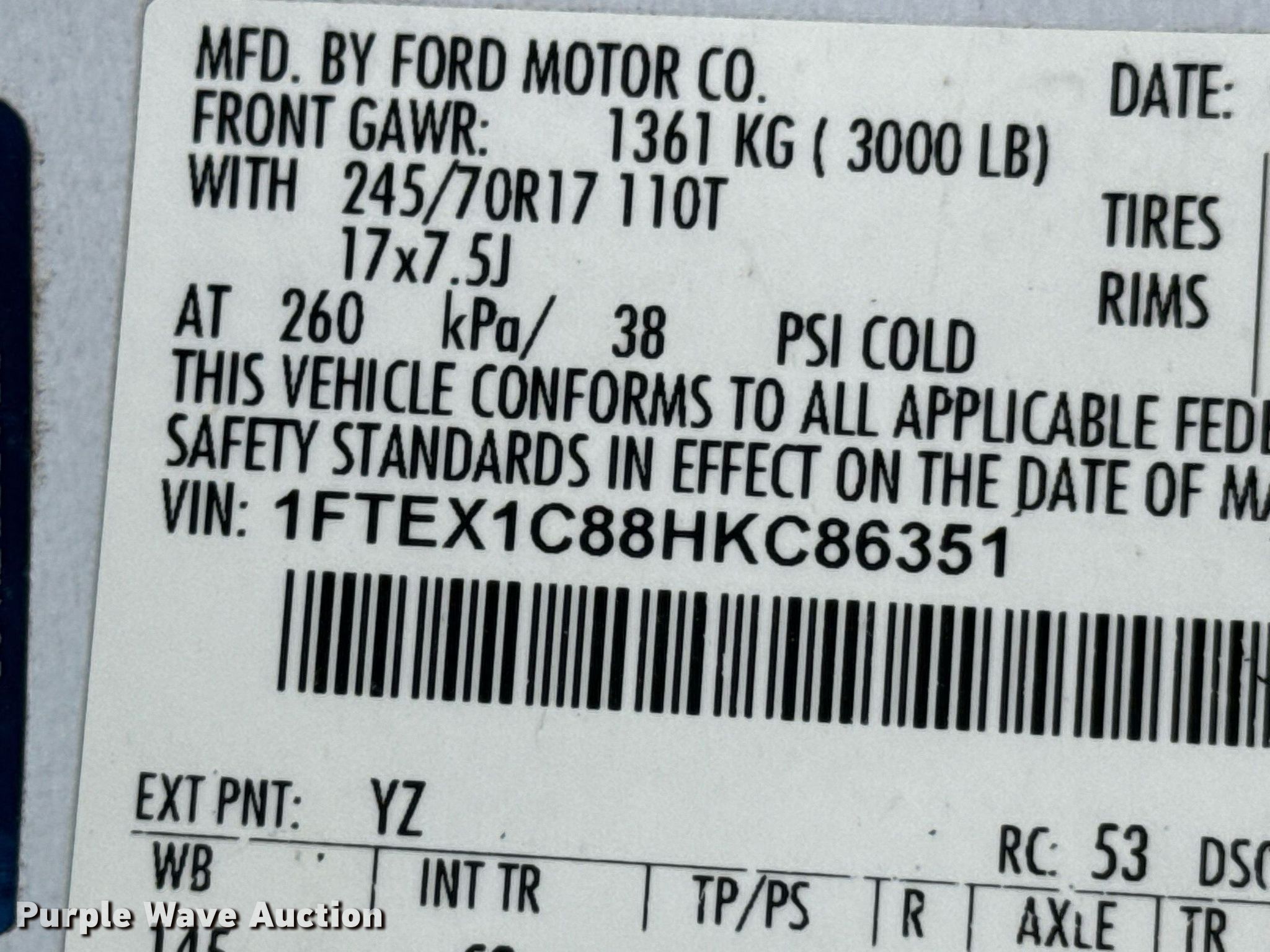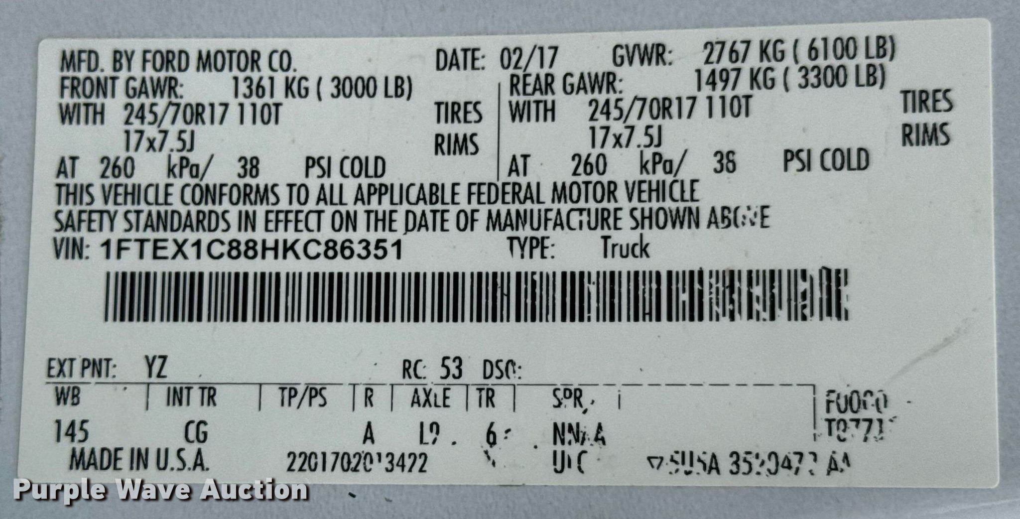 2017 Ford F150 XL SuperCab pickup truck. Miles: 110,078 on odometer, VIN: 1FTEX1C88HKC86351. Engine Displacement: 3.5L V6 DOHC, Cylinders: 6, Fuel type: Gas. Transmission Automatic. Interior AC, Heat. Tires Size: LT245/70R17. Kansas title. Title distribution may be delayed up to 14 days from verification of funds. City of Chanute, KS. Chanute, KS 66720