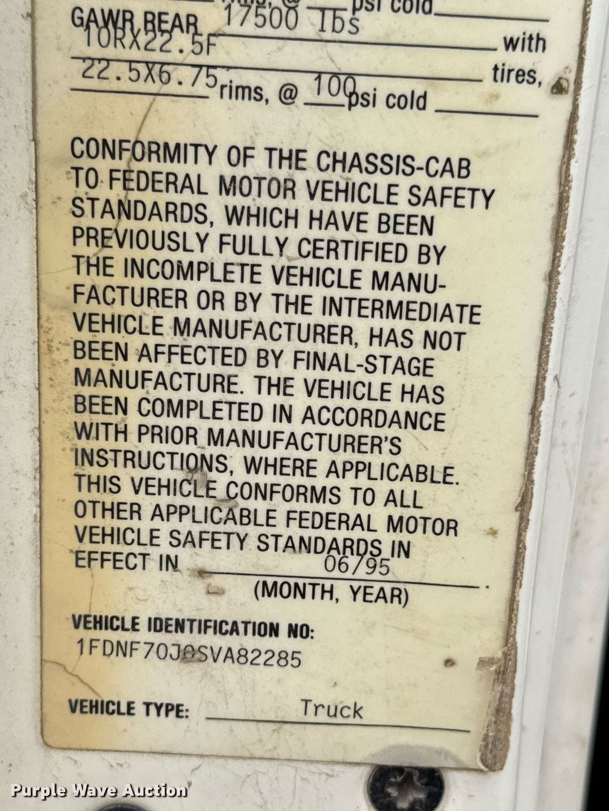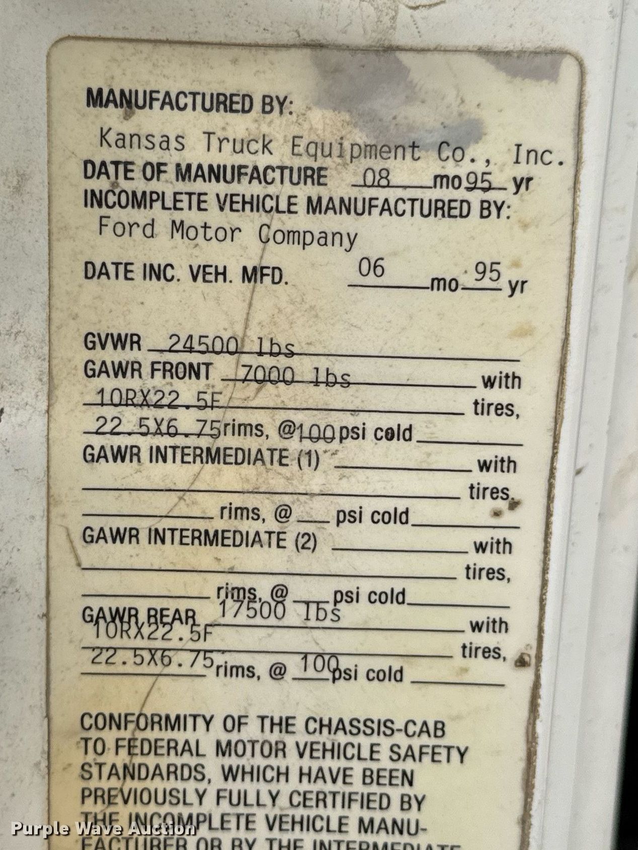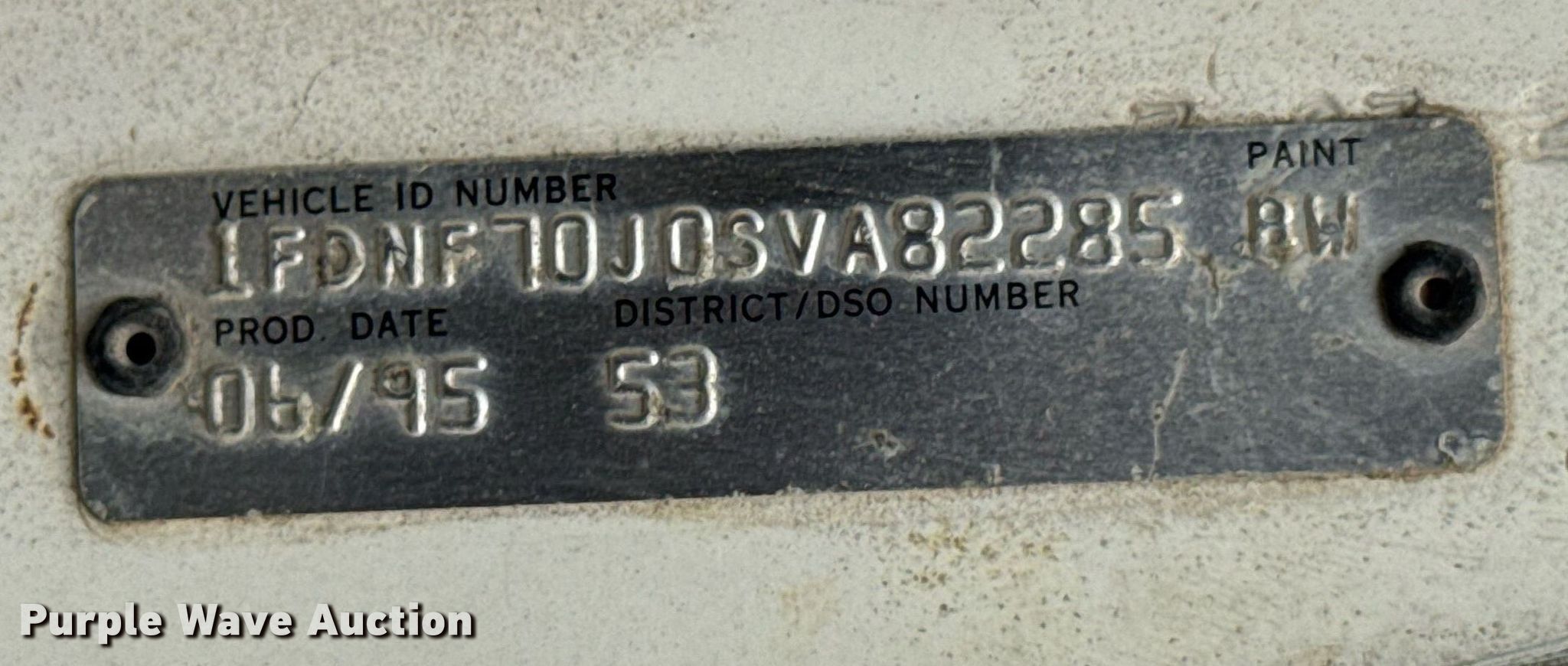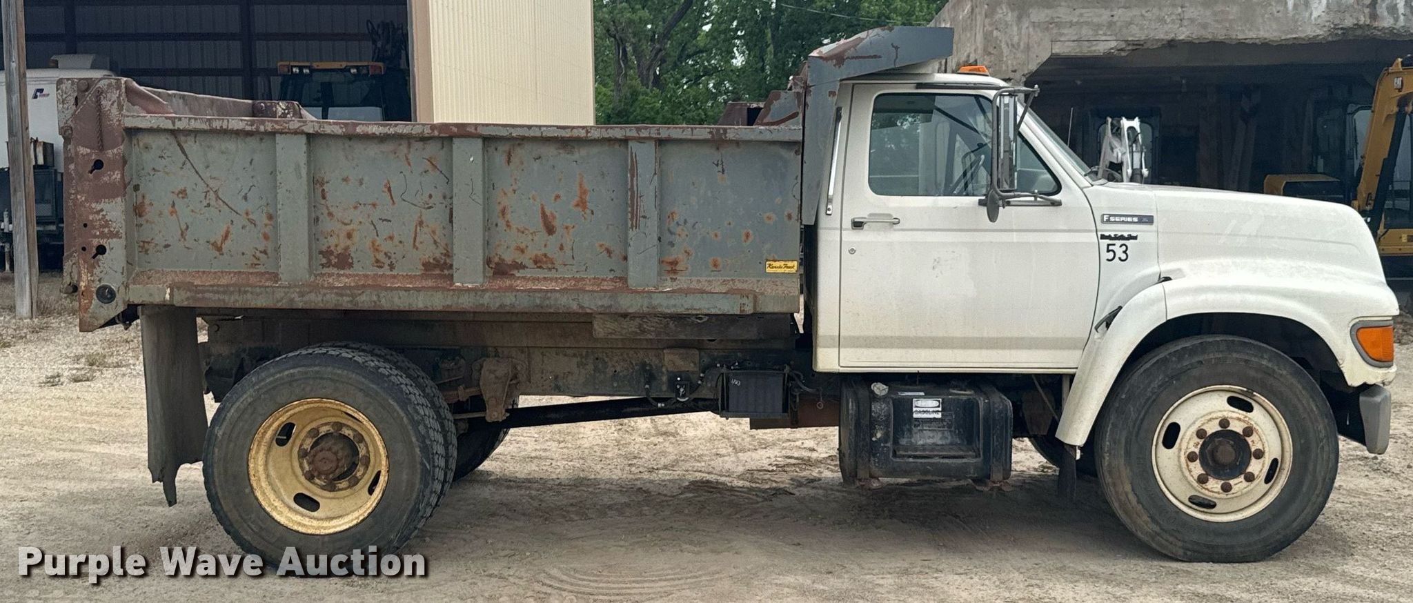 1995 Ford F700 dump truck. Miles: 86,087 on odometer, VIN: 1FDNF70J0SVA82285. Engine Ford, Displacement: 7.0L, Cylinders: 8, Fuel type: Gas. Transmission Manual, Speed: 5. Chassis Axles: Single, Suspension: Spring, Brakes: Hydraulic, PTO, GVWR: 24,500 lbs FAWR: 7,000 lbs, RAWR: 17,500 lbs, Wheelbase: 153". Interior AC, Heat. Features Dump bed Warren, 10' L x 96" W, Side height: 32", Bed type: Steel, Ram: Single, End gate: Air operated. Tires Size: 10R22.5. Kansas title. Title distribution may be delayed up to 14 days from verification of funds. City of Chanute, KS. Chanute, KS 66720