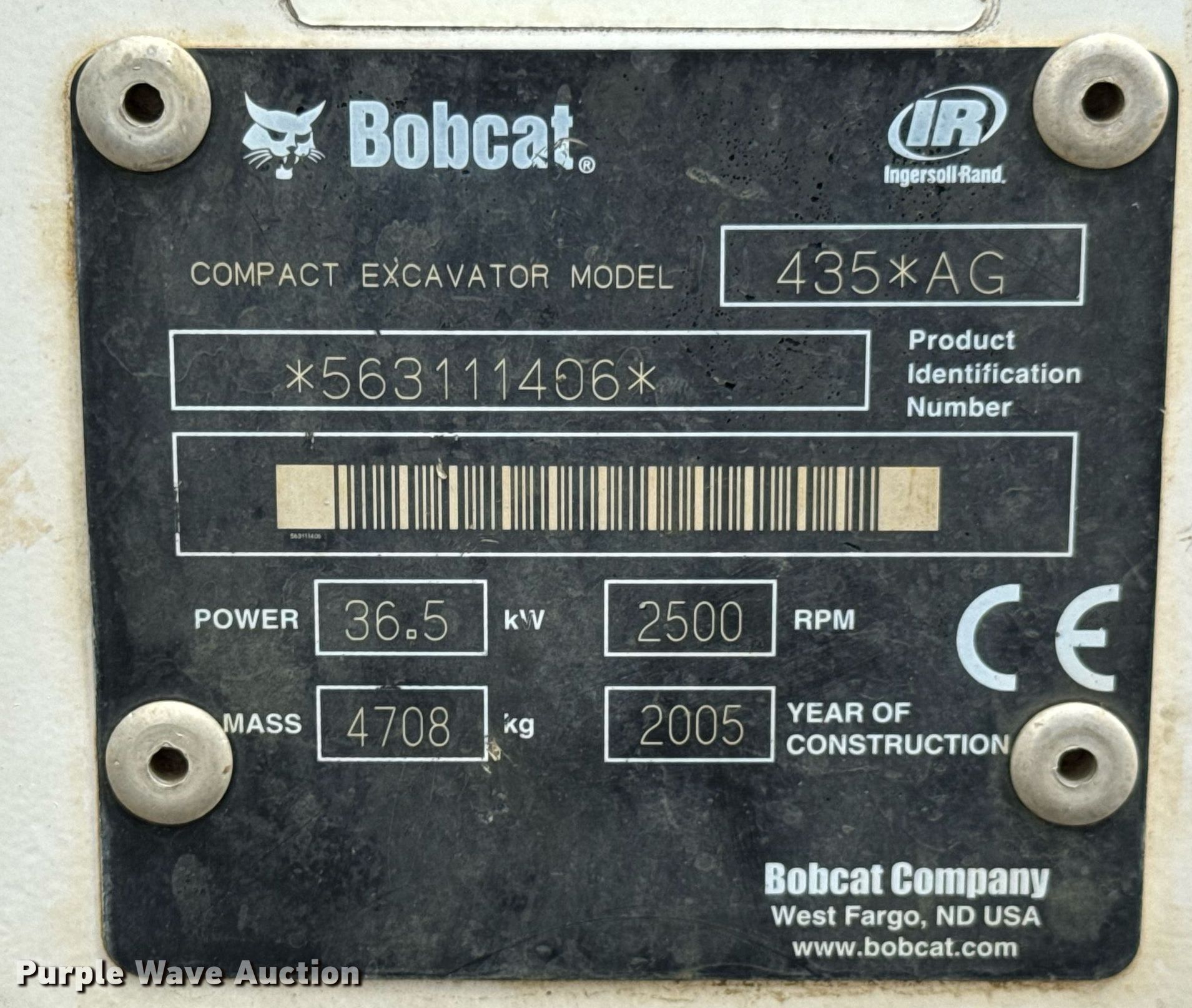 Purple Wave is selling a used Mini Excavator in Kansas. This item is a 2005 Bobcat 435 mini excavator with the following: Hours: 3,122 on meter, Serial: 563111406