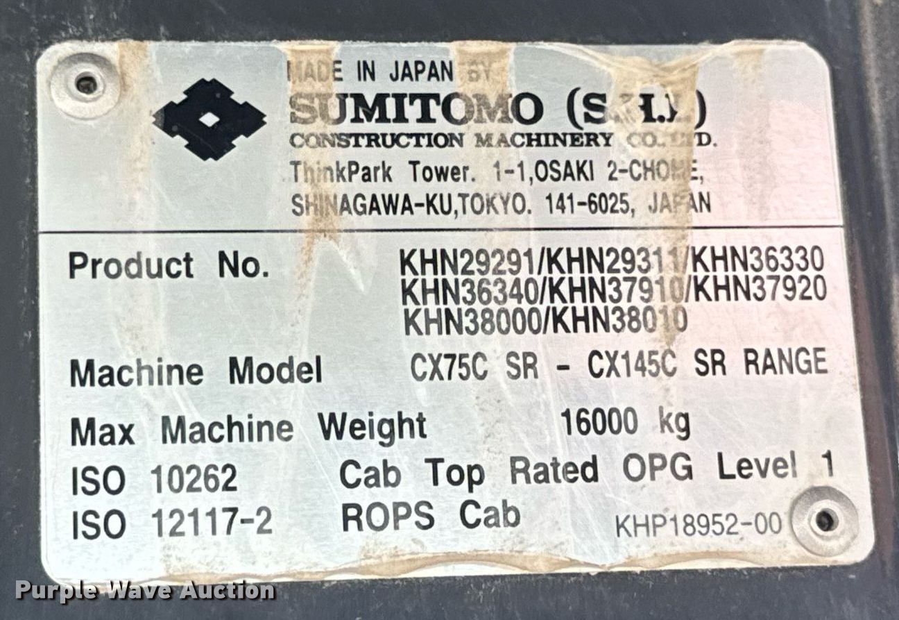 2016 Case CX75C SR mini excavator. Hours: 4,536 on meter, Serial: DAC075K6NGS6A1235, Unit #: 358. Engine Isuzu AP-4LE2X, Serial: 4LE2-641004, Cylinders: 4, Fuel type: Diesel. Transmission Hydrostatic, Two speed travel. Operators station Enclosed cab, AC, Heat. Features Backfill blade Width: 91", Boom Knuckle, Stick Stick length: 69", Quick coupler: Hydraulic JRB, Bucket CP, Width: 24", Teeth: 5. Tracks Width: 18", Steel, Grouser pads: Triple, Track pads: Rubber. Item unavailable for removal until June 20, 2025. City of Kirksville. Kirksville, MO 63501