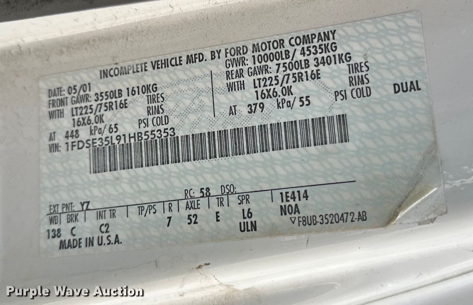 2001 Ford E350 Super Duty delivery truck. Miles: 16,689 on odometer, VIN: 1FDSE35L91HB55353, Unit #: 4431. Engine Displacement: 5.4L, Cylinders: 8, Fuel type: Gas. Transmission Automatic. Chassis Axles: Single, Suspension: Spring, Brakes: Hydraulic, GVWR: 10,000 lbs. Interior AC, Heat. Features Box bed 12' 6" L x 7' 11" W x 7' 2" H, Floor: Wood. Tires Size: 225/75R16. Minnesota title. Title distribution may be delayed up to 14 days from verification of funds. City of Blaine. Blaine, MN 55449