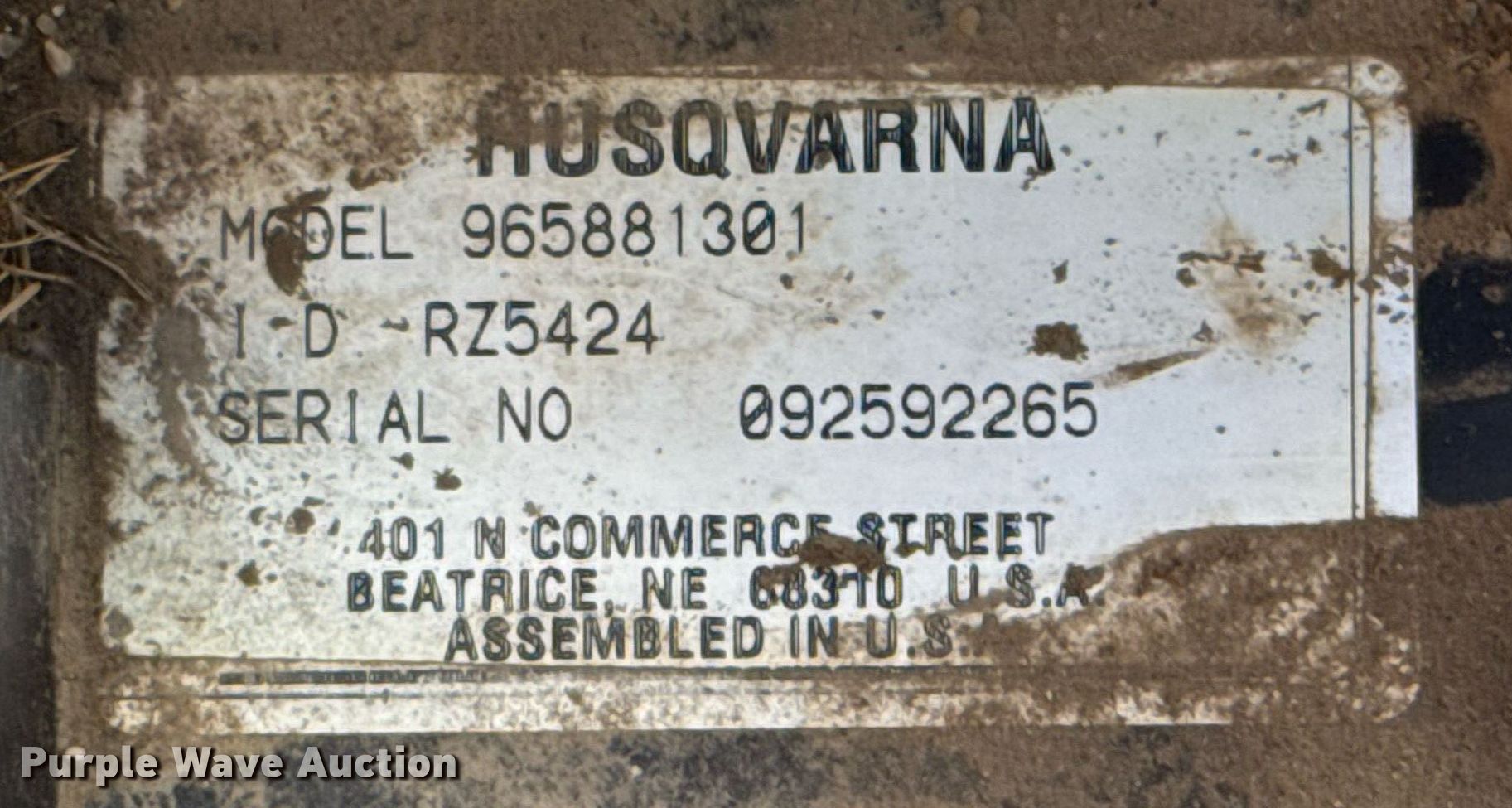 Purple Wave is selling a used Lawn Mower in Kansas. This item is a 2009 Husqvarna RZ5424 ZTR lawn mower with the following: Hours: 290 on meter, Cutting width: 54", Serial: 092592265