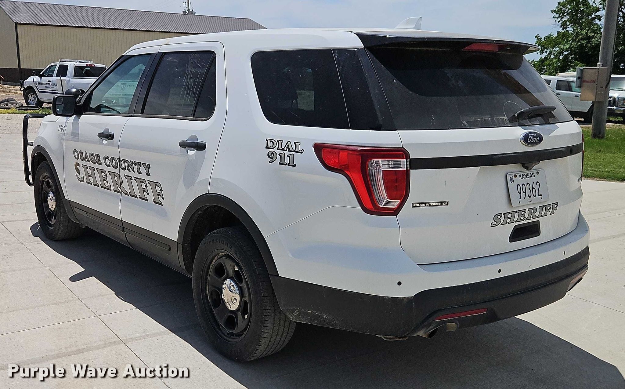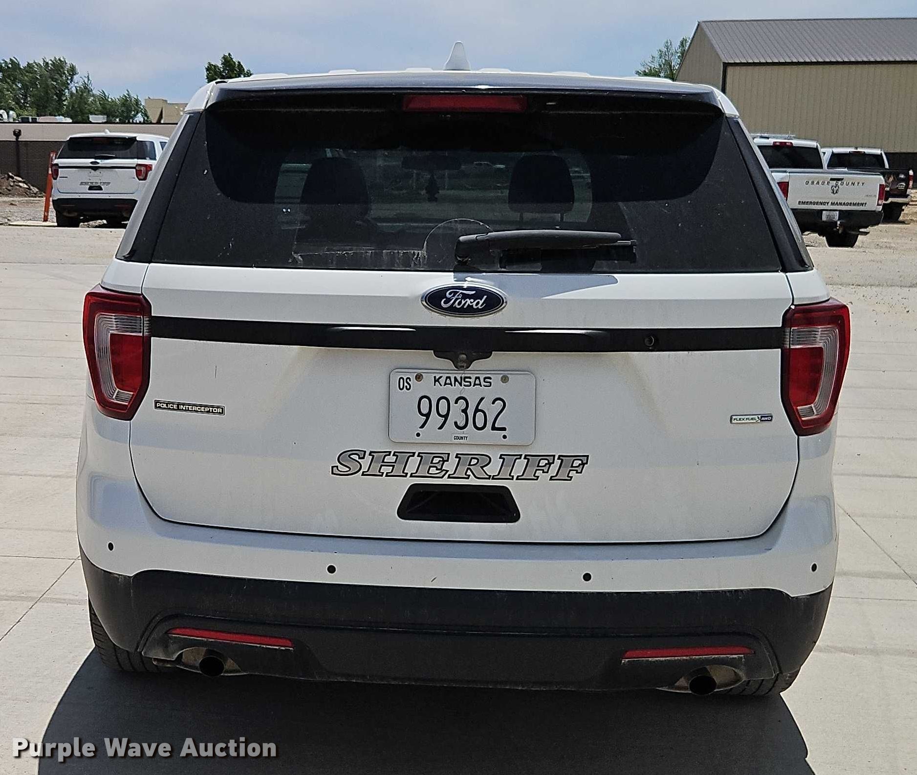 2017 Ford Explorer Police Interceptor. Miles: 162,339 on odometer, VIN: 1FM5K8AR3HGD58428. Engine Displacement: 3.7L V6 SOHC, Cylinders: 6, Fuel type: Gas. Transmission Automatic, All wheel drive. Interior AC, Heat, Seat: Power driver, Heated mirrors, Power windows, Power locks, Cruise control, Backup camera. Tires Size: 245/55R18. Notes Center console missing. Kansas title. Title distribution may be delayed up to 14 days from verification of funds. Osage County Sheriff. Lyndon, KS 66451