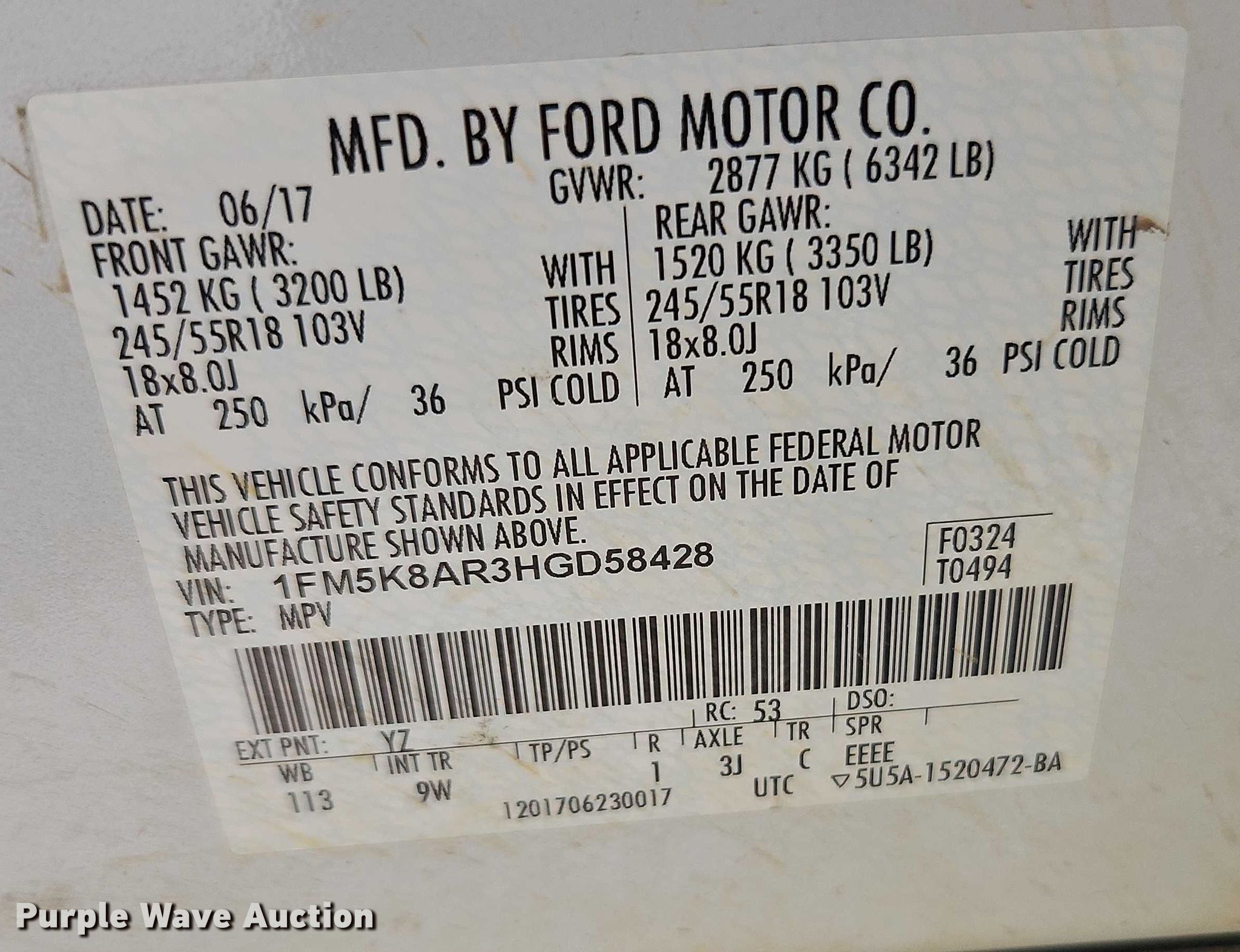 - VIN: 1FM5K8AR3HGD58428